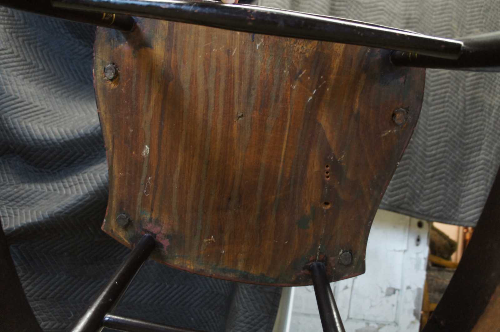 Antique 19th century Boston rocker. Features a black painted finish with hand stencilled fruit and flower deisgns. Includes a contoured rail over a pierced splat and lower rail over spindles leading to scrolled arms and a shaped seat.