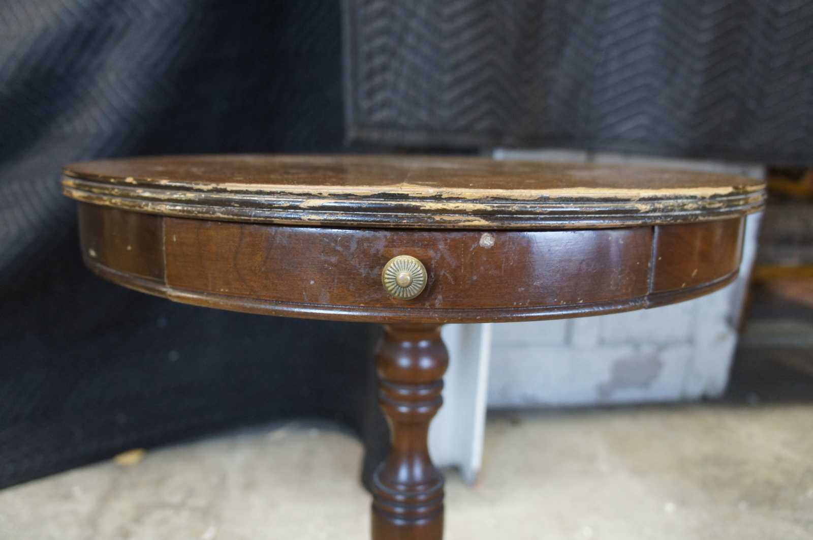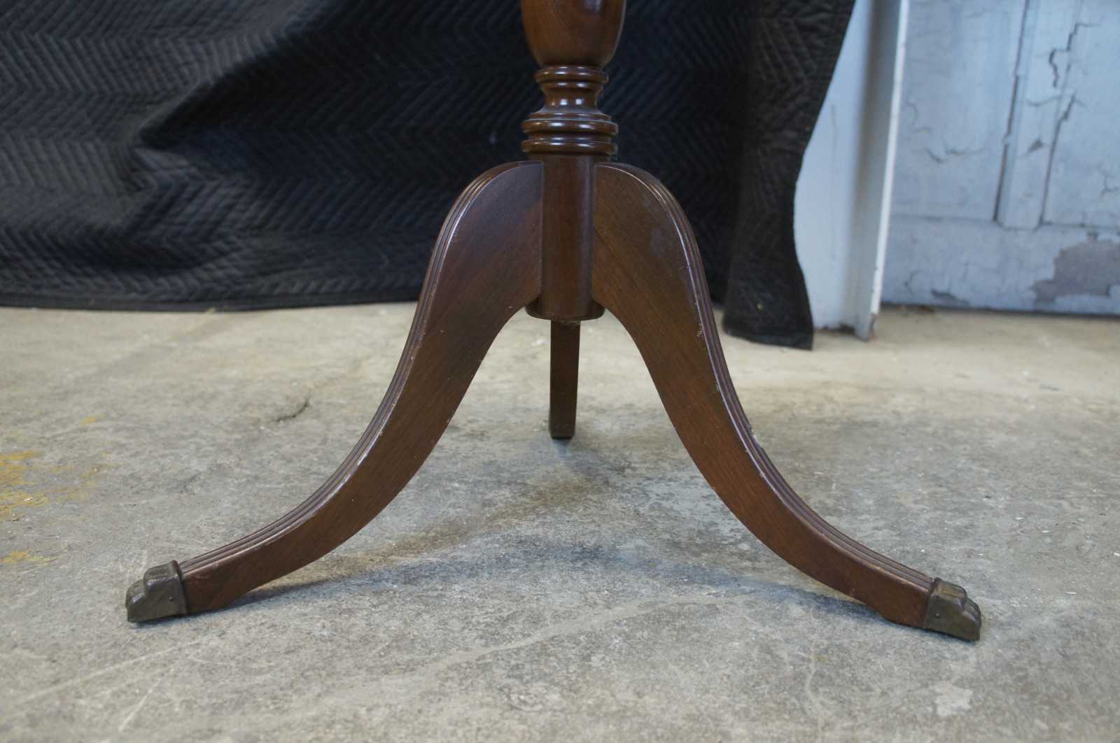Antique mahogany side pedestal table. Duncan Phyfe styling featuring a round crotch mahogany top with small drawer, turned column and tripod base with fluting and brass capped feat.