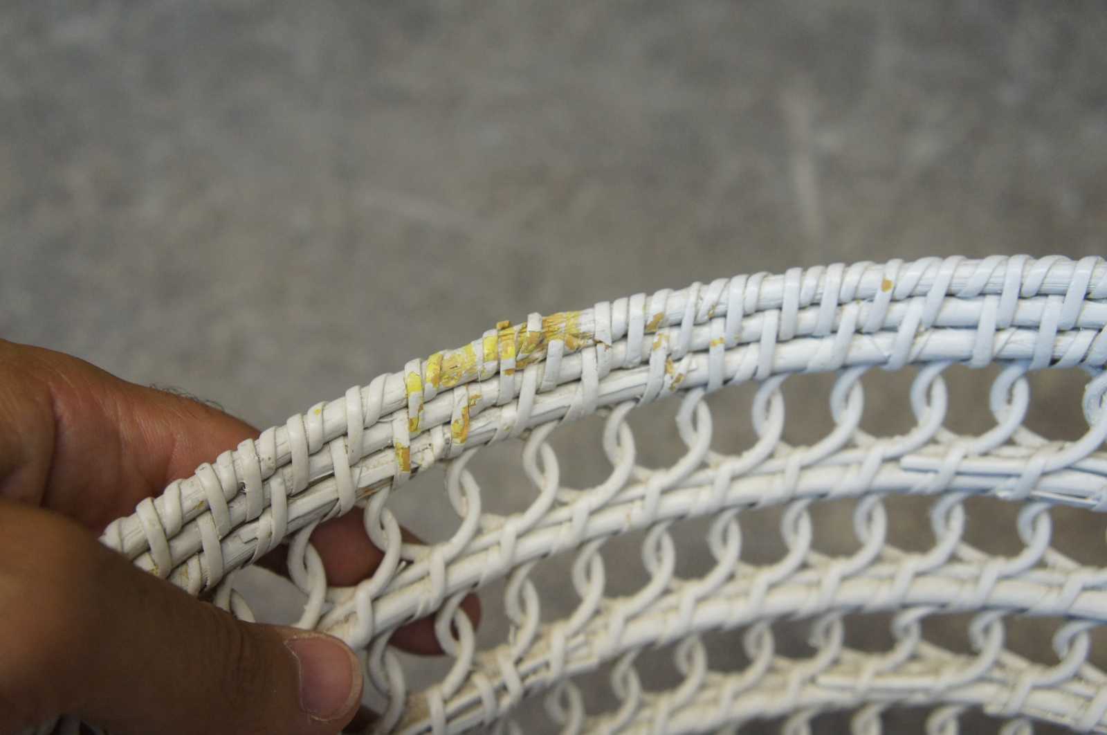 Vintage wicker and rattan waste basket or trash receptacle. Features and geometric circular looping design that tapers from top to bottom.