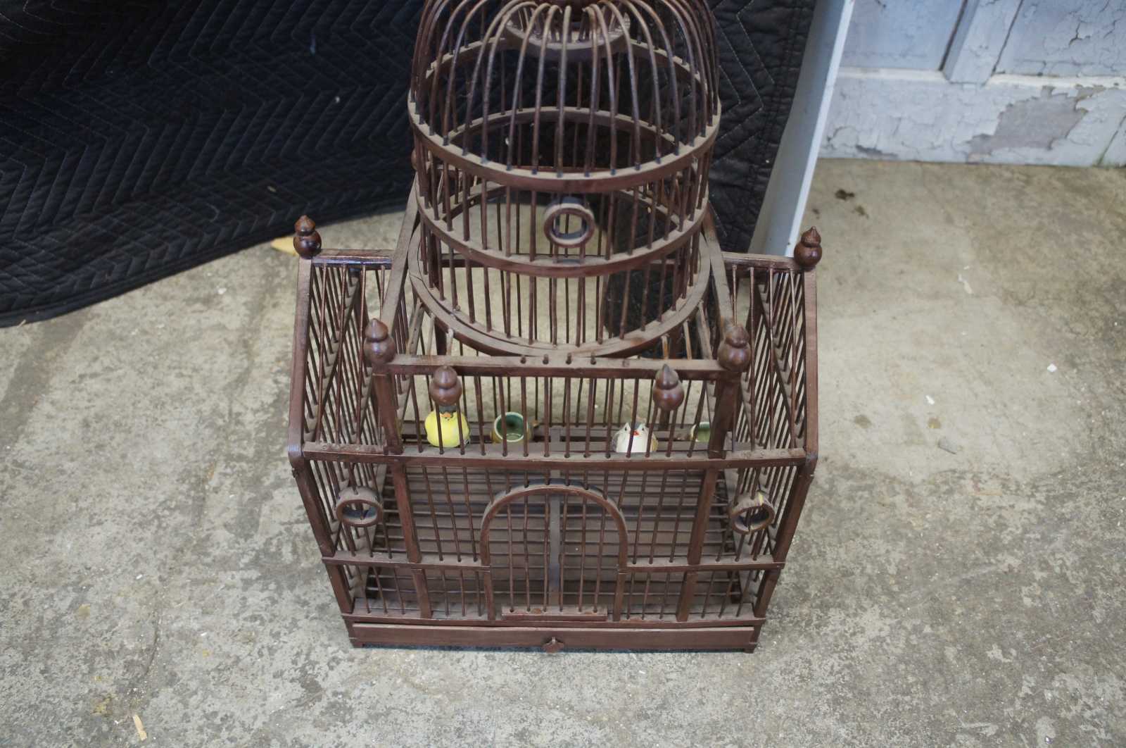 Victorian revival bird cage featuring a domed top, circular windows and turned finials. Includes two faux birds and two ceramic feeder bowls.