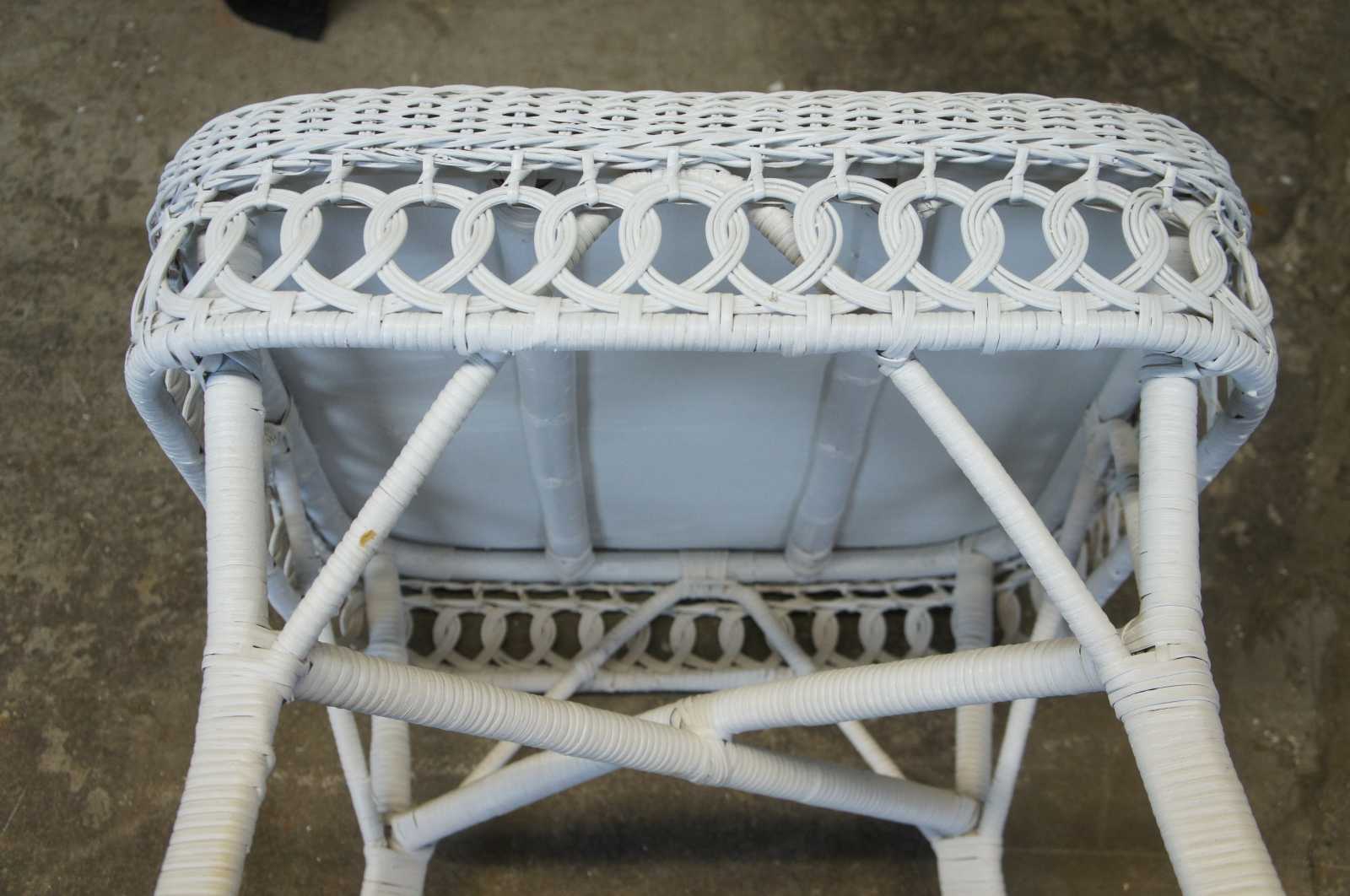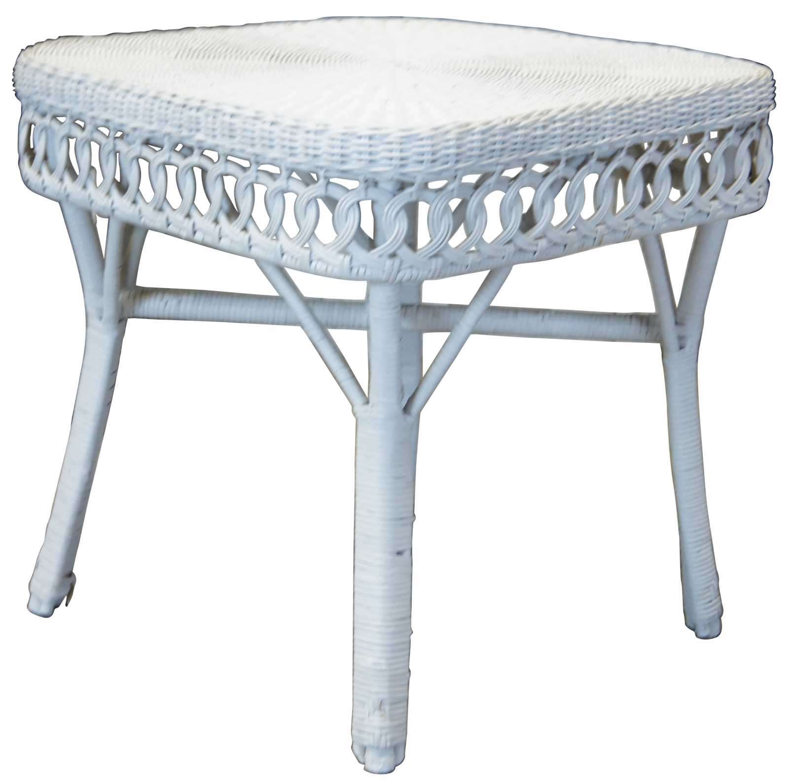 Pair of two vintage white wicker, rattan and bamboo side tables featuring glass tops and interlocking rattan loop design.