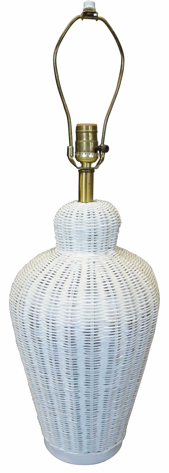 Vintage white wicker urn shaped table lamps.