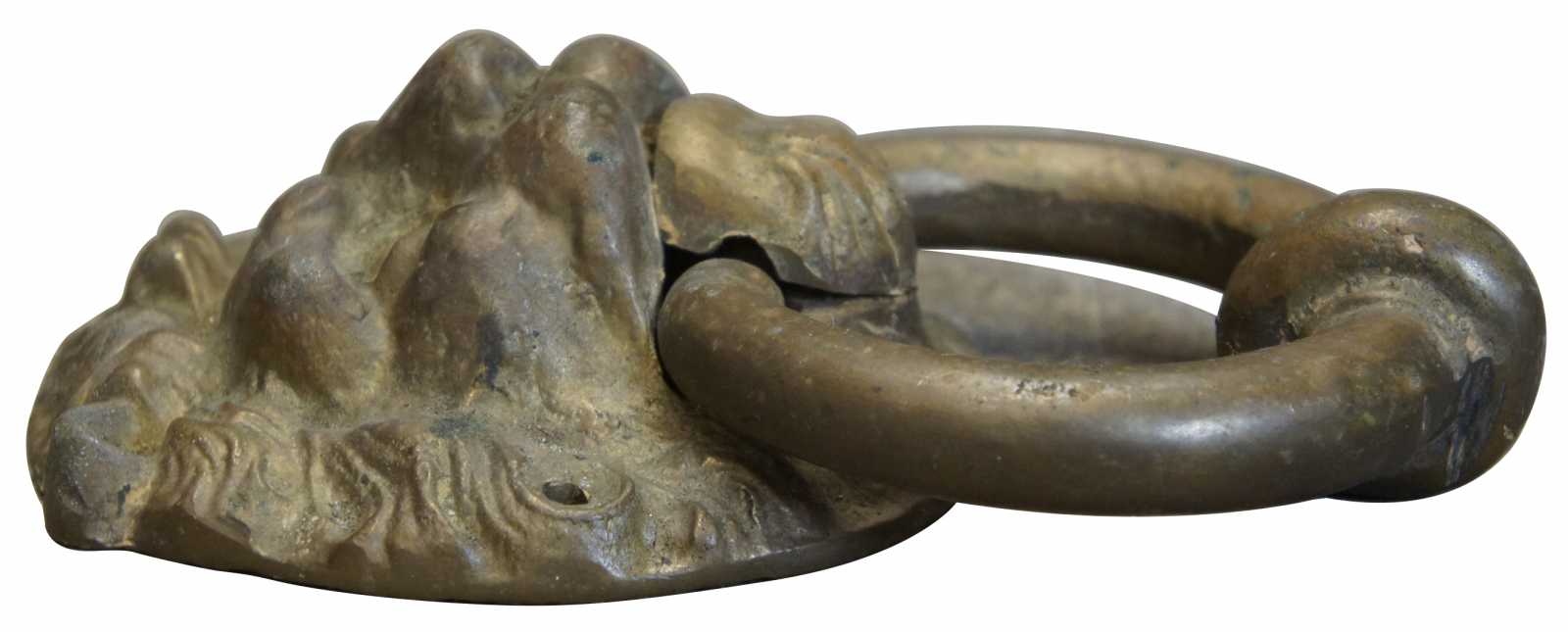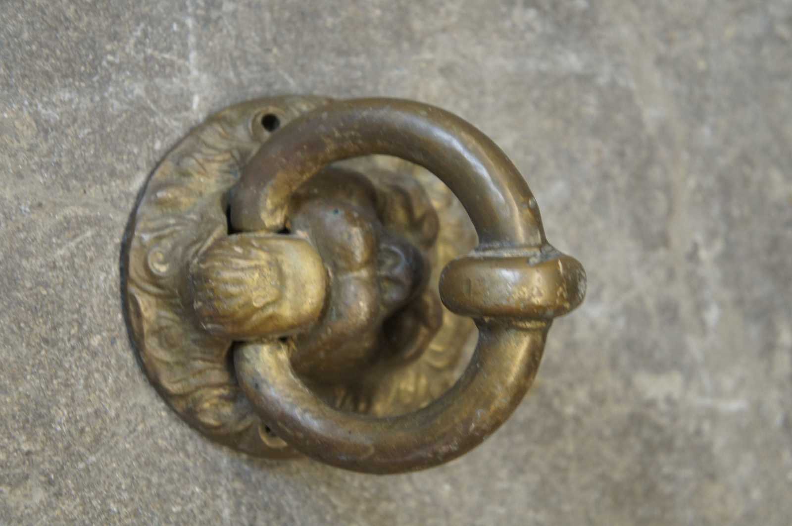 Vintage Victorian revival bronze lion head door knocker hardware.