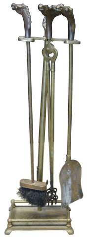 Vintage brass equestrian horse motif fire tools. Features sweeper, poker, tongs, shovel and stand.