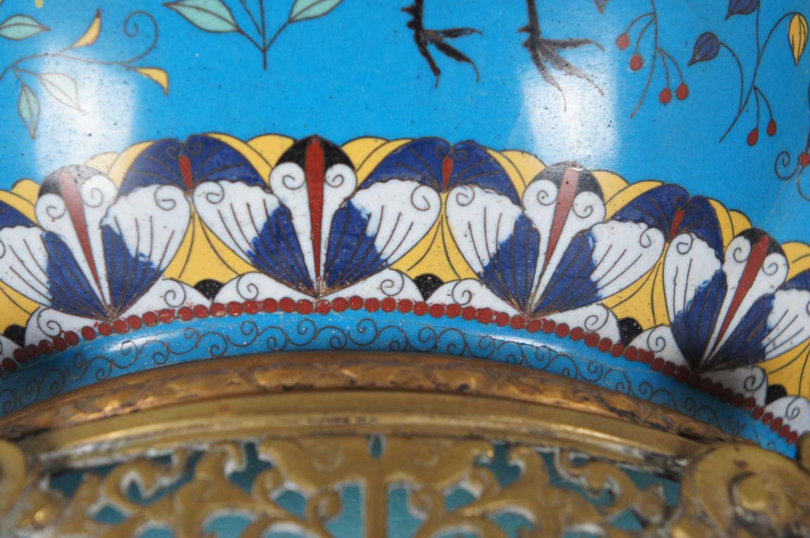 A monumental late 19th century Cloisonné jardiniere or urn with a lobed melon form body decorated with flowers and cranes on a blue ground, footed and handled with French bronze figures and pierced designs.