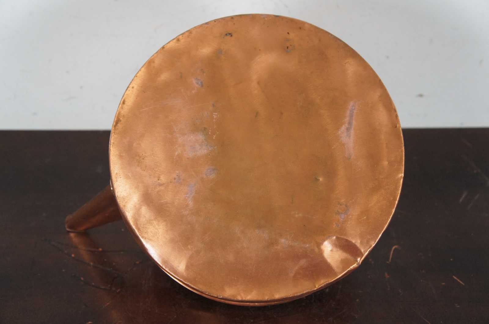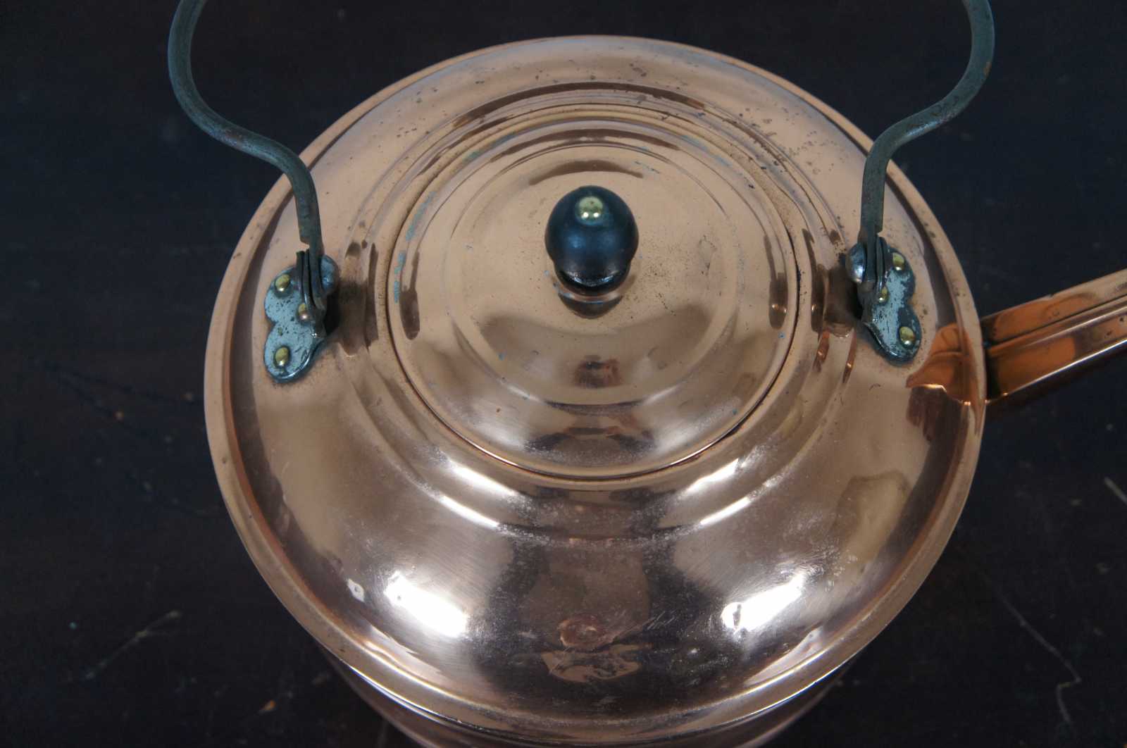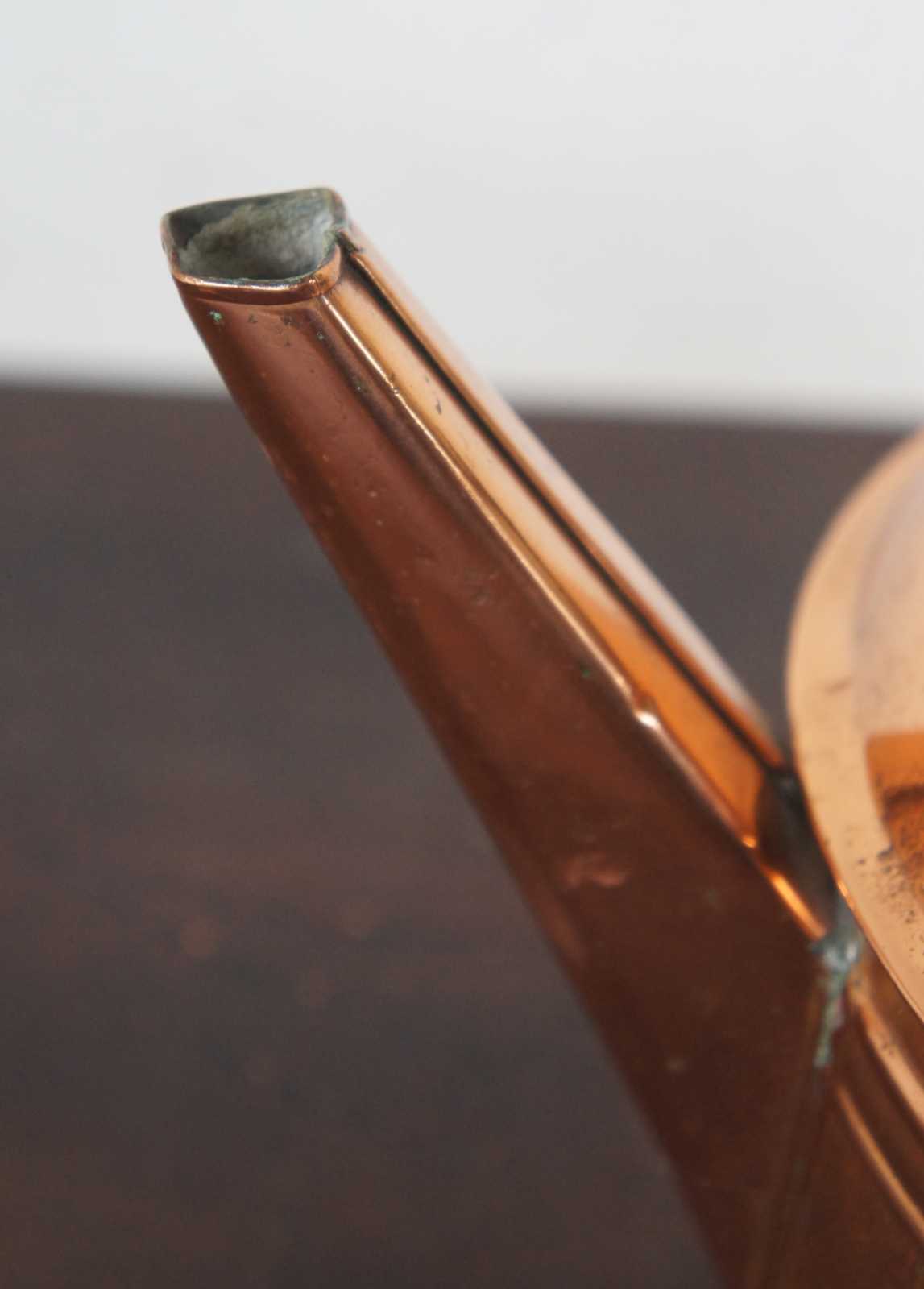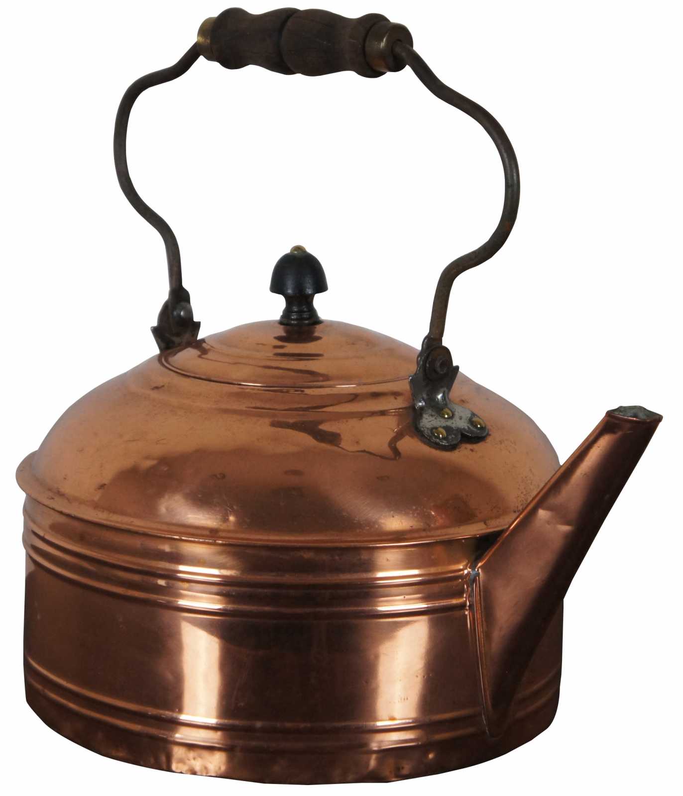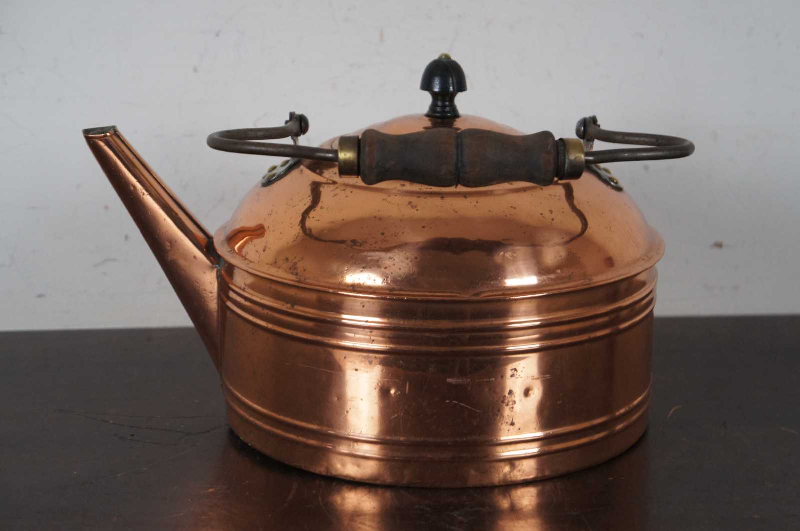 Very shiny antique copper tea kettle with straight spout and wood handle.