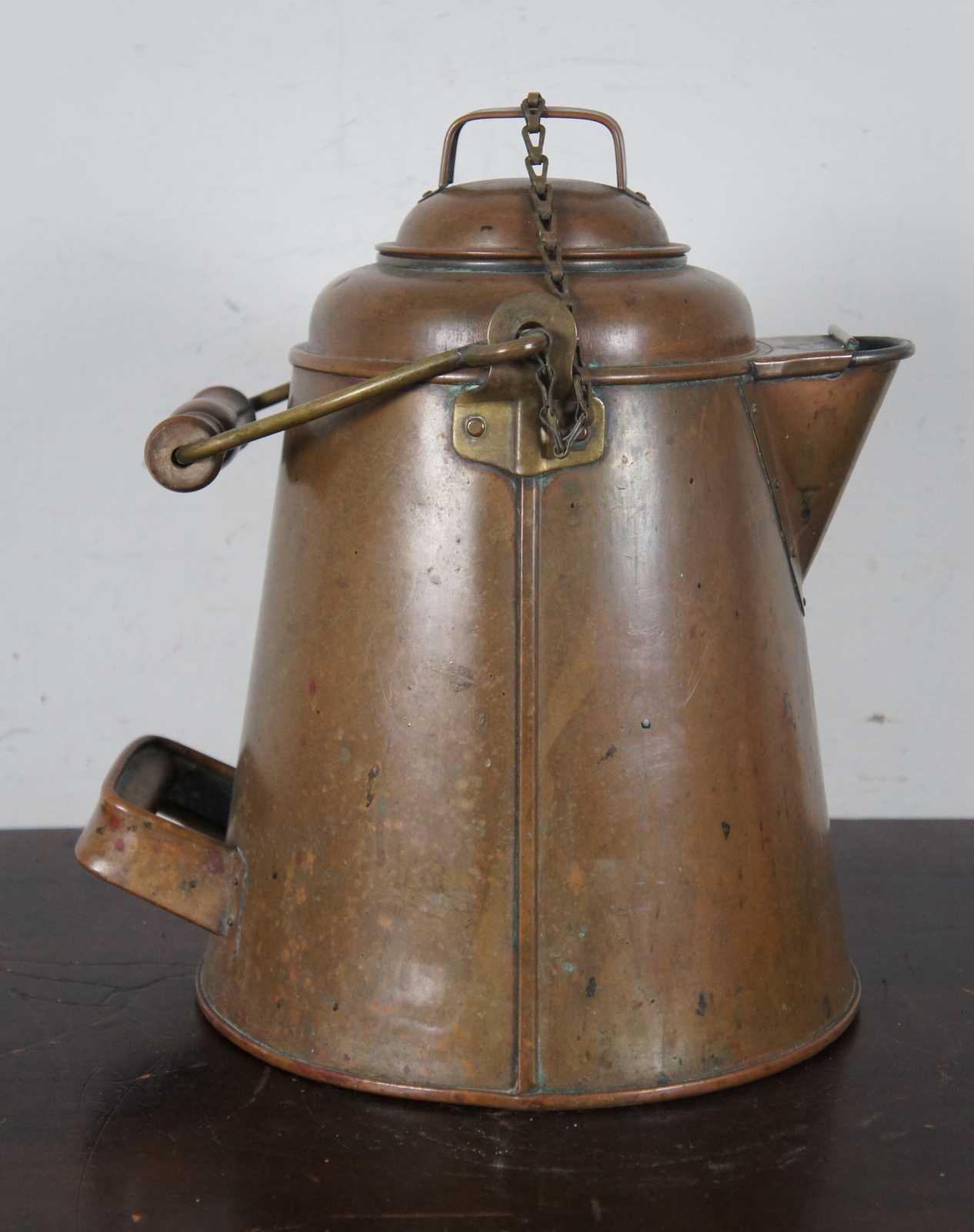 Large antique 19th century copper coffee pot or kettle. Made of copper over tin with wood handle and brass bale and attching hardware. Used by cowboys and sailors in the late 19th century.
