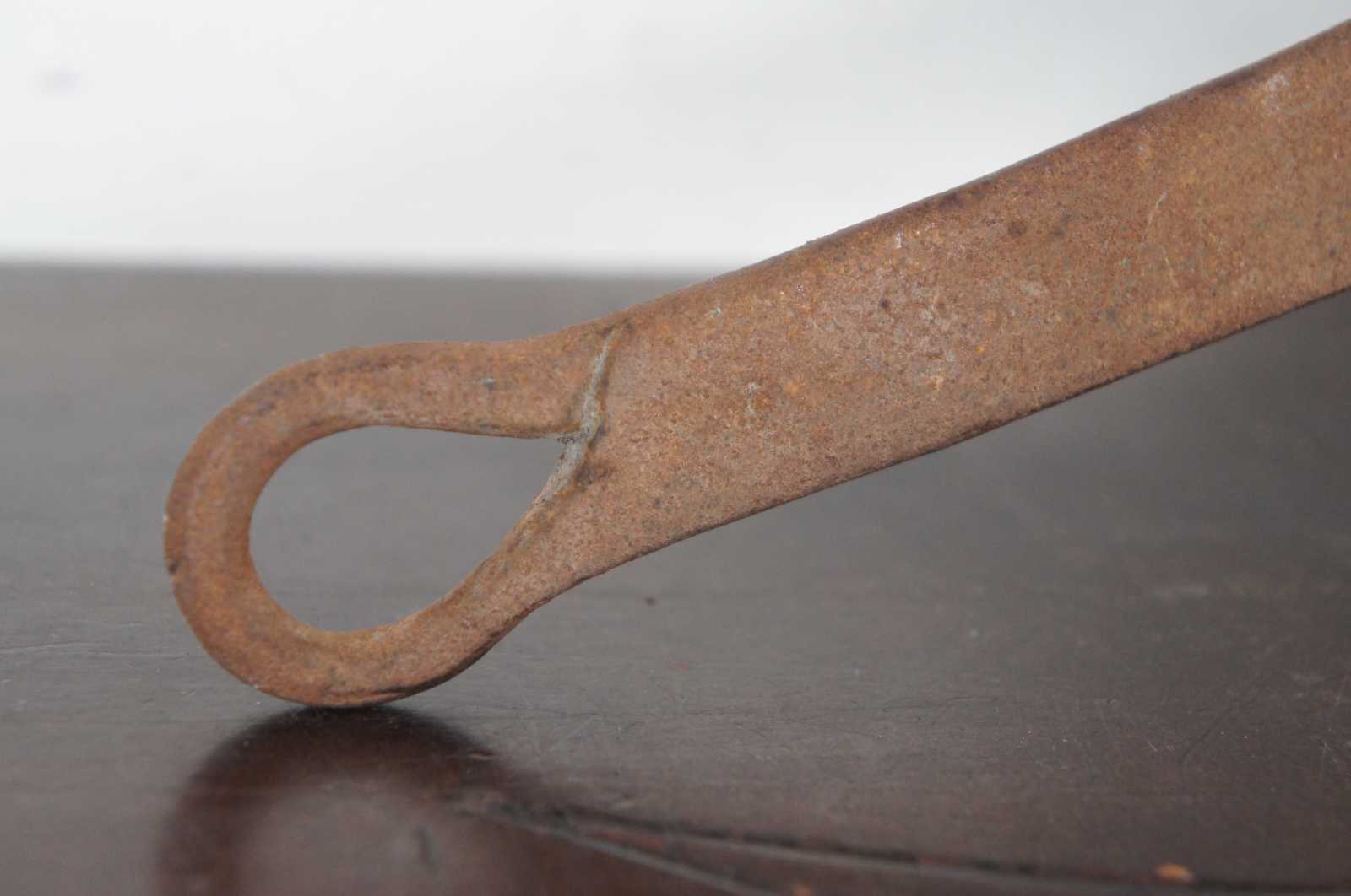 Antique copper sauce or saute pan with cast iron handle; capacity approximately 3 quarts.