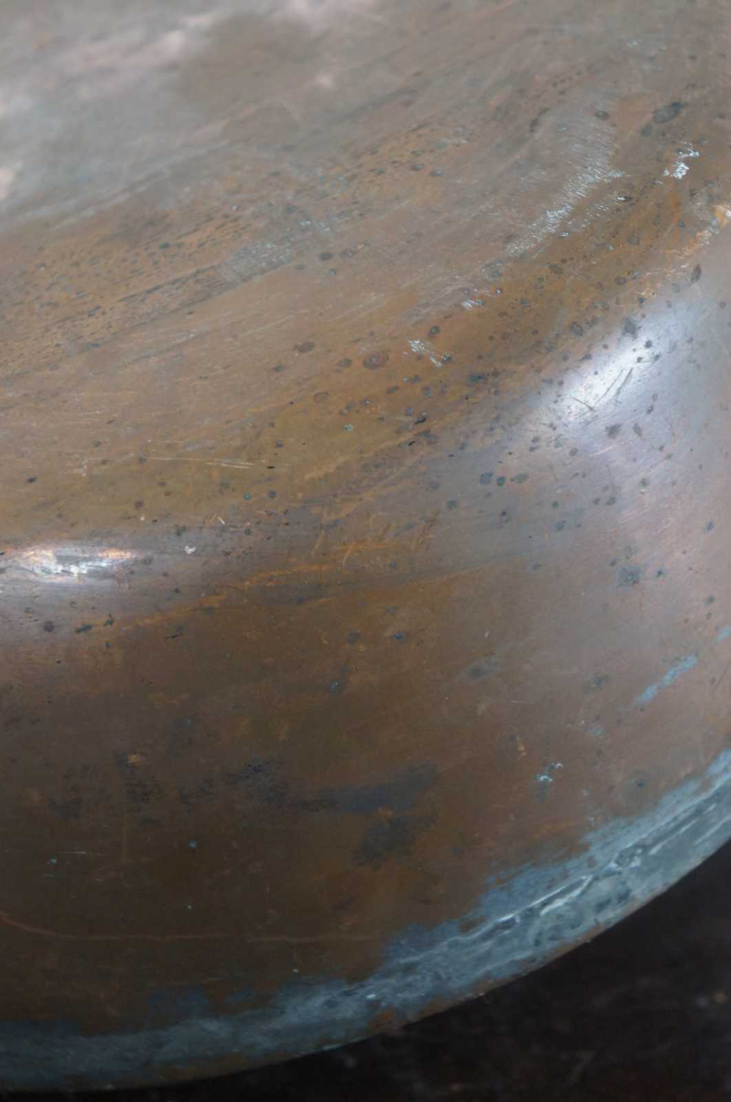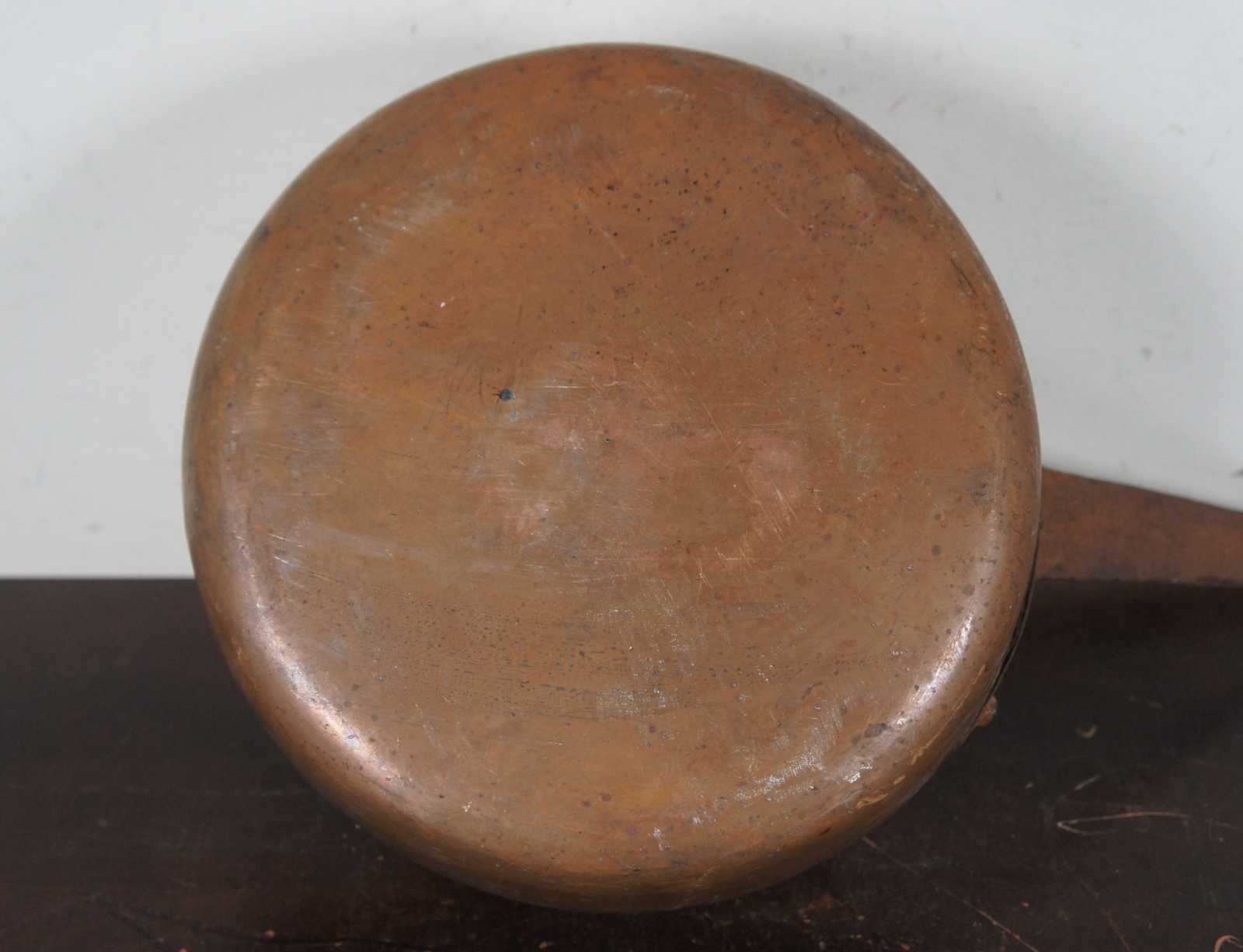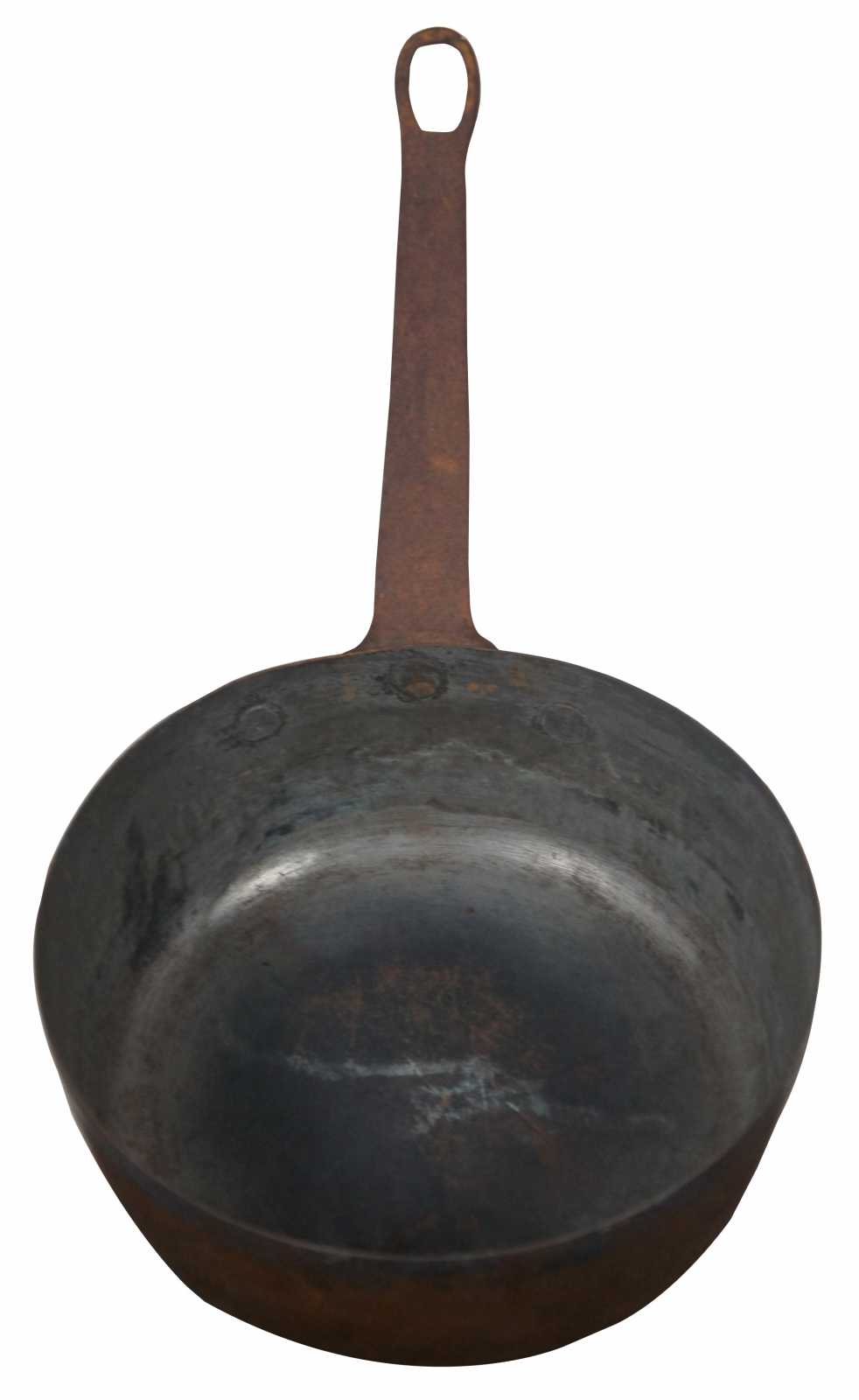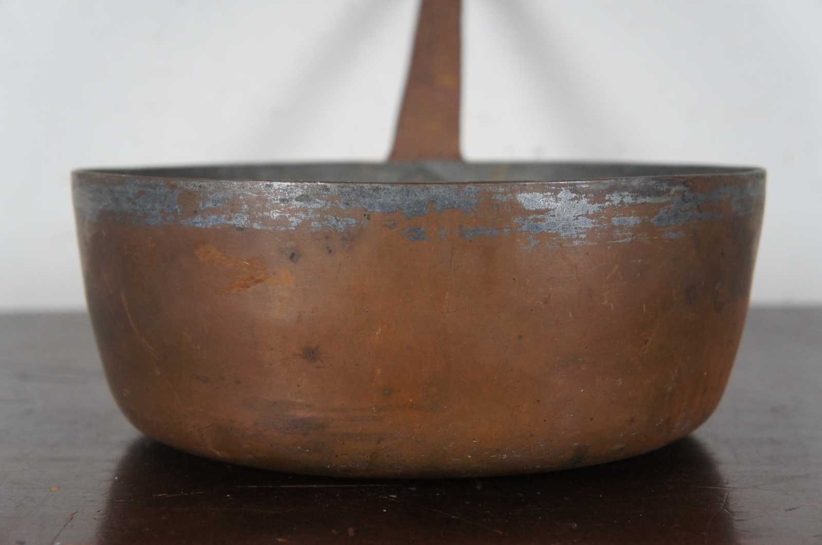 Antique copper clad sauce or saute pan with cast iron handle; capacity approximately 6 quarts.