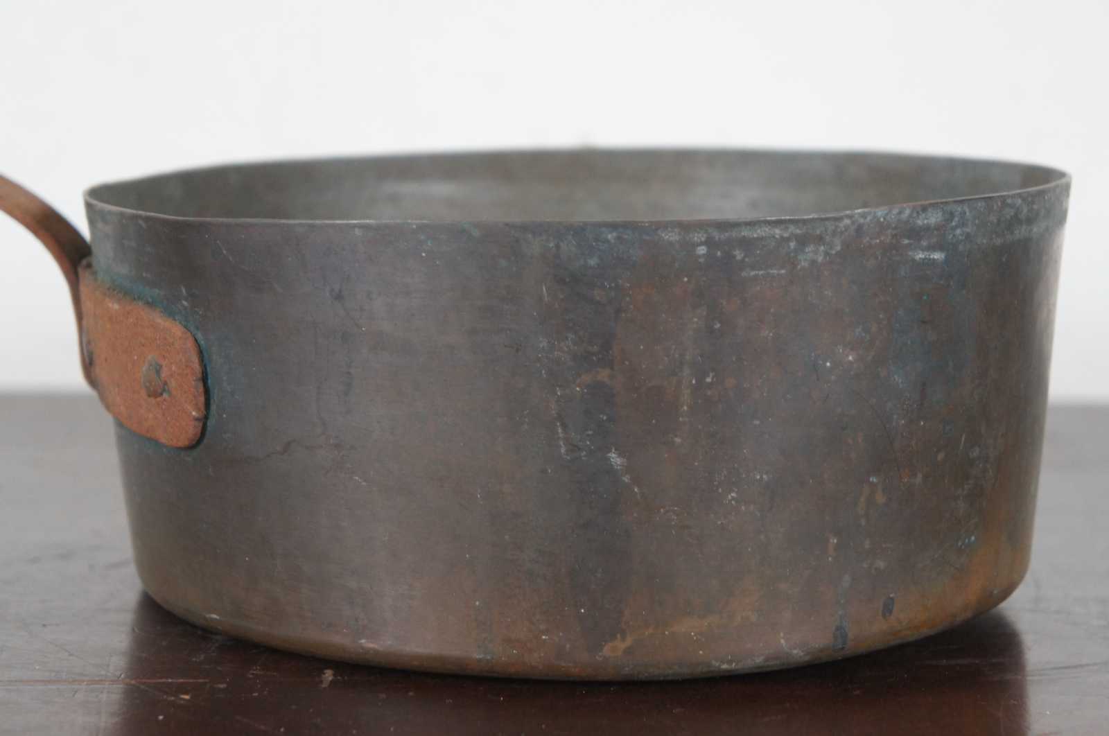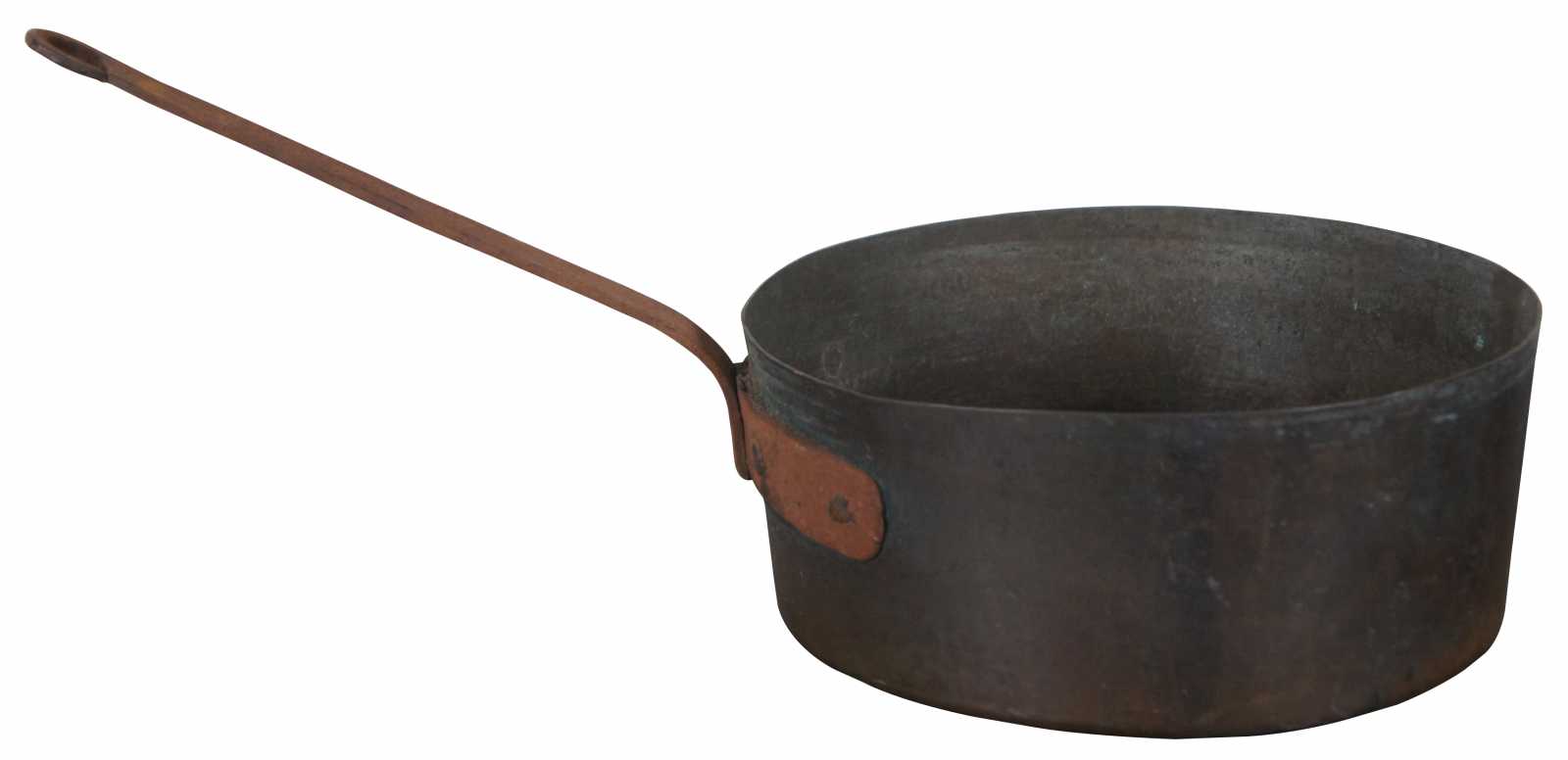 Antique copper sauce pan with cast iron handle, stamped “V.H.M.” on the side; capacity approximately 5 quarts.