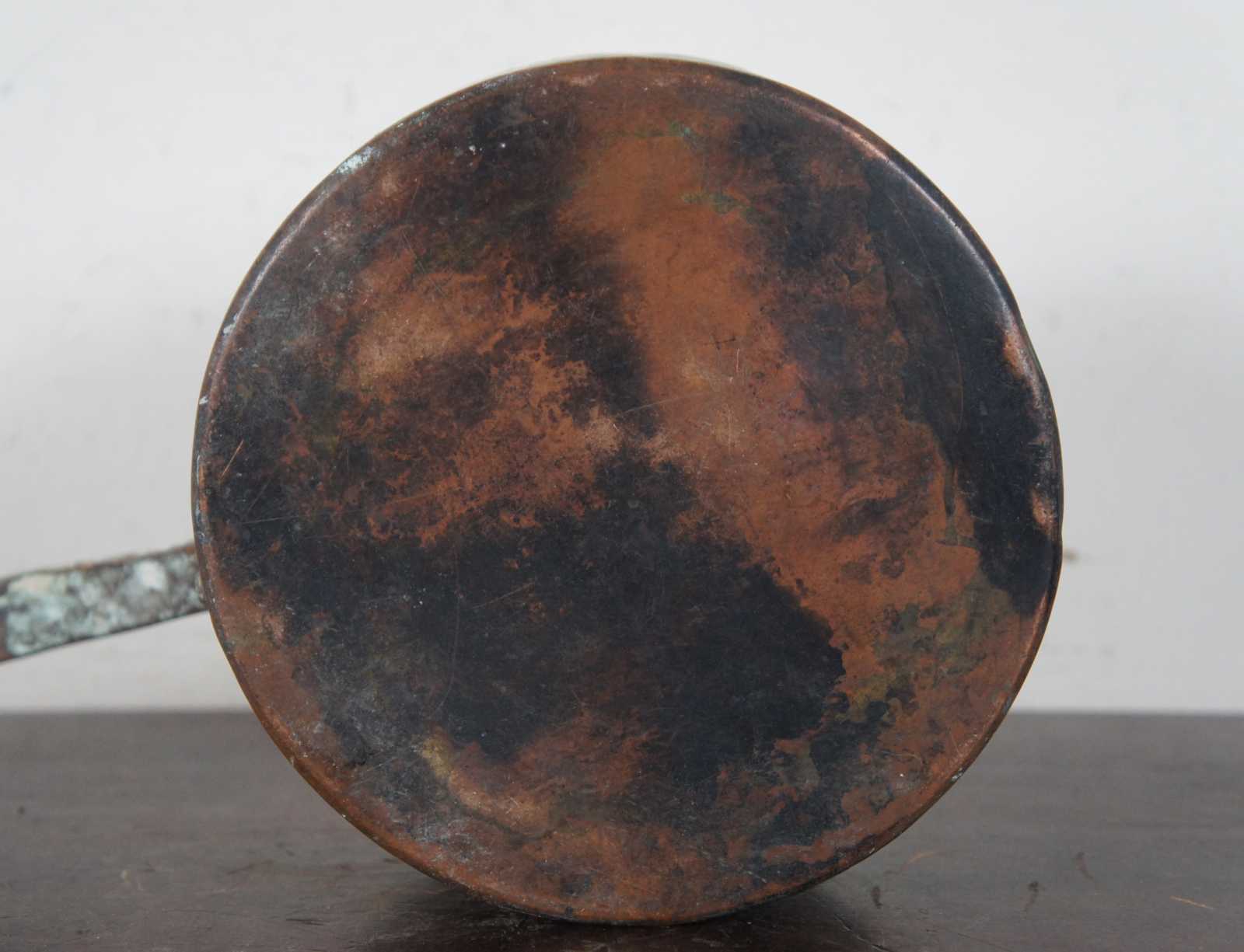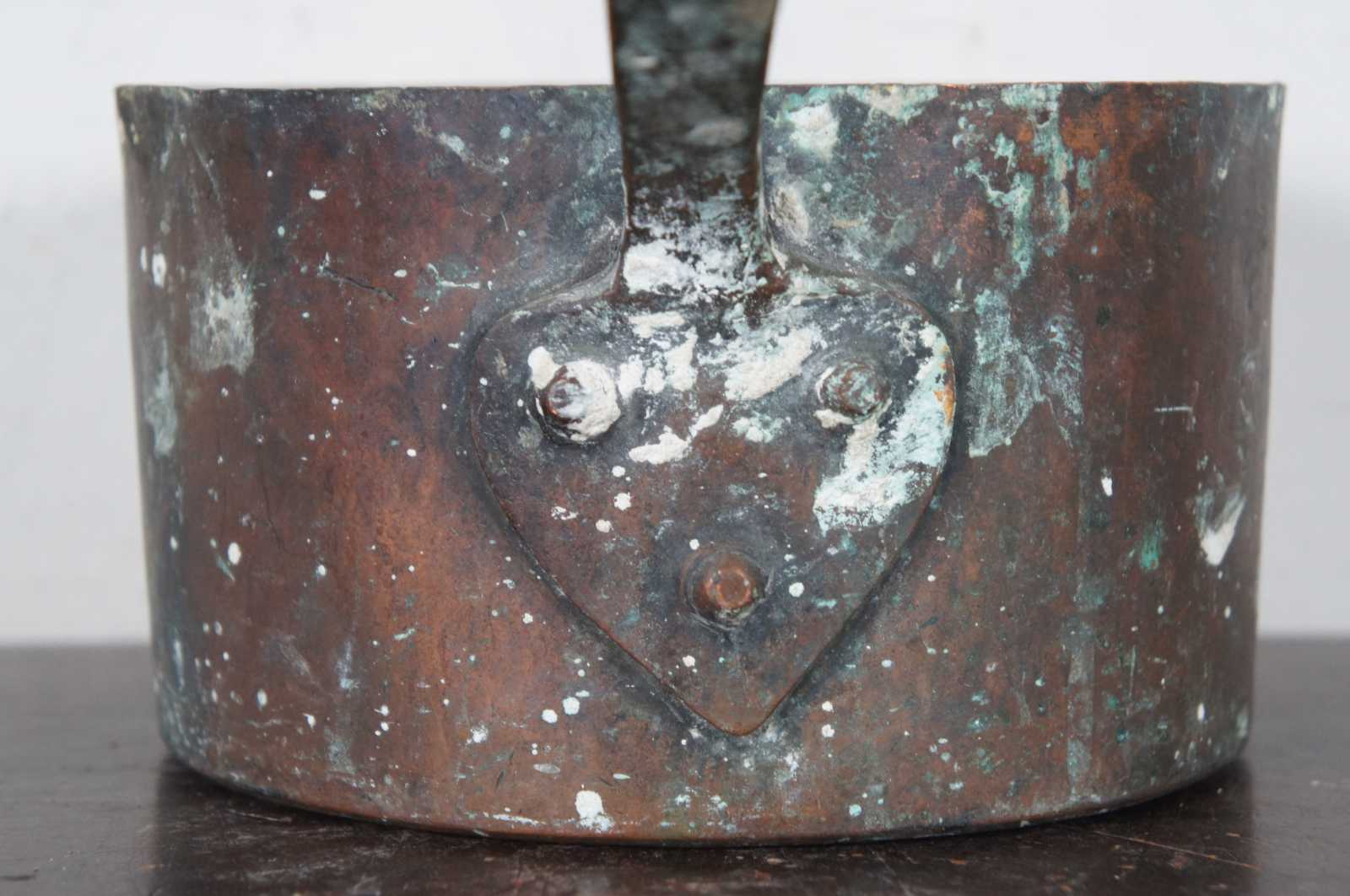 Antique copper sauce pan with cast iron handle; capacity approximately 3 quarts.