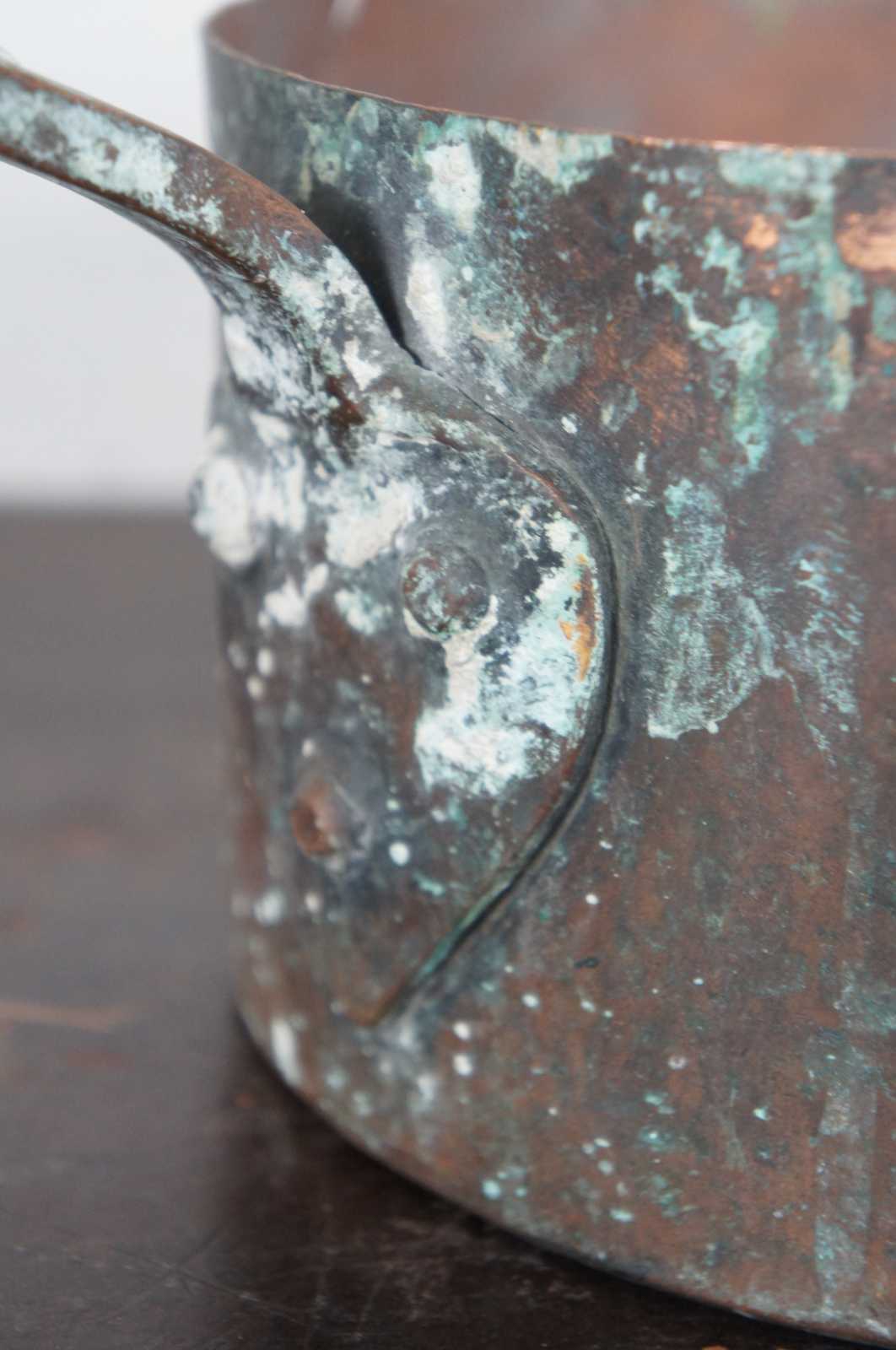 Good Overall - Rim slightly dented/small split; marks/heavy tarnish/oxidation/crusted white residue; see pictures