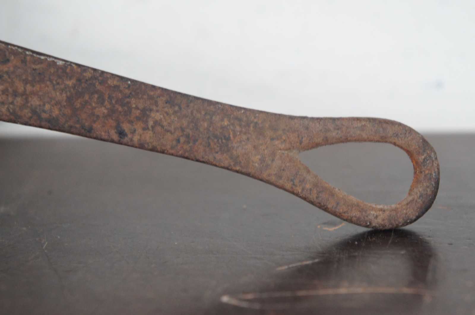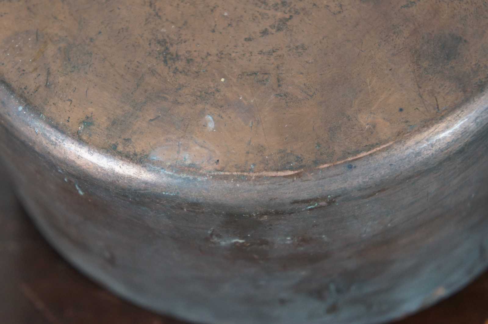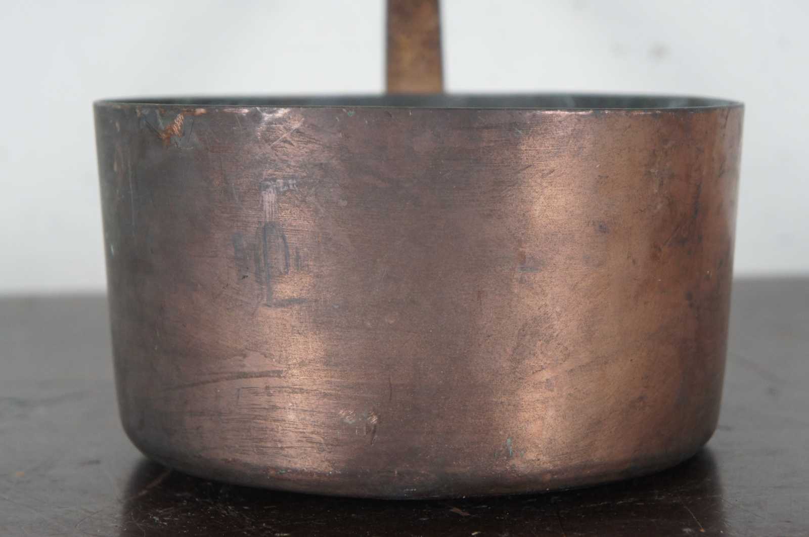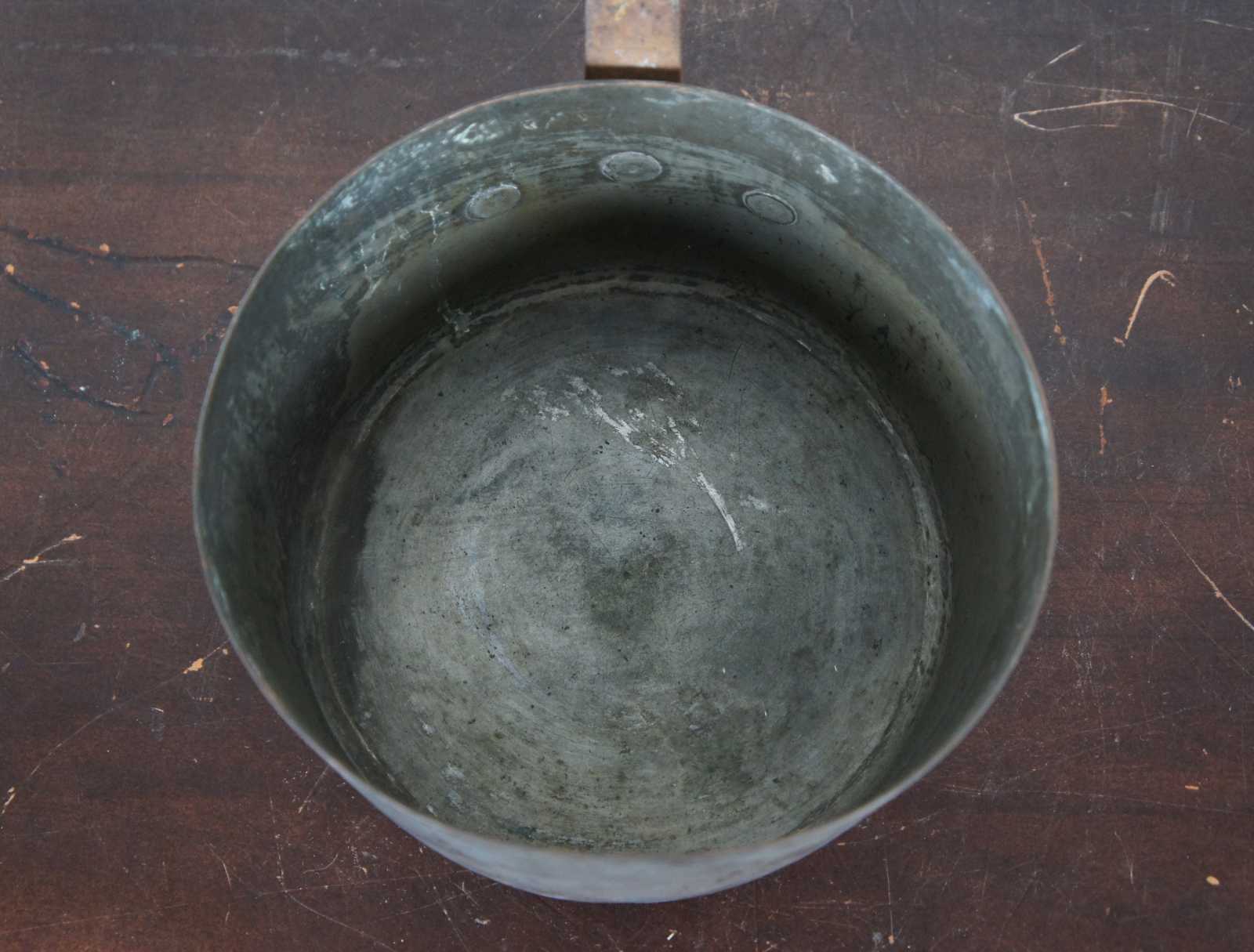 Antique copper sauce pan with cast iron handle; capacity approximately 3 quarts.
