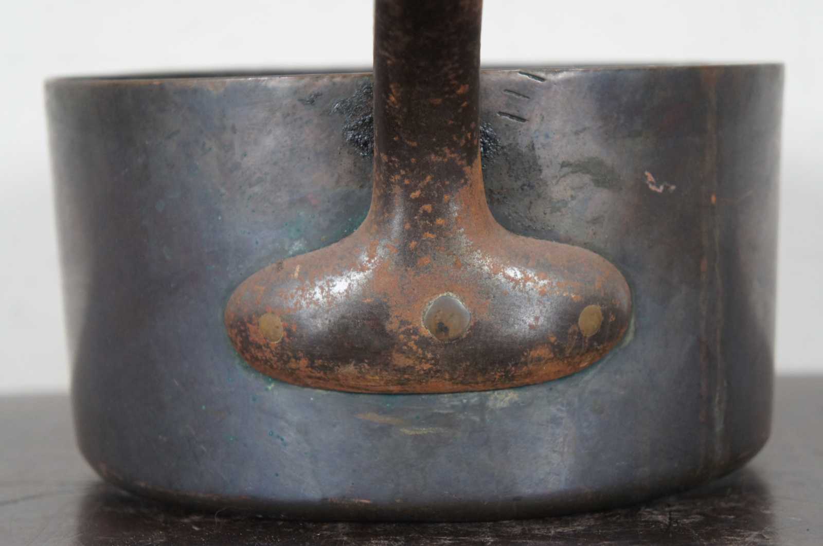 Antique copper sauce pan with cast iron handle; capacity approximately 4 quarts.
