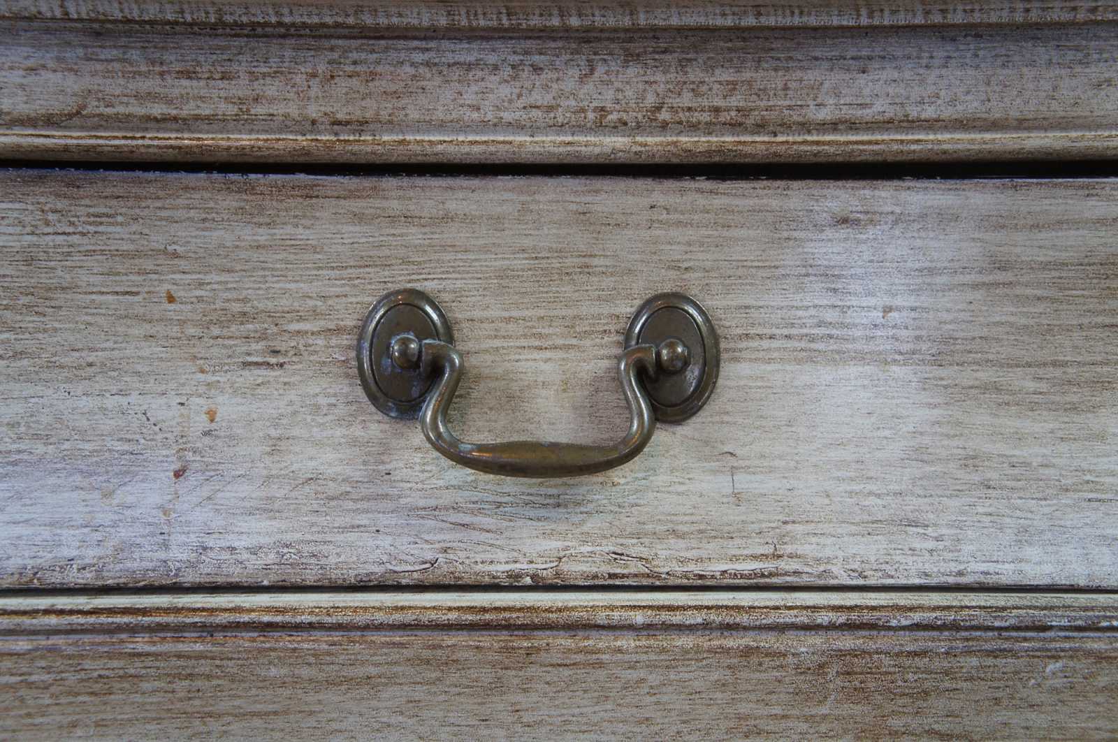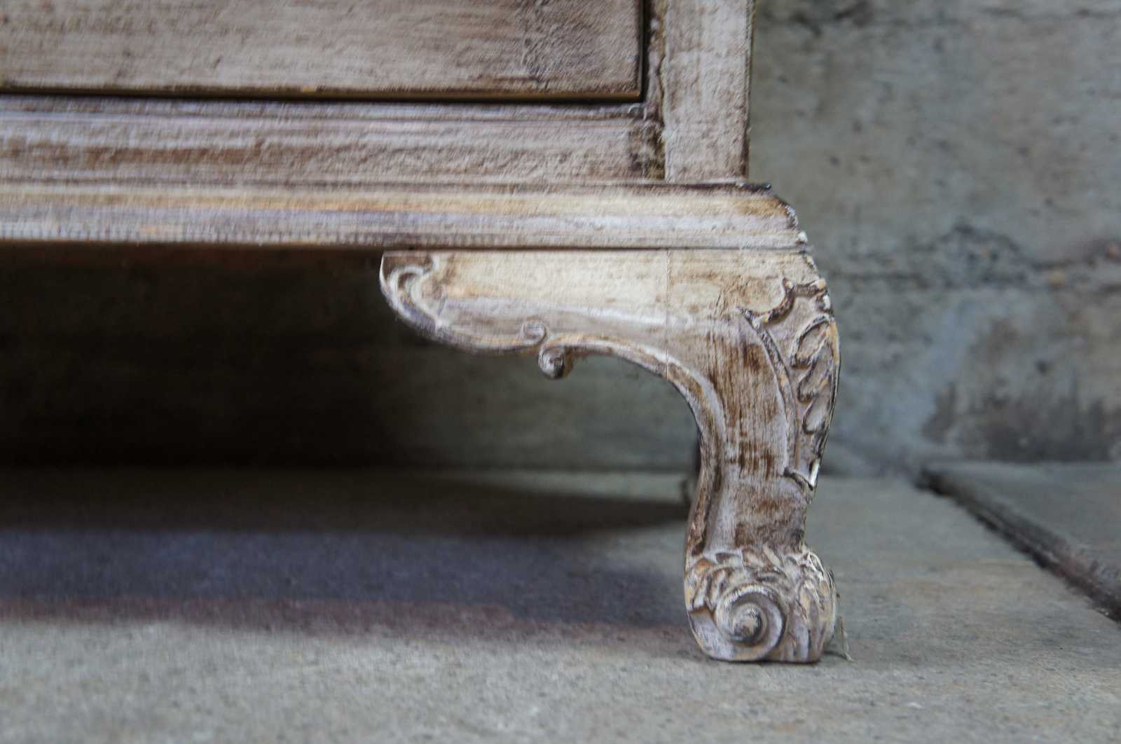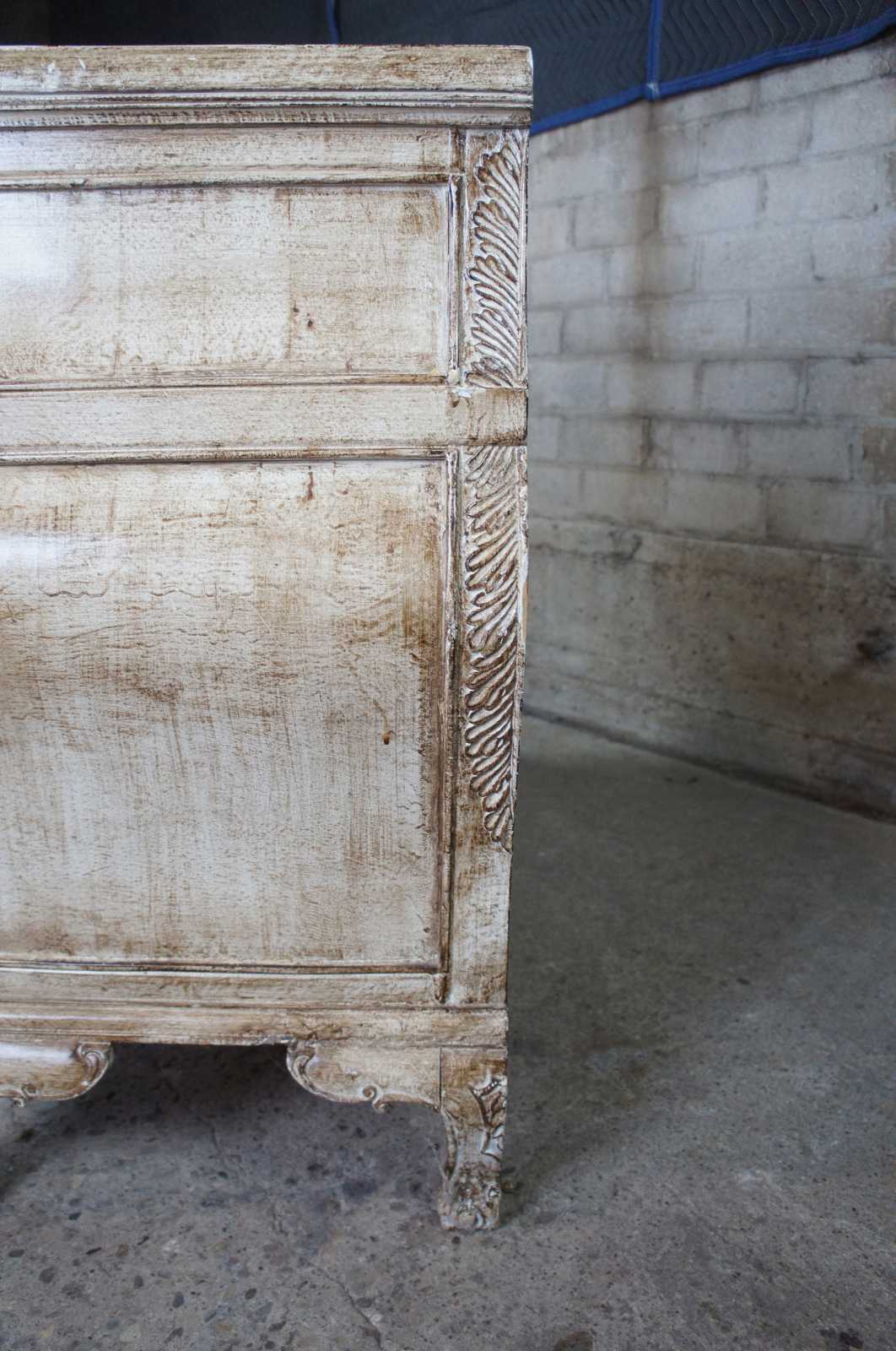 Late 20th Century Italian Revival Commode. A rectangular form with serpentine design featuring 3 dovetailed drawers over bracket feet. Includes an intricate raised acanthus deisgn along the edge. Finished in a beige white or Taupe color.