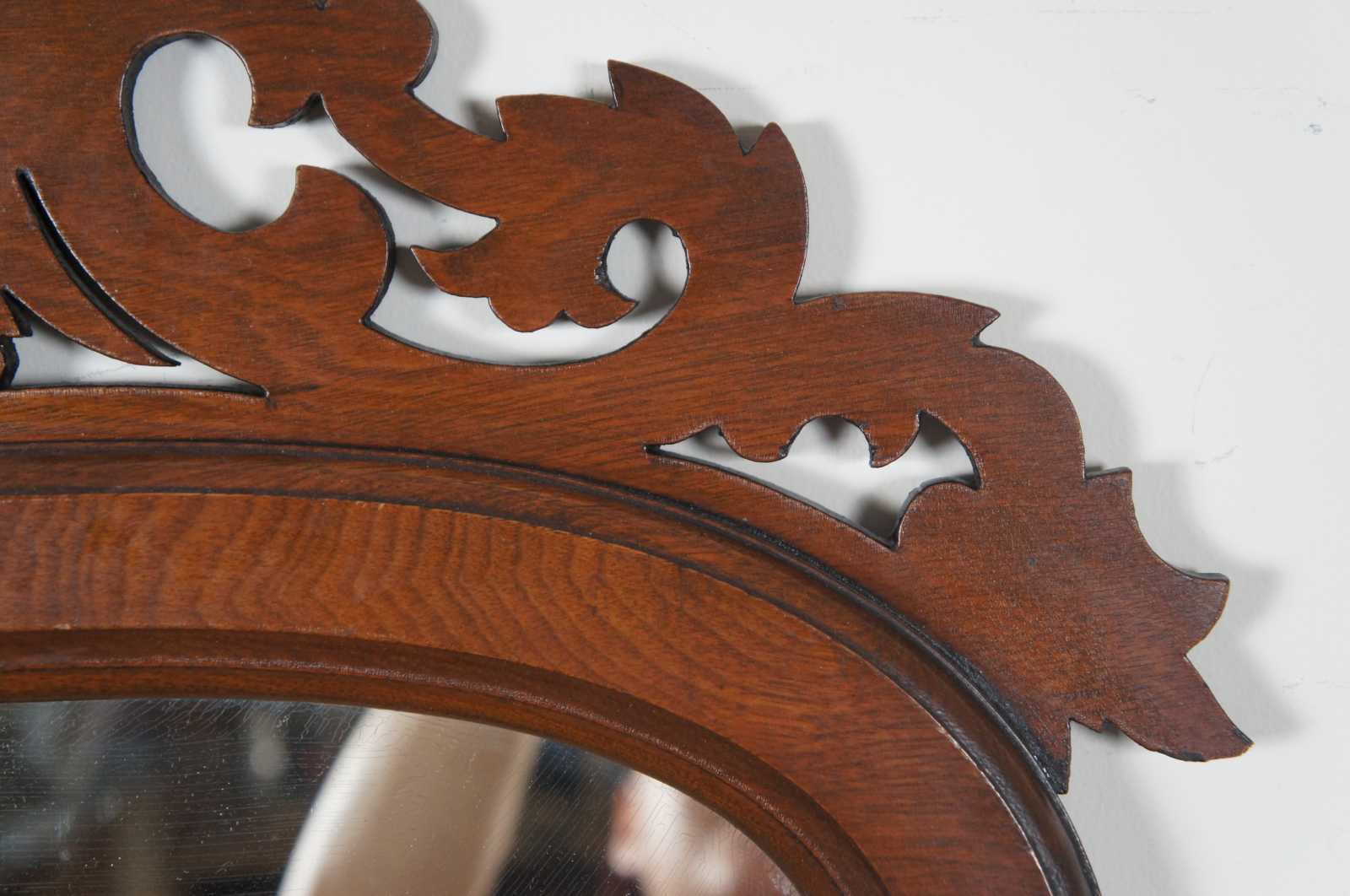 Antique walnut wall mirror with beveled frame and carved leaf crown.