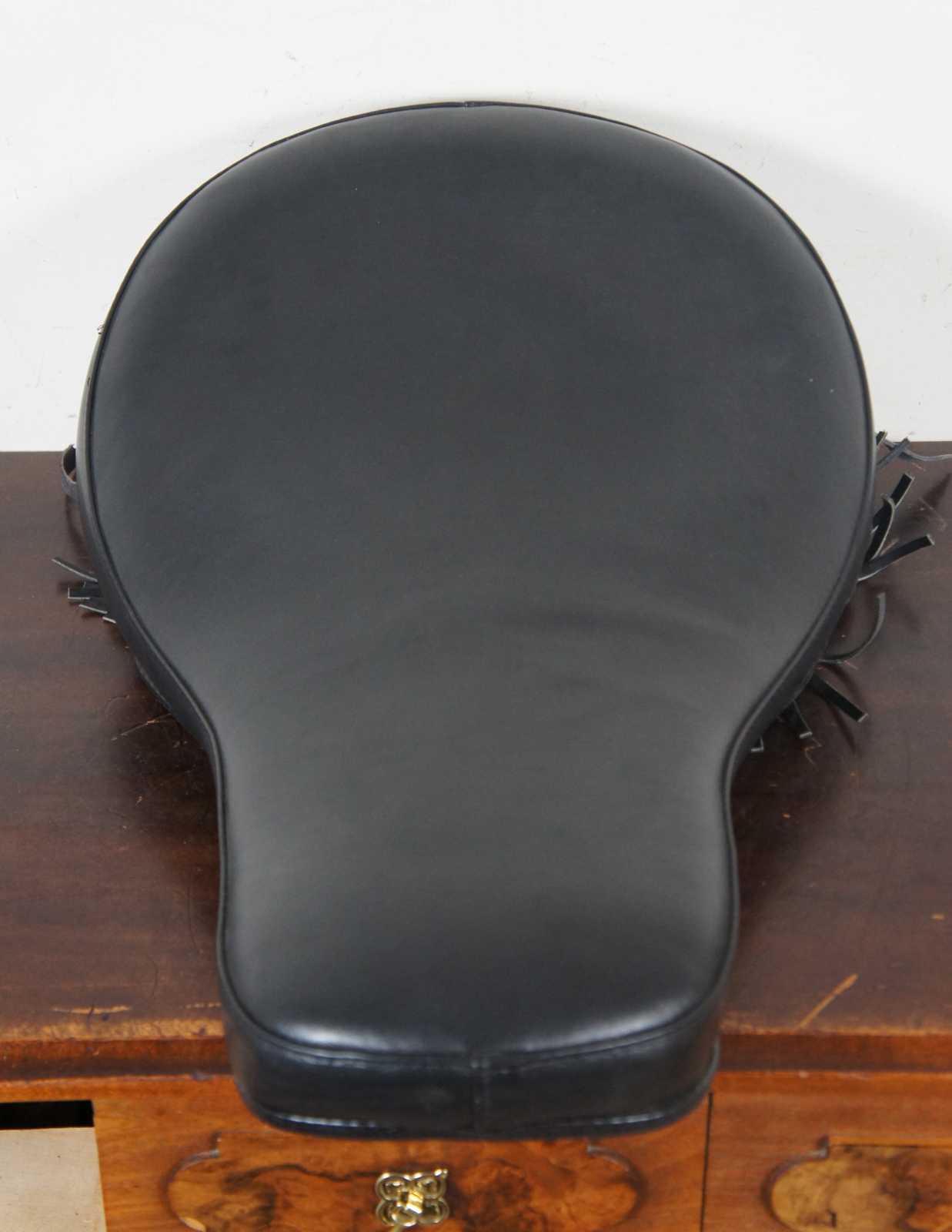 Extremely rare Harley-Davidson panhead buddy seat. Features black leather with a fringed backing, nailhead and stared conchos.