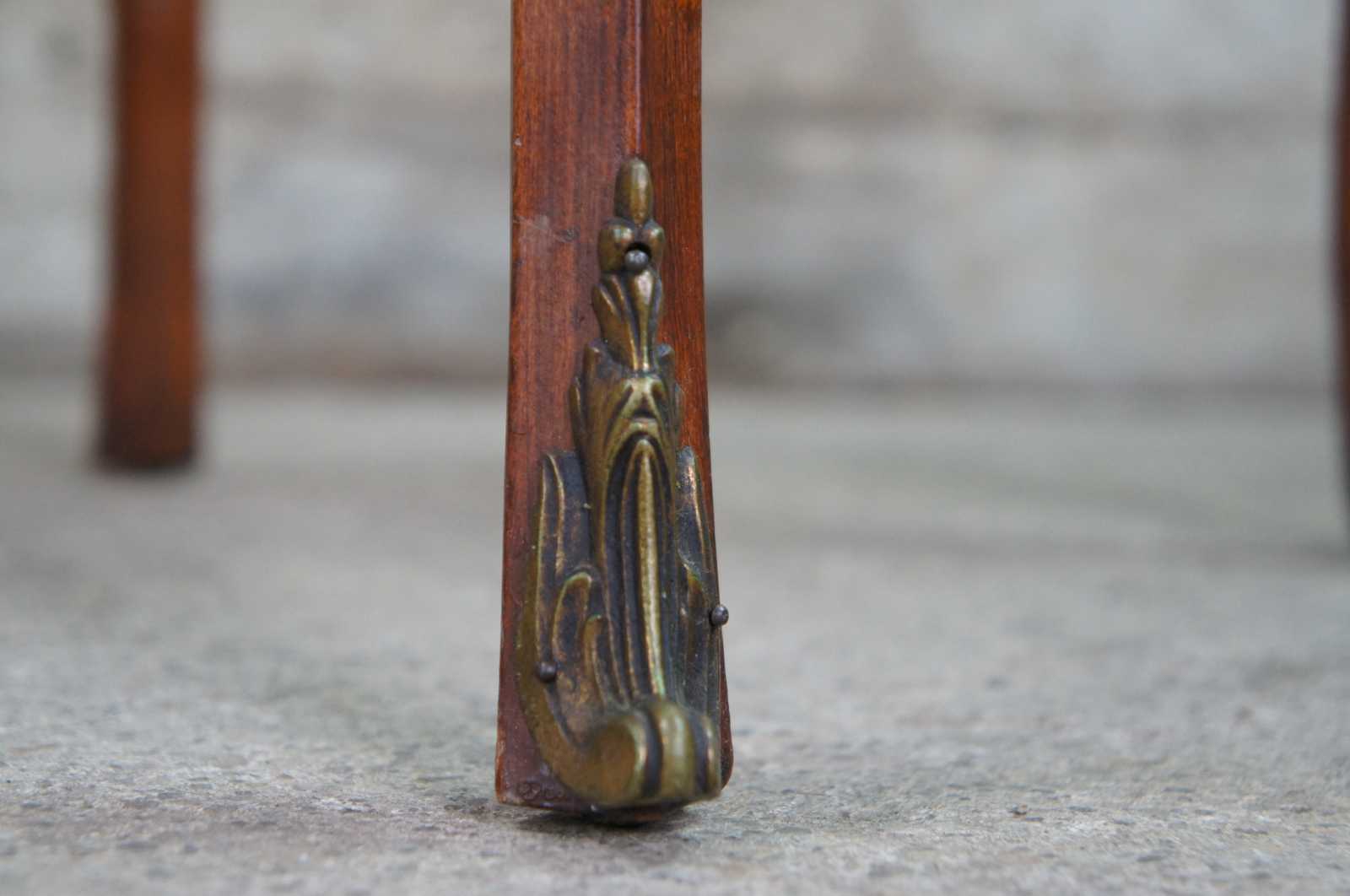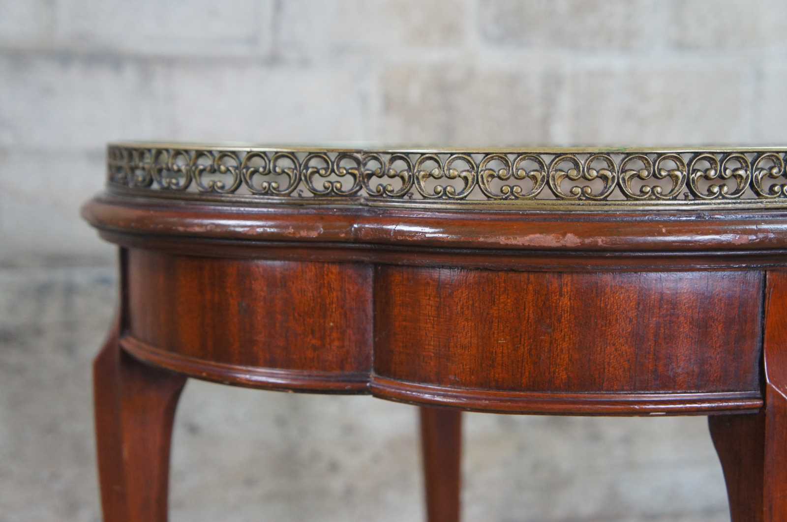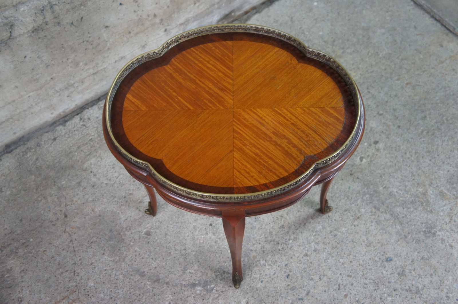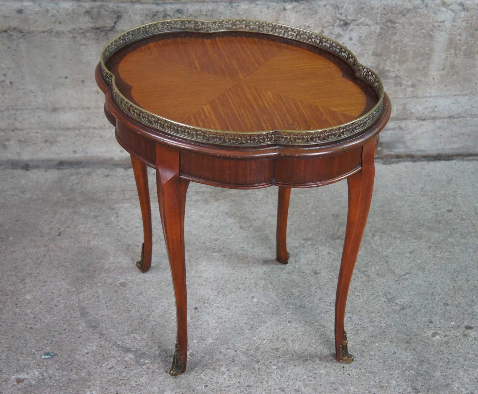 Antique French Louis XV Gueridon or Bouillette table featuring an oval serpentine / clover form with reticulated brass gallery, matchbook top and tapered cabriole legs with brass feet caps.