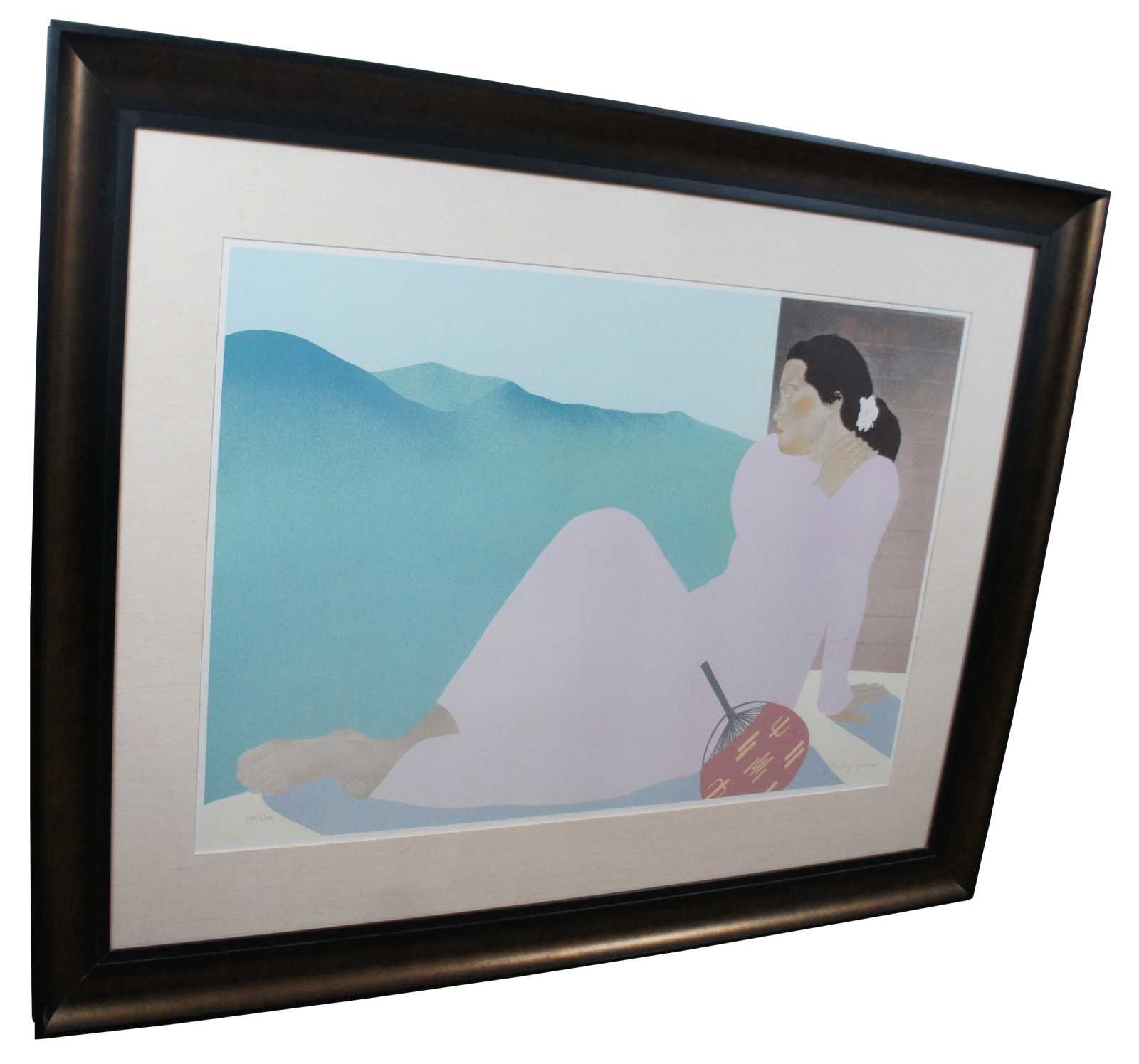 ""Kohala Afternoon"" serigraph print by Pegge Hopper, circa 1980s. Featuring a Hawaiian woman reclining in the sun with a fan at her side and mountains in the background; pencil signed and numbered 250/300. “Born in Oakland, California, Pegge Hopper moved to Hawaii in 1963 and took a job as an art director with an advertising agency. In 1970, she began a series of paintings of Island women, and she has exhibited these paintings in one-person shows in Hawaii as well as Chicago, Los Angeles, and Seattle.