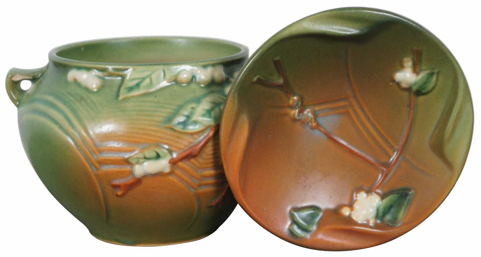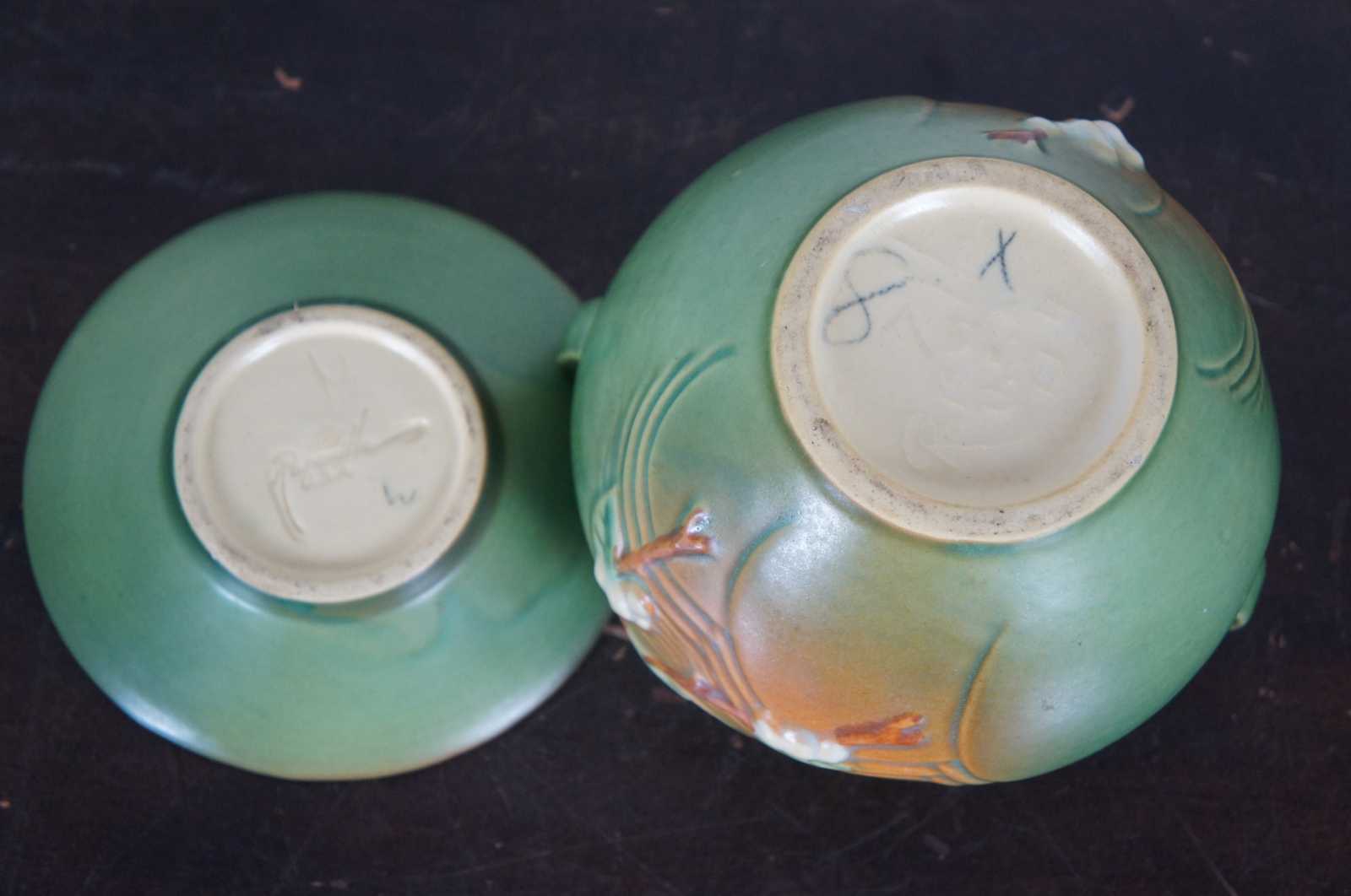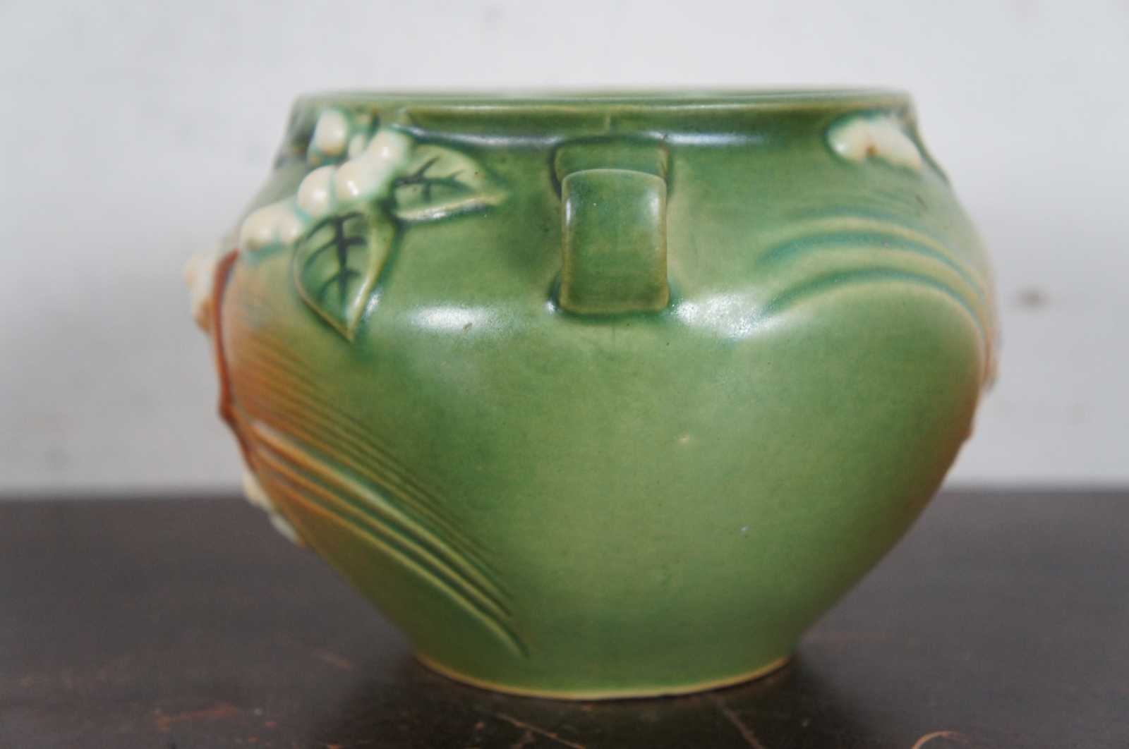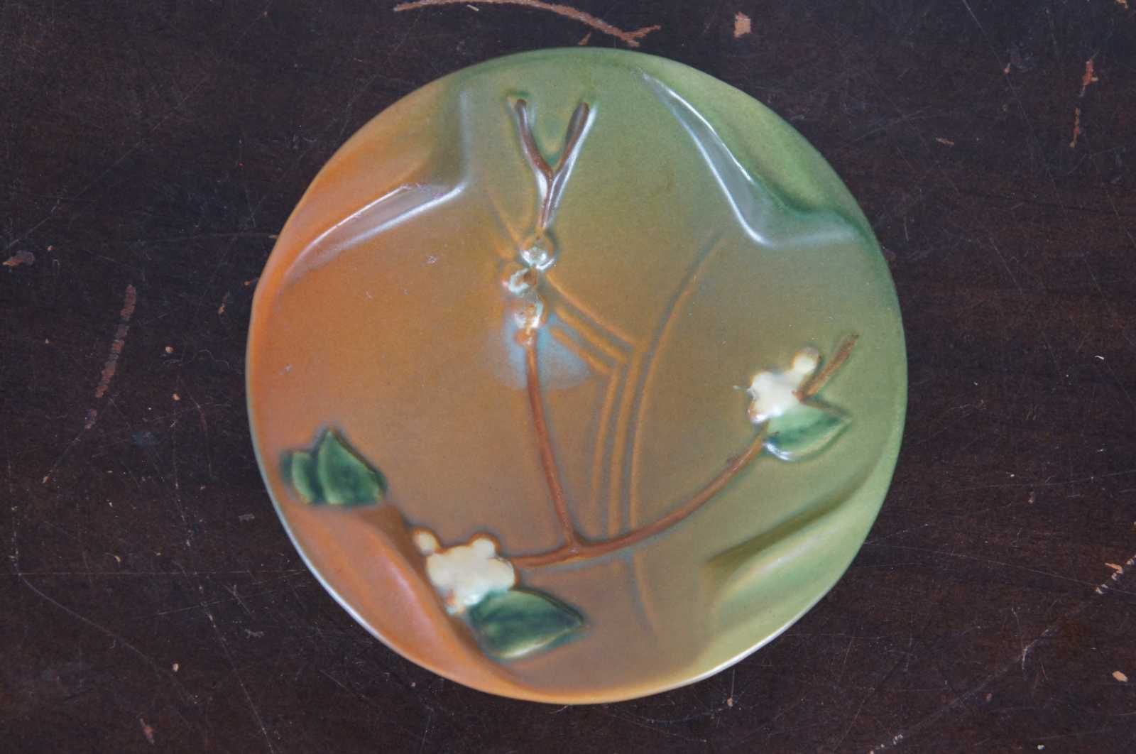 Vintage Roseville Pottery number IJ-4 green and brown Snowberry double handled vase and dish.
