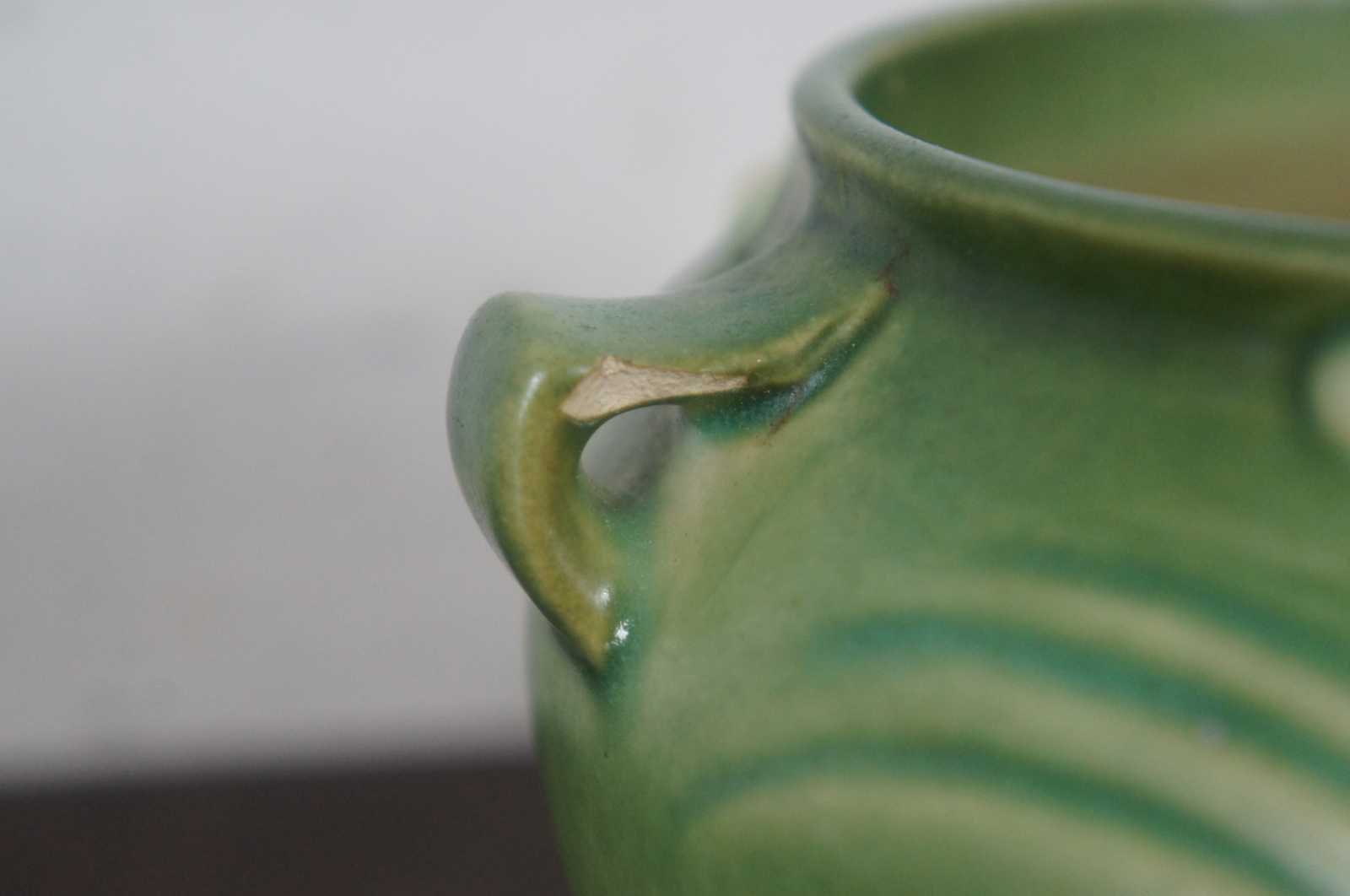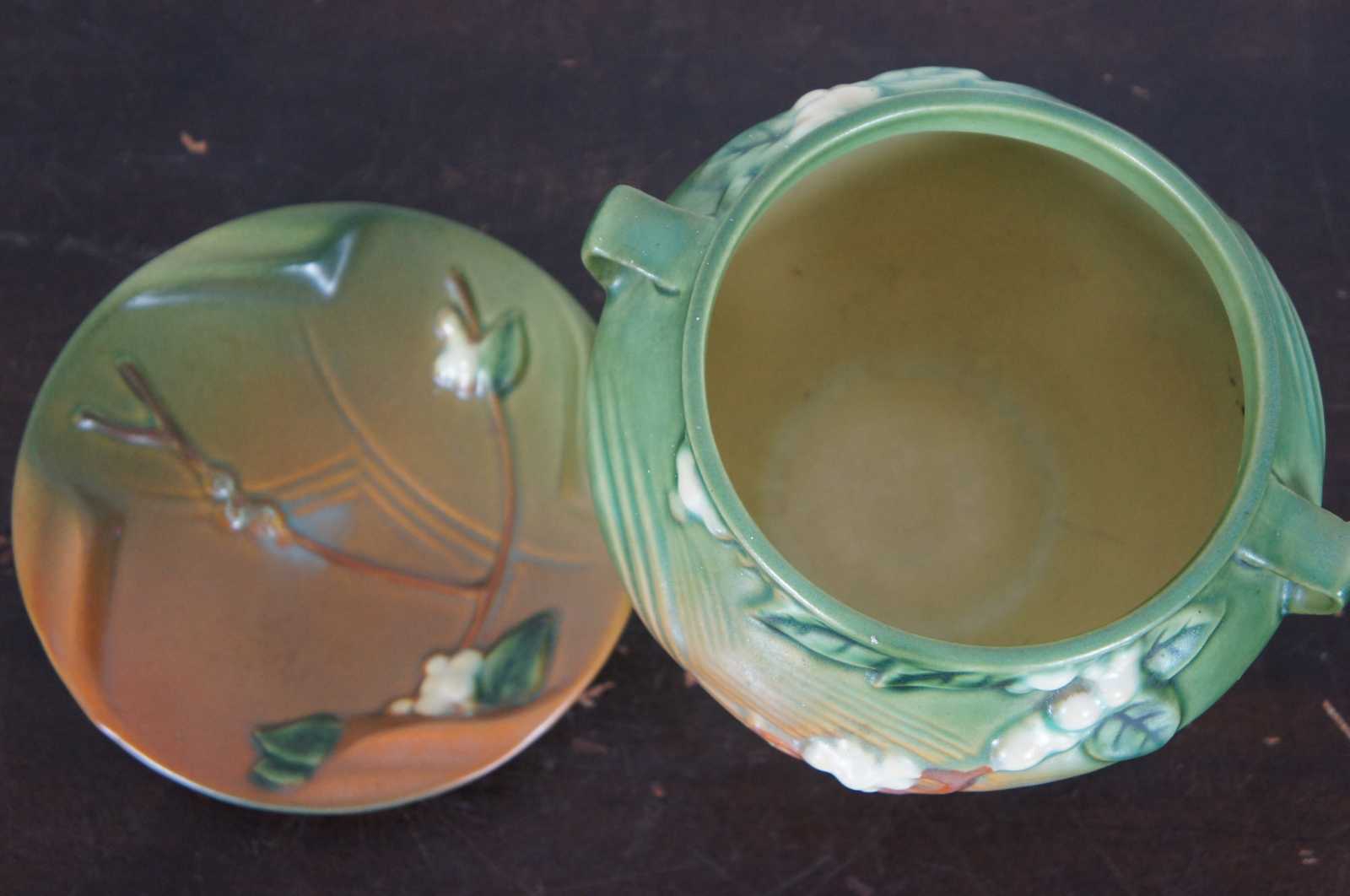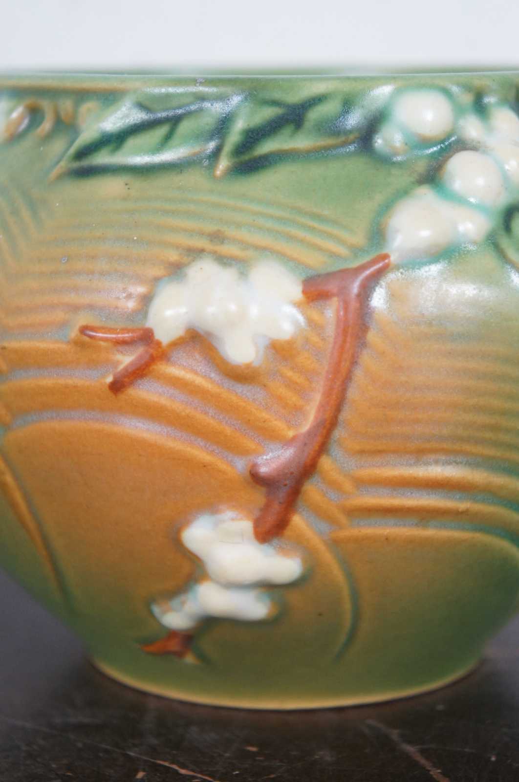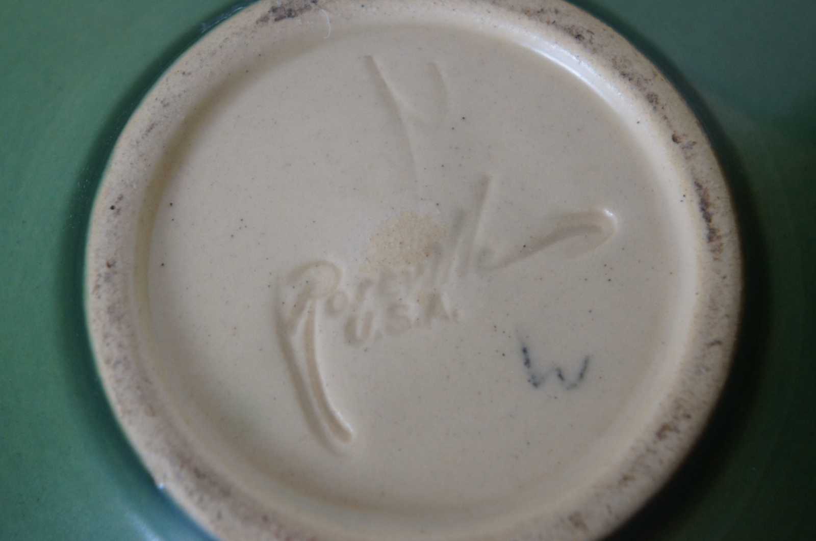 Vintage Roseville Pottery number IJ-4 green and brown Snowberry double handled vase and dish.