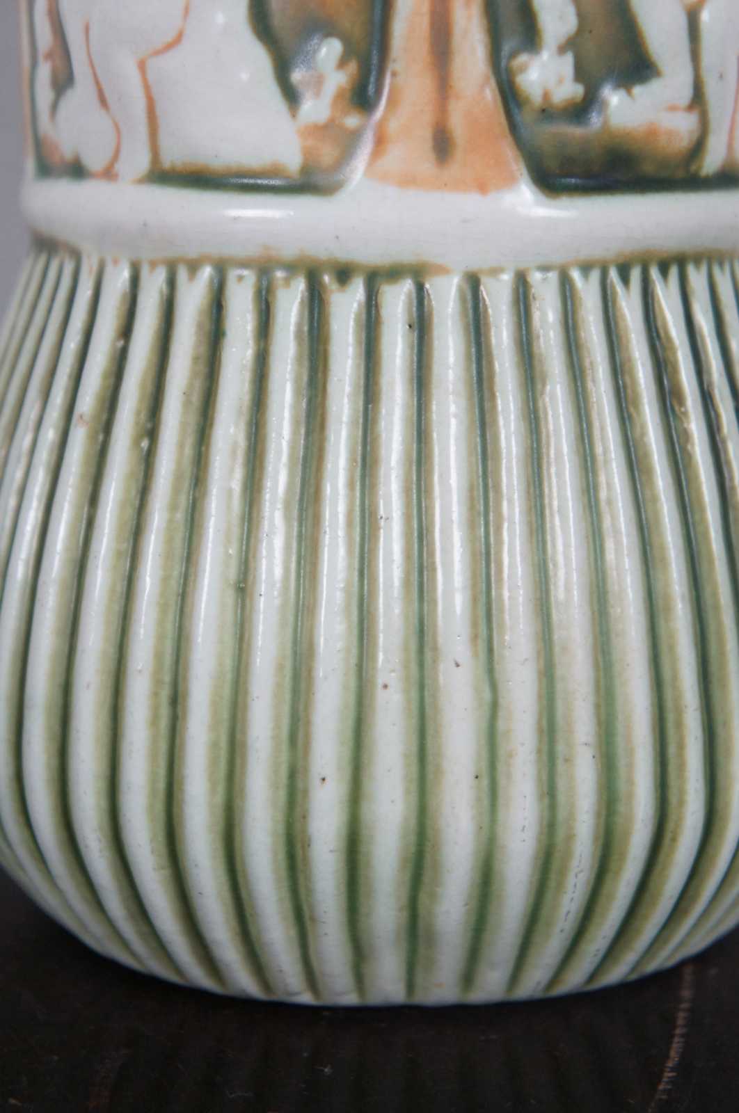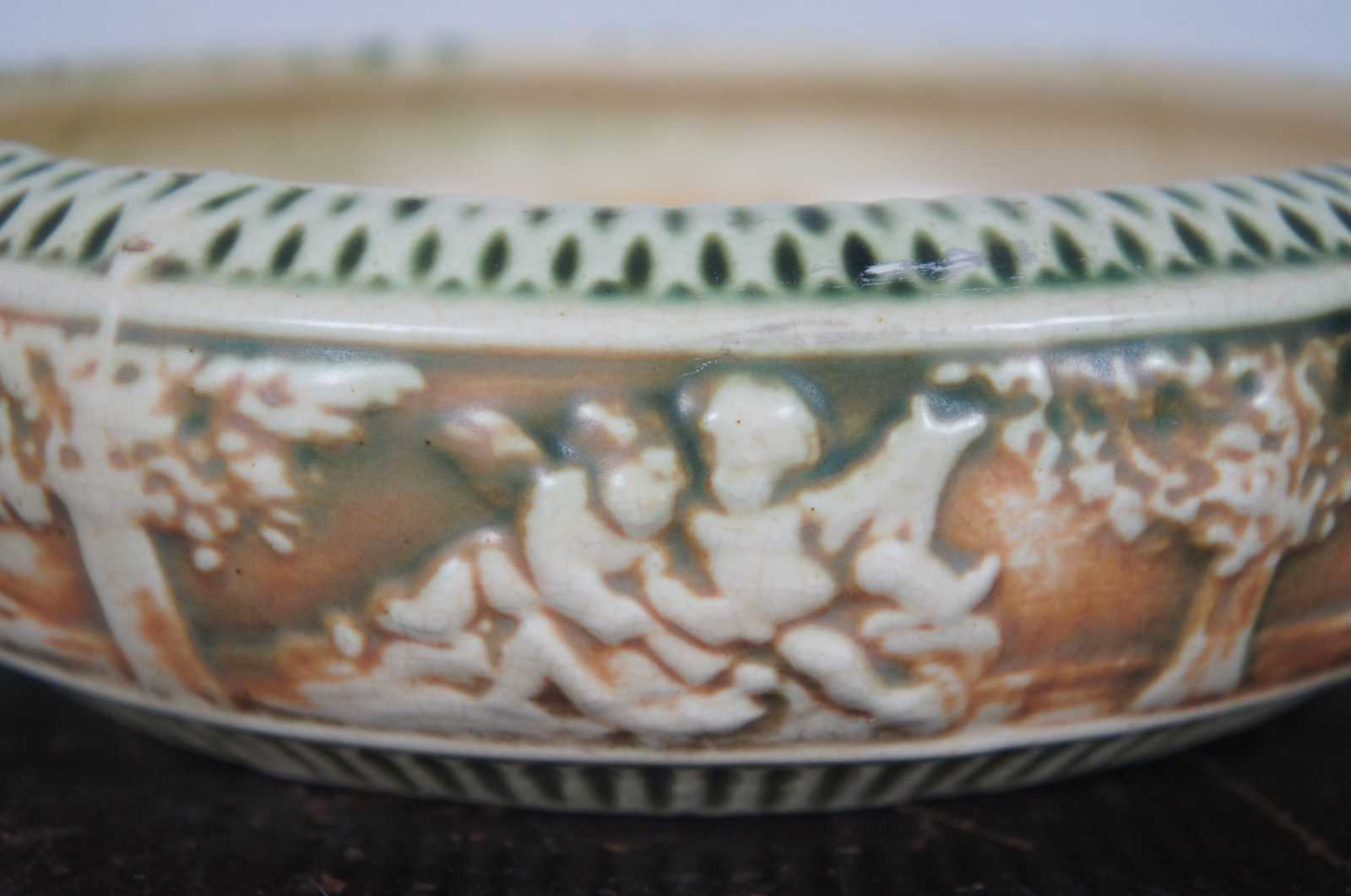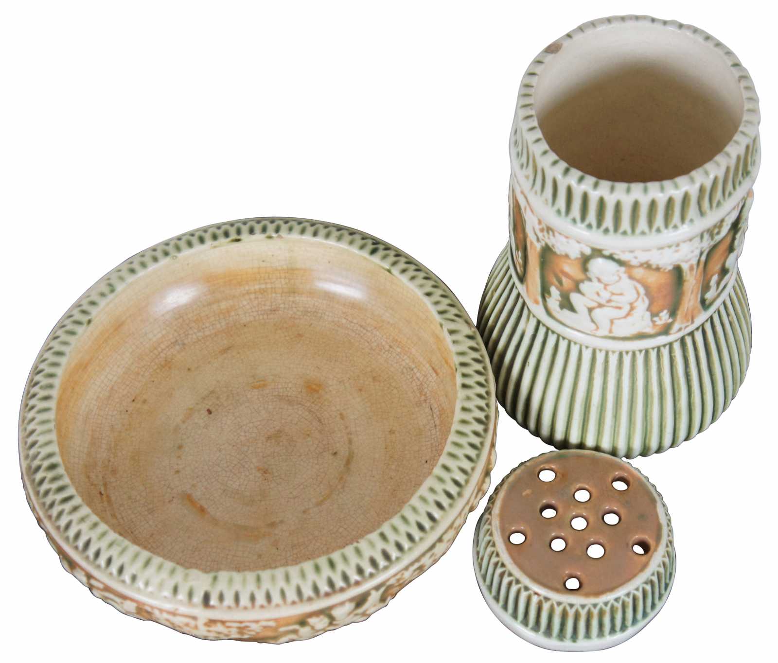 Antique 1910s set of three ceramic pieces by Roseville Pottery in the green and orange Putti cherub, Donatello pattern – flower frog, jardiniere / vase, and a shallow bowl.