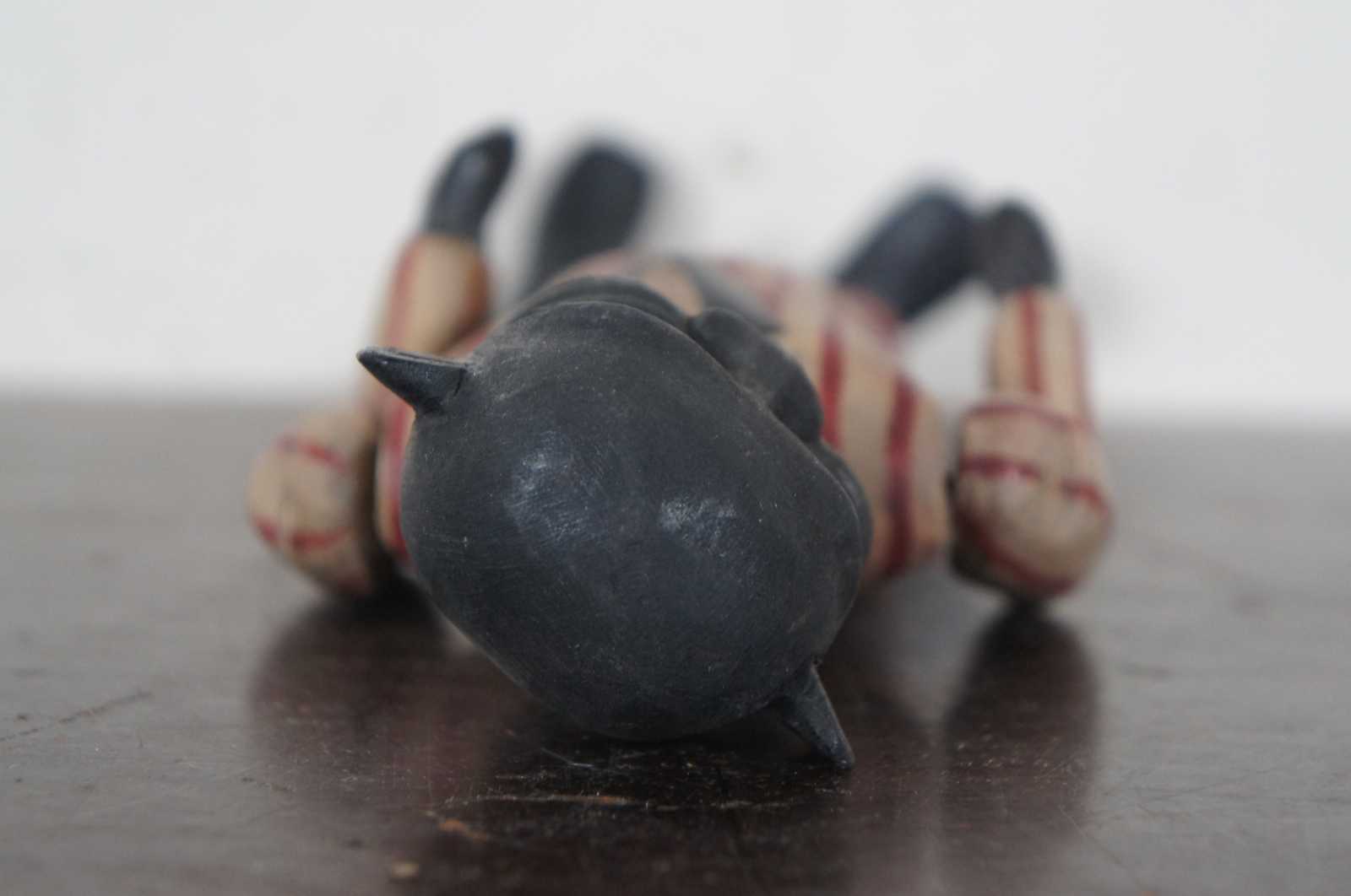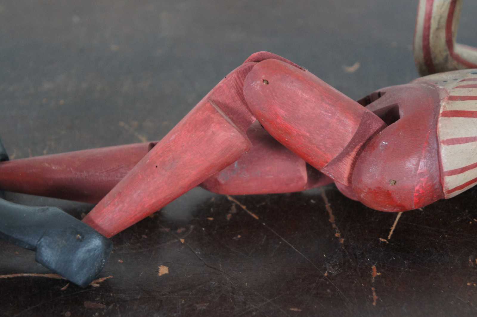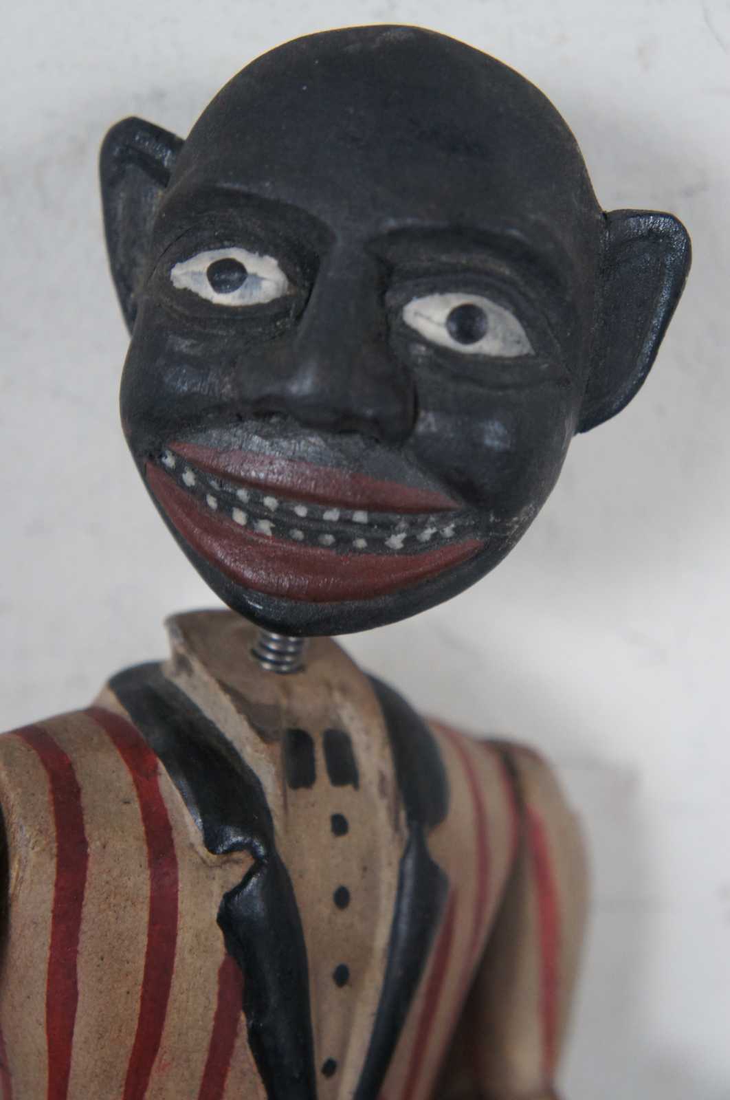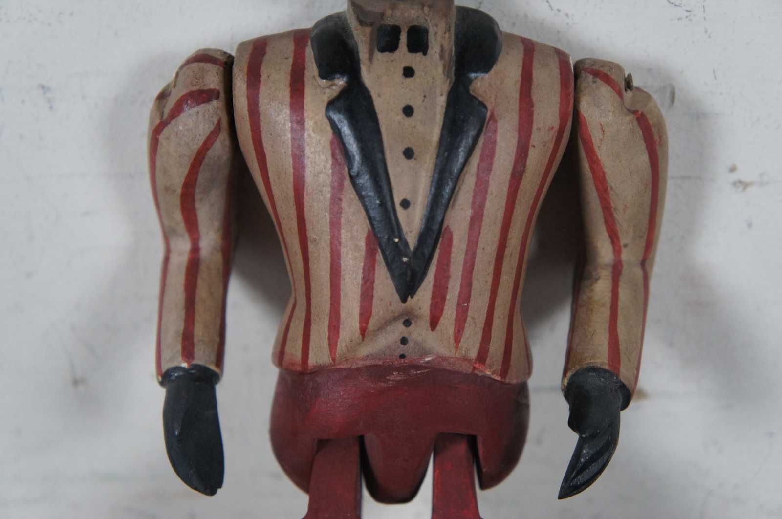 Vintage Americana, folk art style hand carved wooden jig or limberjack toy doll, dancing Minstrel puppet, with spring mounted bobble head and red, white, and black painted / striped tuxedo.