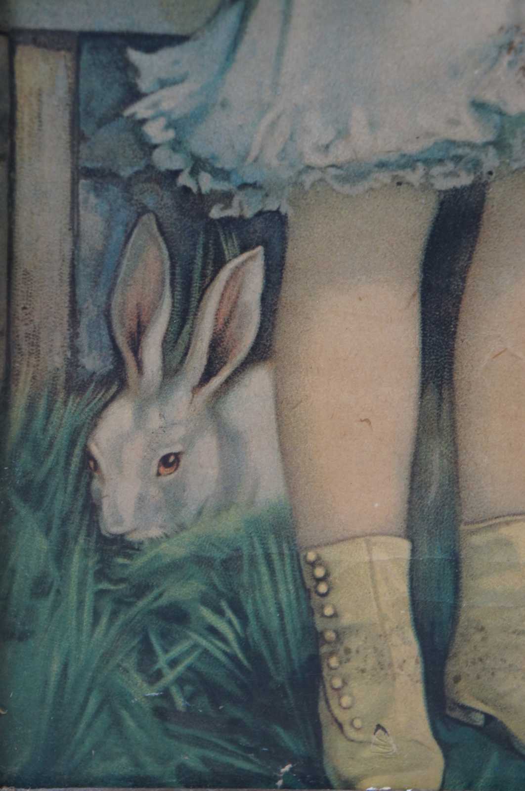 Antique Victorian lithograph print showing a young girl and boy seated at a bench with a pair of rabbits. Labeled as “The Pet Rabbit No 703.”