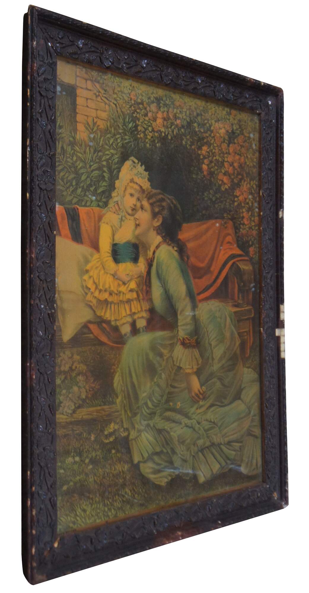 P.O. Vickery Antique Lithograph. "Baby's Better". Augusta, Maine. Dated 1886. Antique Victorian colored lithograph print titled showing a mother and her child seated by a garden bench, set in an intricately carved floral wood frame.