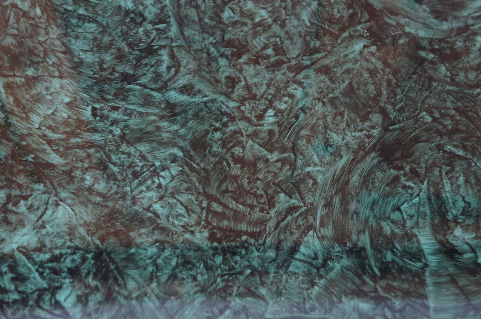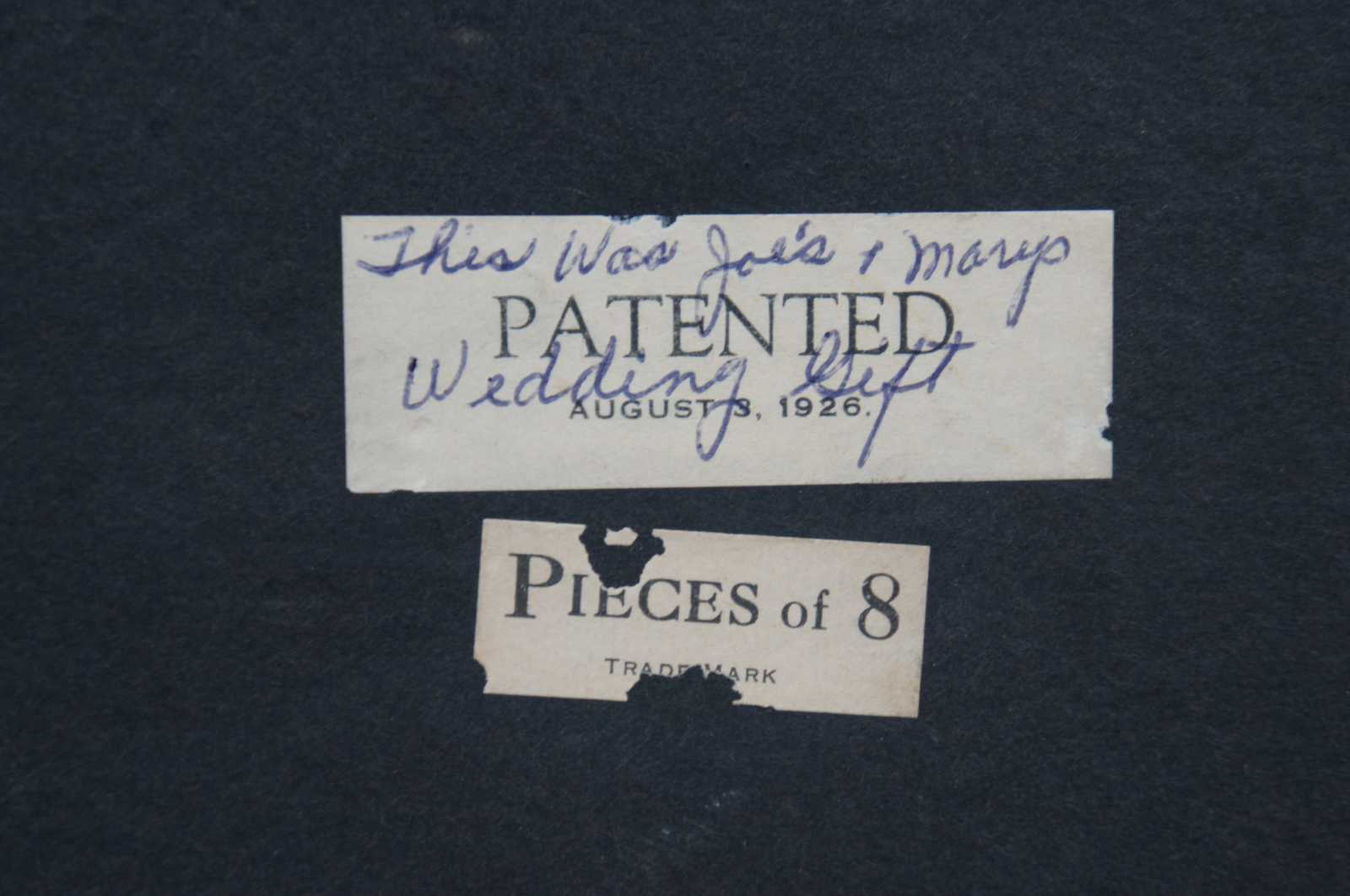 Antique vanity or serving tray with a carved and painted wood frame, brass handles and glass over a green and black marbled surface. Produced by Pieces of 8, trademarked 1926.