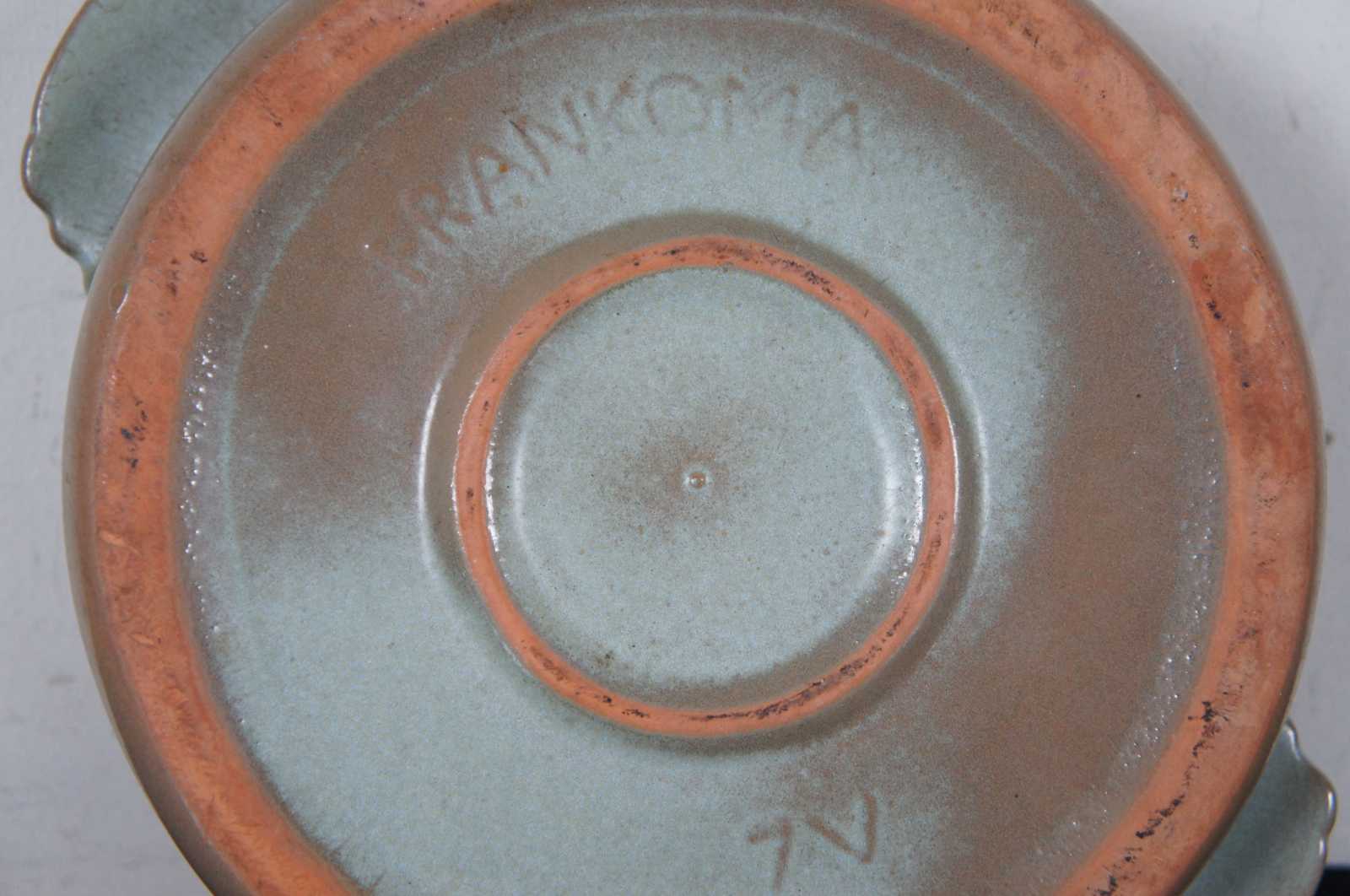 Lot of six assorted vintage Frankoma pottery pieces. Lot includes: pink lidded casserole dish #5W, green lidded Aztec casserole dish #7V, brown & green footed planter #22, brown footed scalloped vase #65, brown flared pedestal vase #F35, and small green creamer pitcher #40A.
