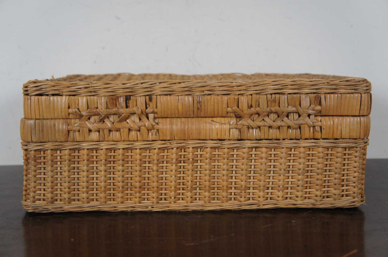 Vintage woven wicker suitcase or picnic basket with peg and loop closure.