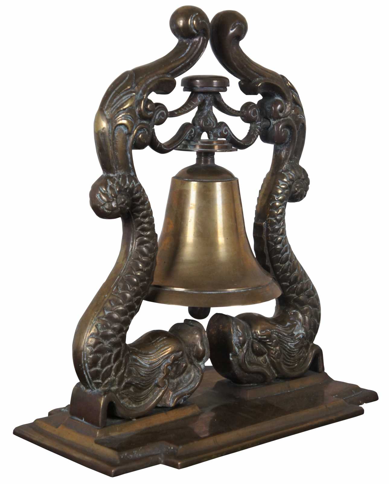 Features two dolphins supporting a bell on intergal molded base. Bell is functional, and has loud tone.