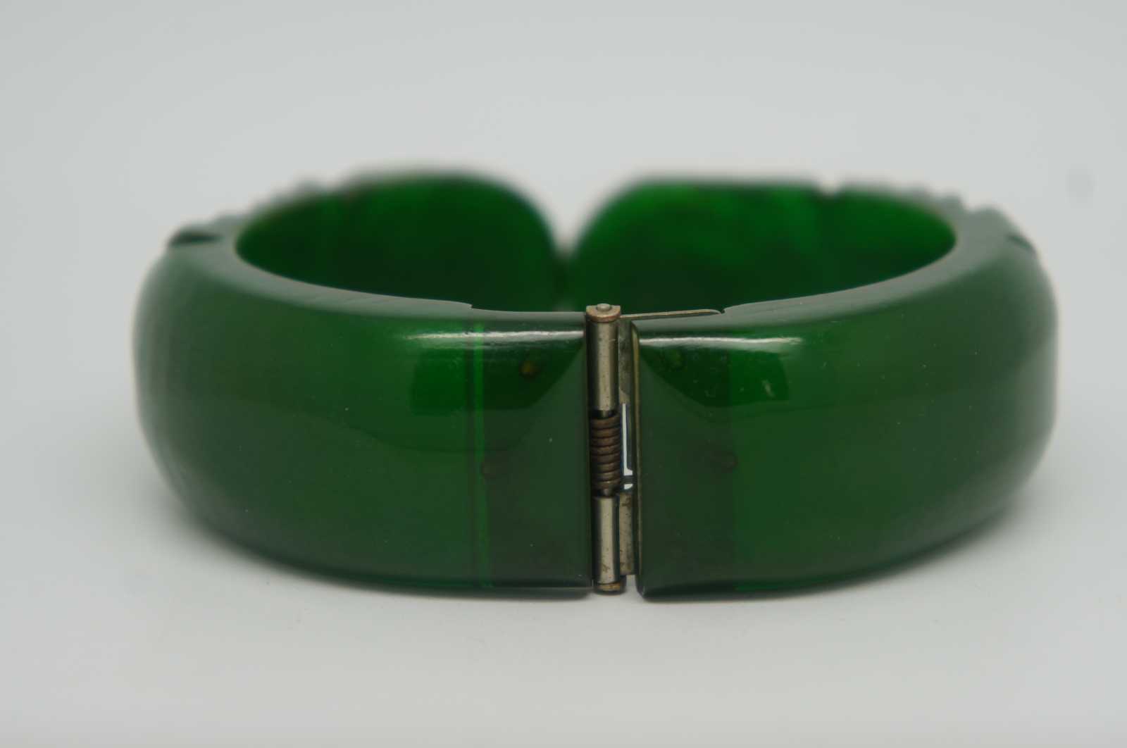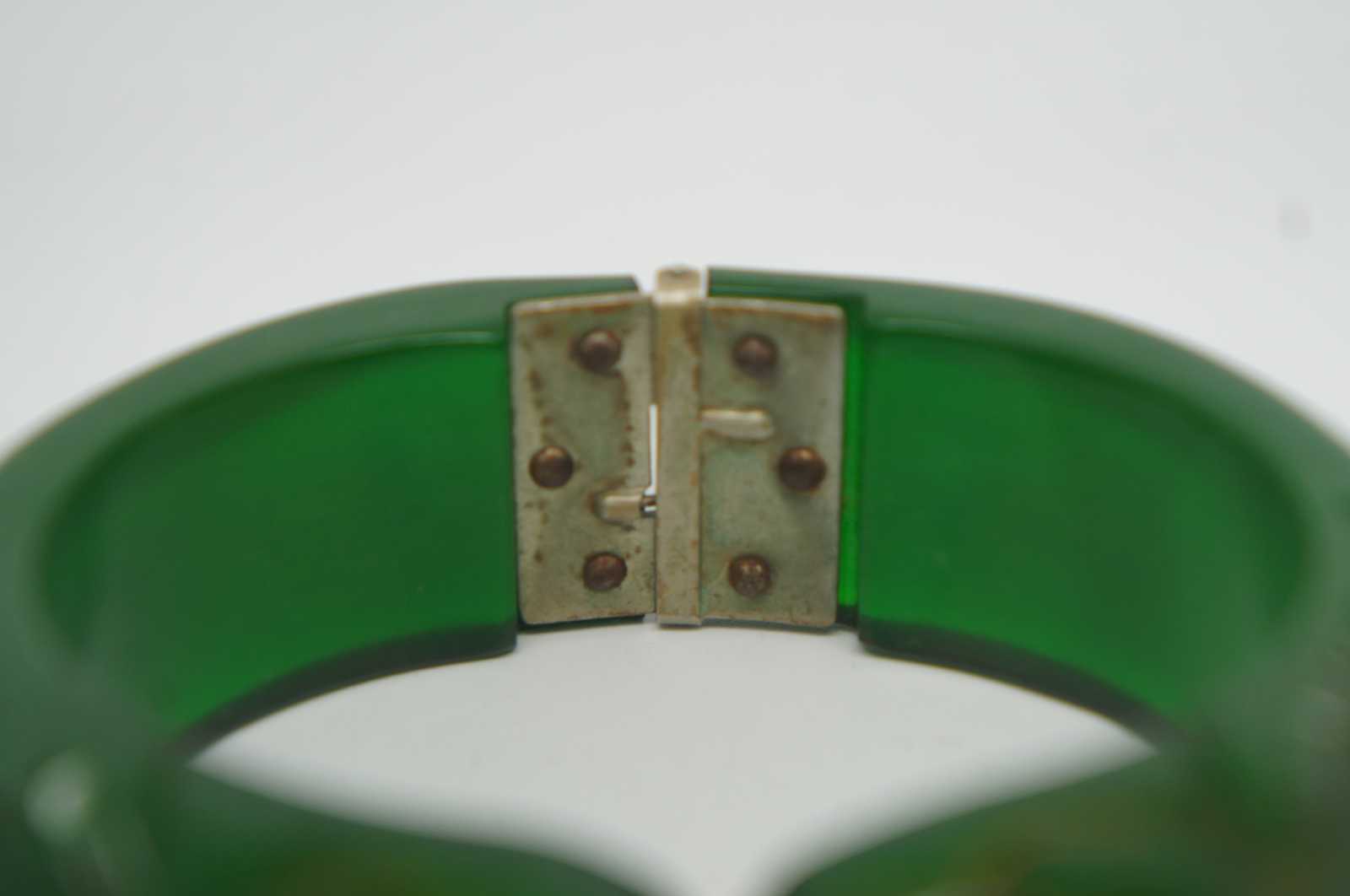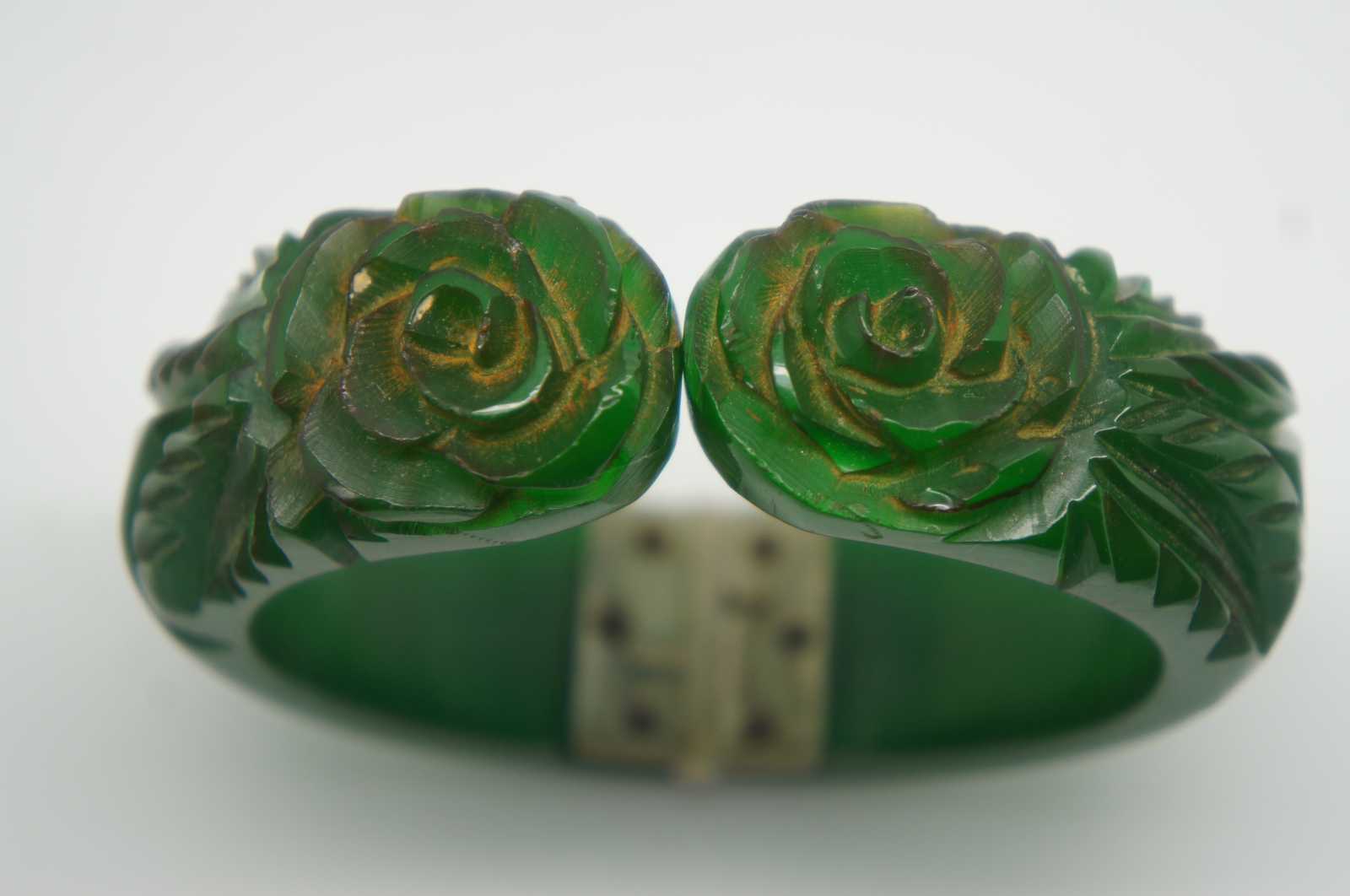 Early to mid 20th century Bakelite clamper bracelet in semi-translucent green with carved roses and spring hinge.