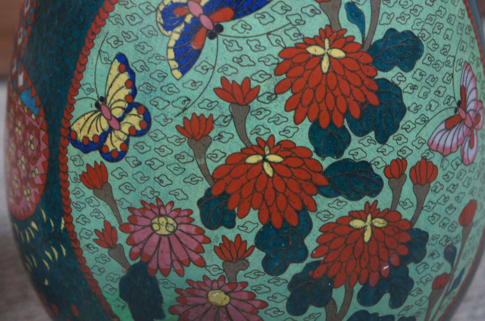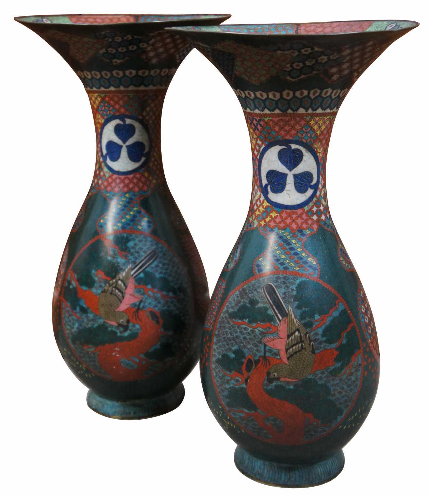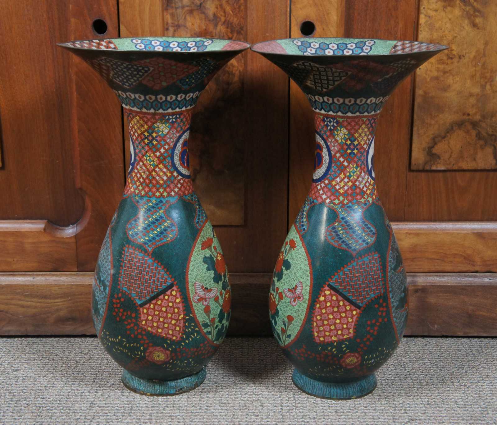 Pair of monumental Kaji Tsunekichi enameled cloisonne vases with wide flared mouths, decorated in intricate red and green floral designs, butterflies and birds. Each is heavily worked with meticulous detail.