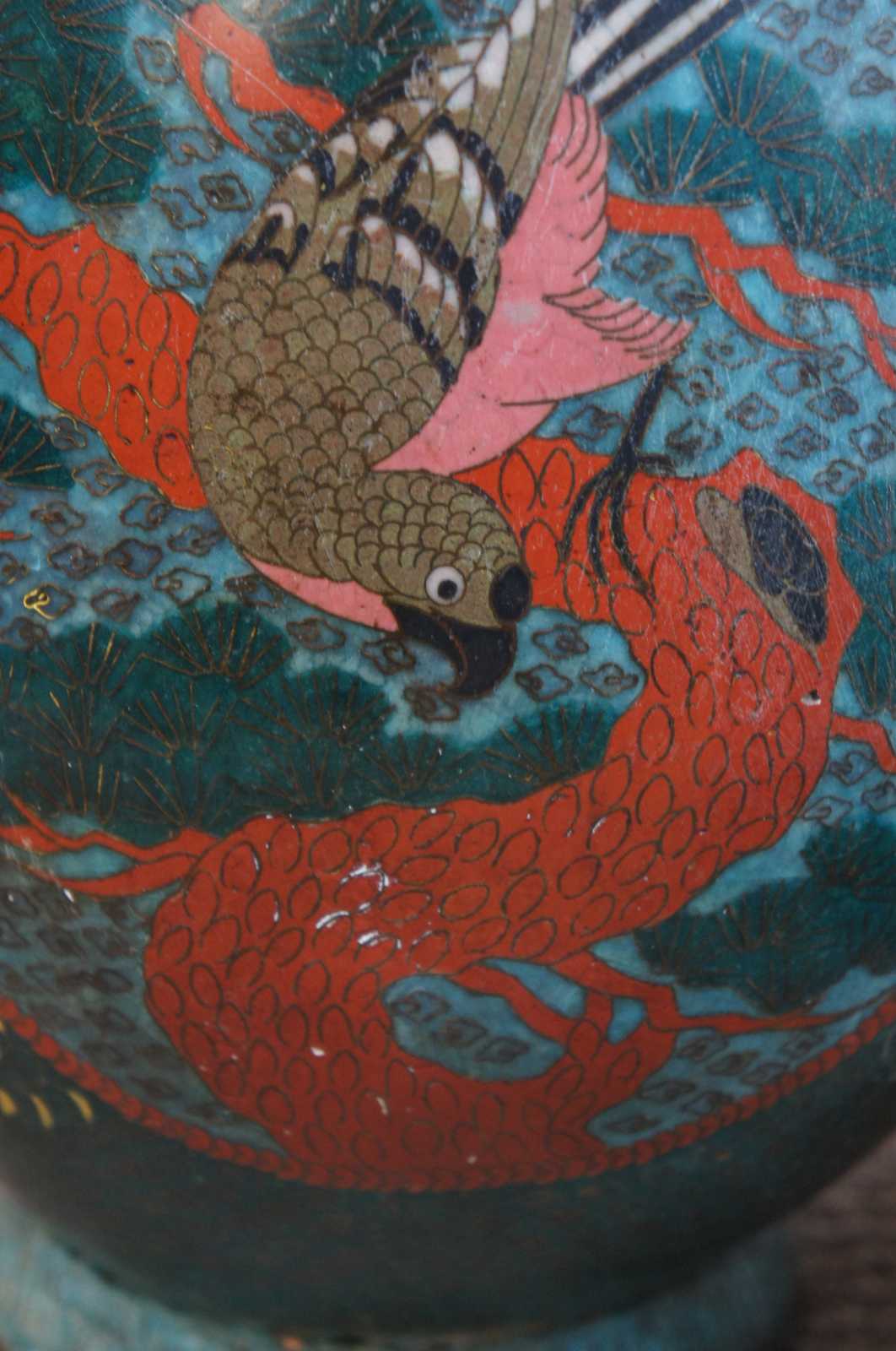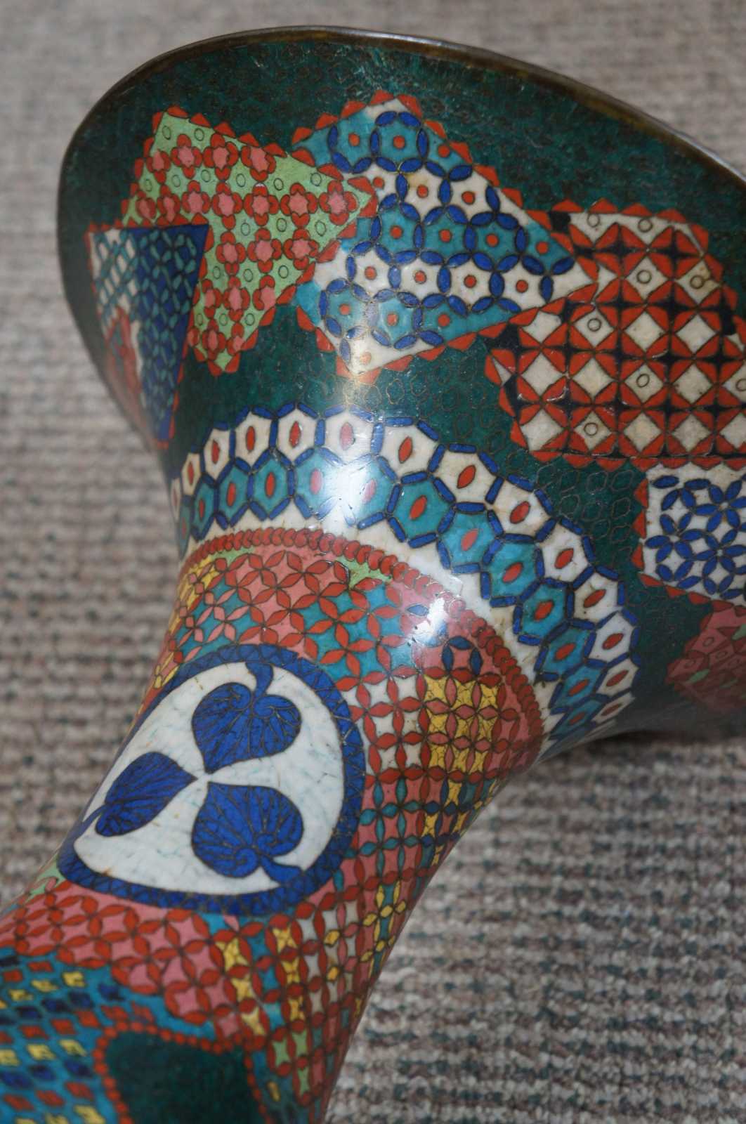 By the mid-1850s he was sufficiently confident take on pupils and by the late 1850s was appointed official cloisonné maker to the daimyō (feudal chief) of Owari. He based his designs on the motifs and colour-schemes of Chinese cloisonné enamels and his early works are characterized by the use of a larger number of background wires. These were decorative, forming an integral part of the design, and practical in that they prevented the enamels from running during firing. Kaji’s pieces stop short of absolute mastery. They are both breathtakingly beautiful and made to a stunning level of technical perfection.
