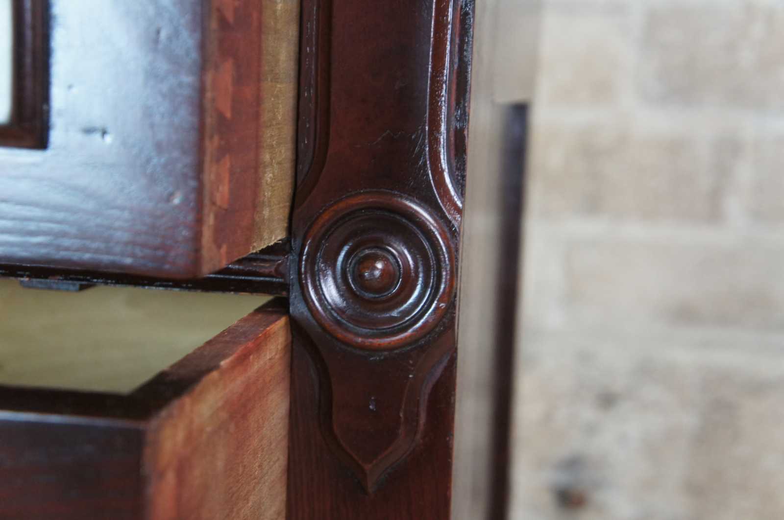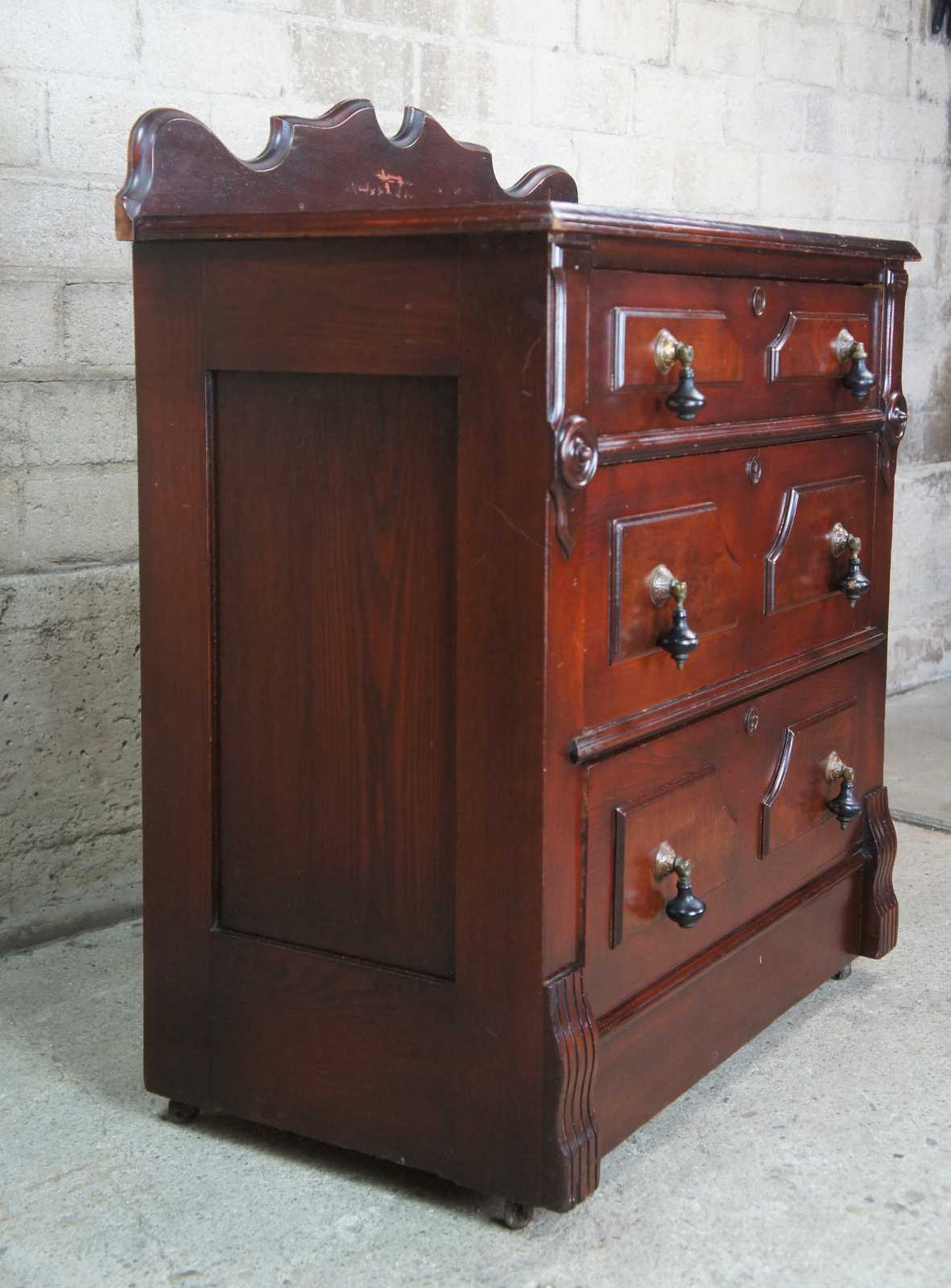 Antique Eastlake Victorian parlor washstand or chest. Made of pine featuring three paneled walnut burl drawers with ebonized teardrop pulls with brass rosettes, carved accents, serpentine backsplash and casters.