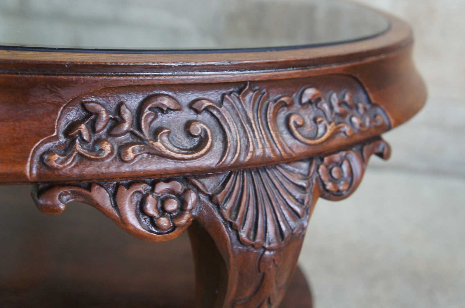 Antique Imperial Furniture coffee table featuring oval and serpentine form with inset smoked glass top, carved floral accents, and cabriole legs.