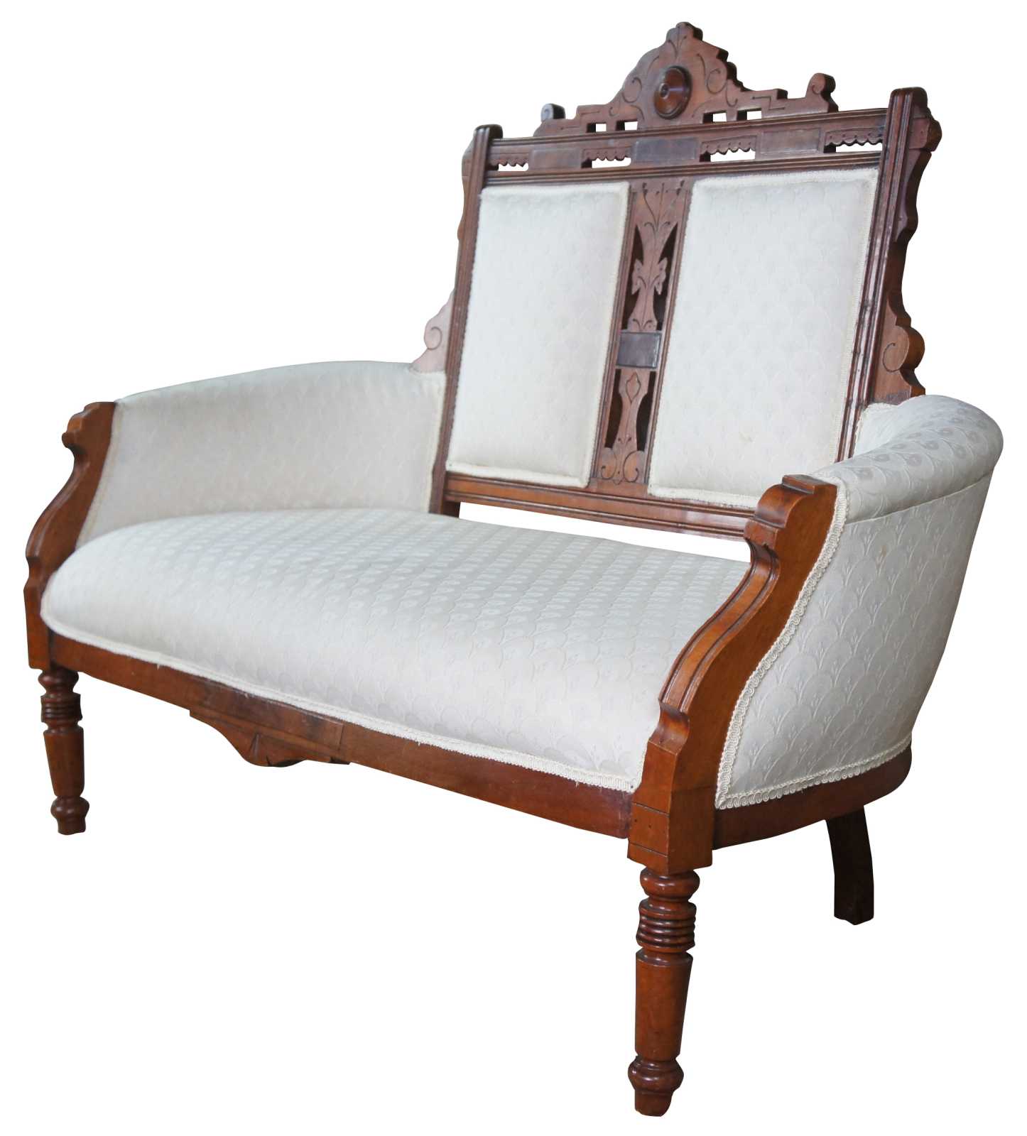 Antique Victorian Eastlake parlor settee or love seat. Made of walnut featuring a flare of Renaissance Revival with carved pierced back and frame with turned legs supporting a wide frame and white upholstery.