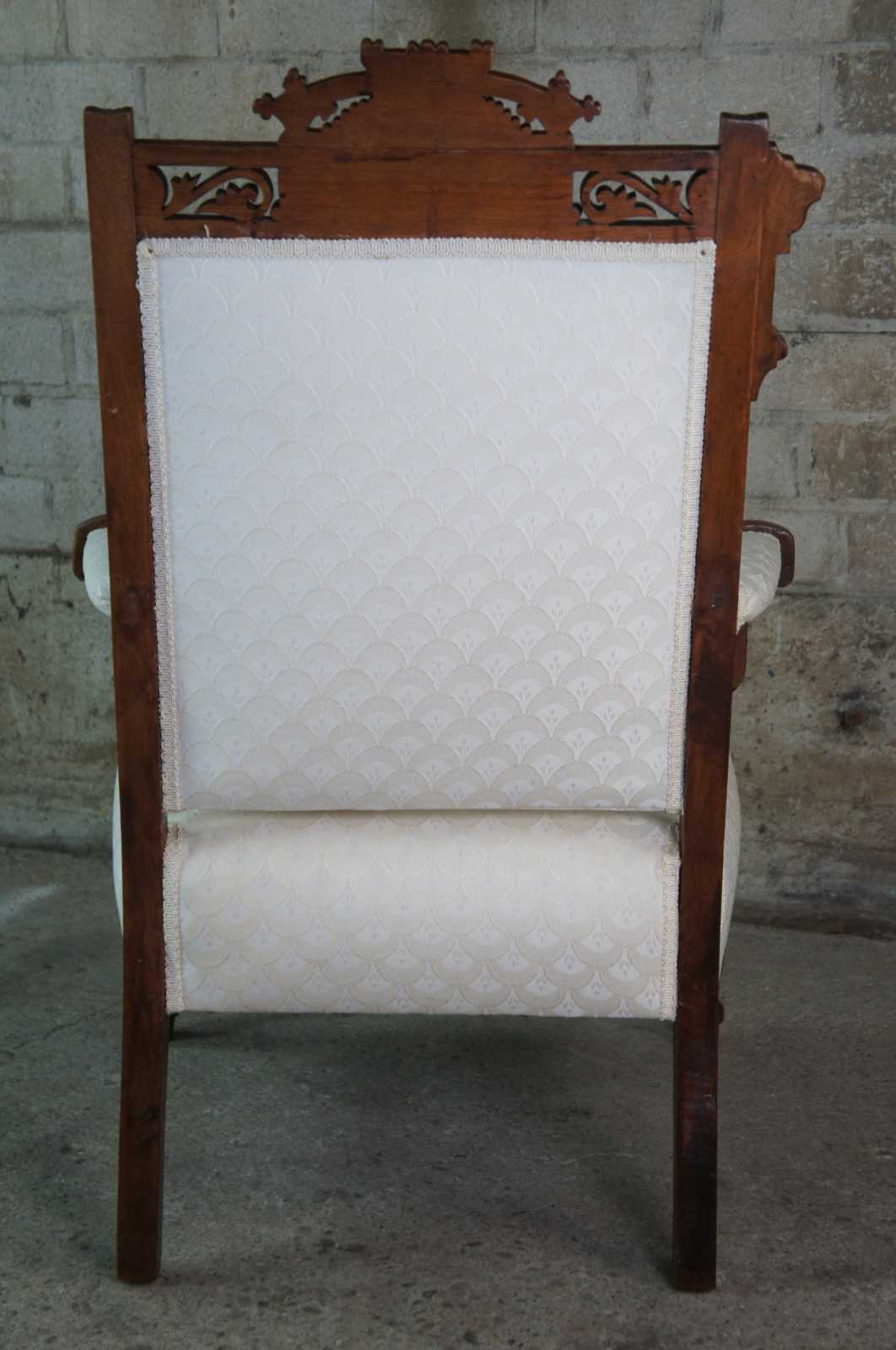 Antique Victorian parlor armchair. Made of walnut with carved Eastlake accents that features reticulated floral, turned and fluted accents/