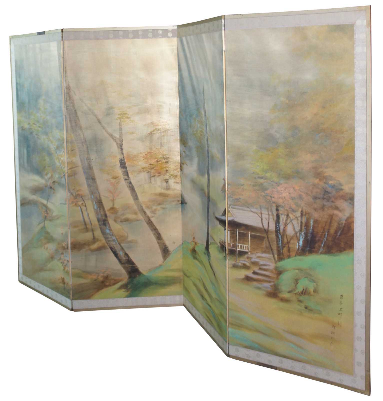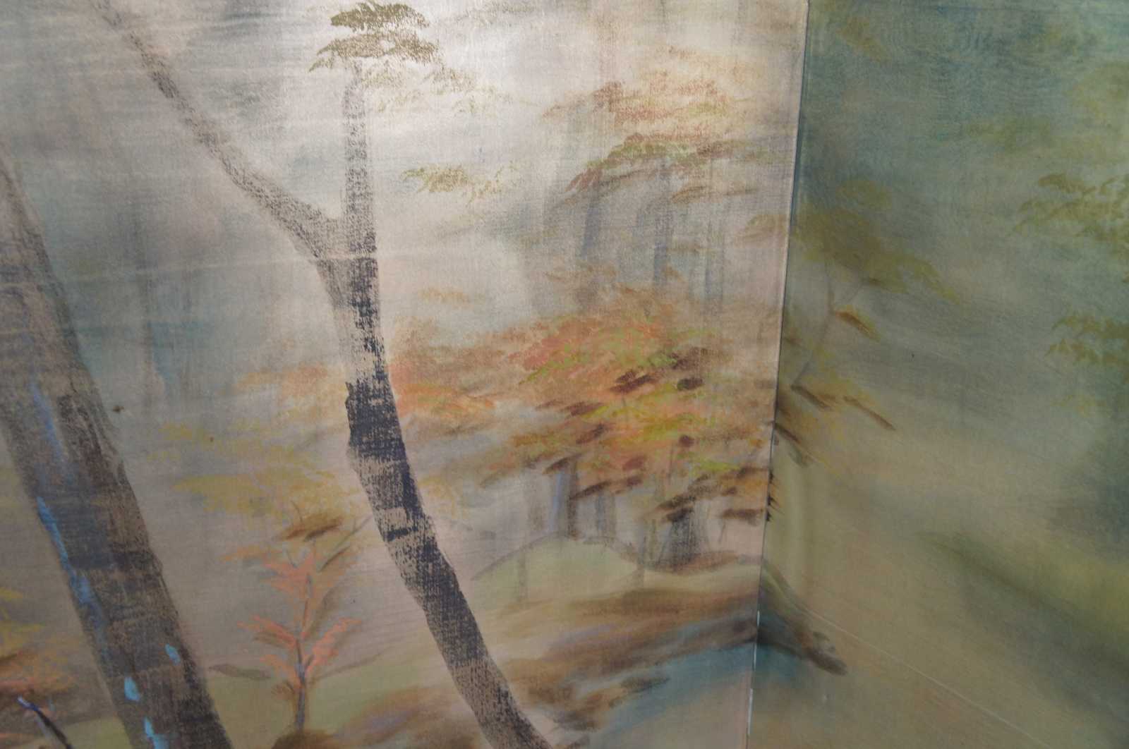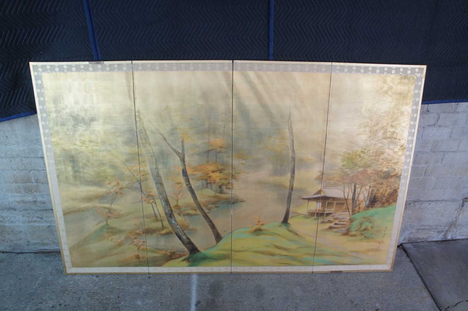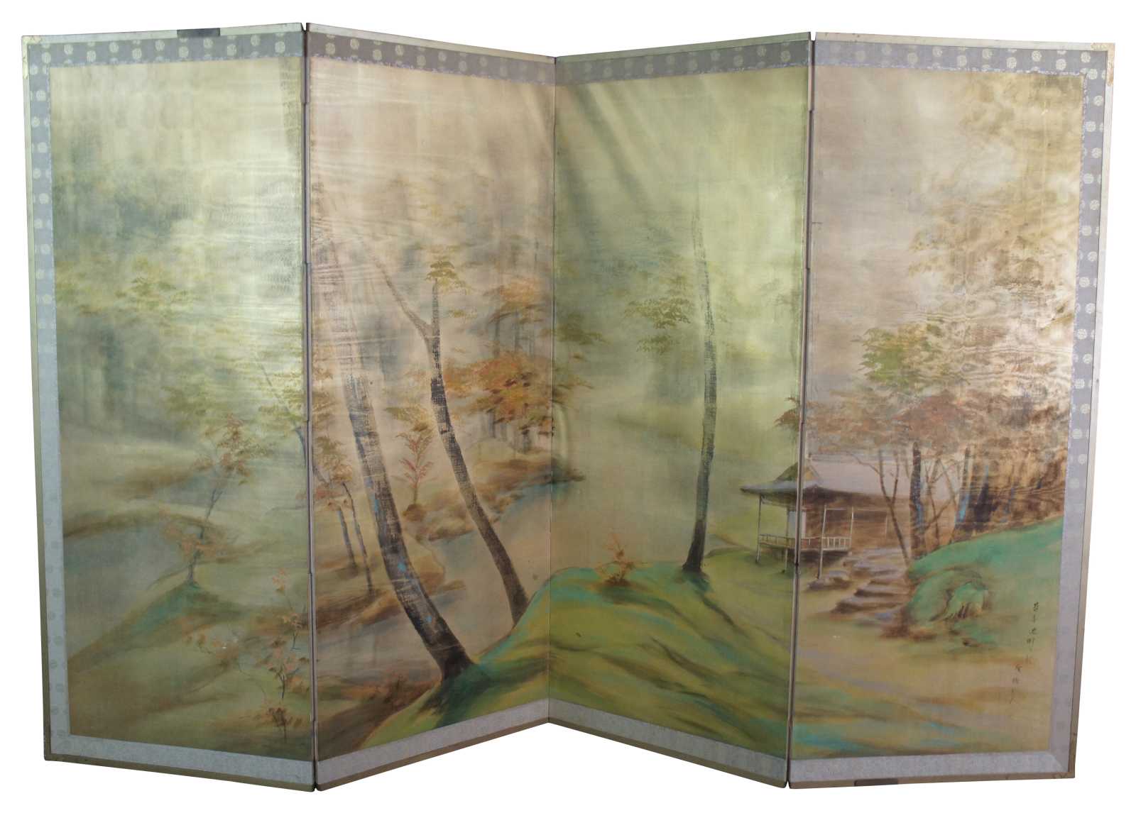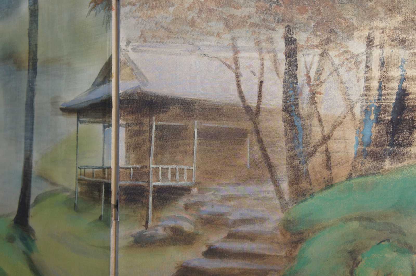 Mid 20th century Chinese four panel wall divider or screen. Painted on silk featuring a murky foiled forest landscape scene with a stilted cabin along a river. Signed lower right.