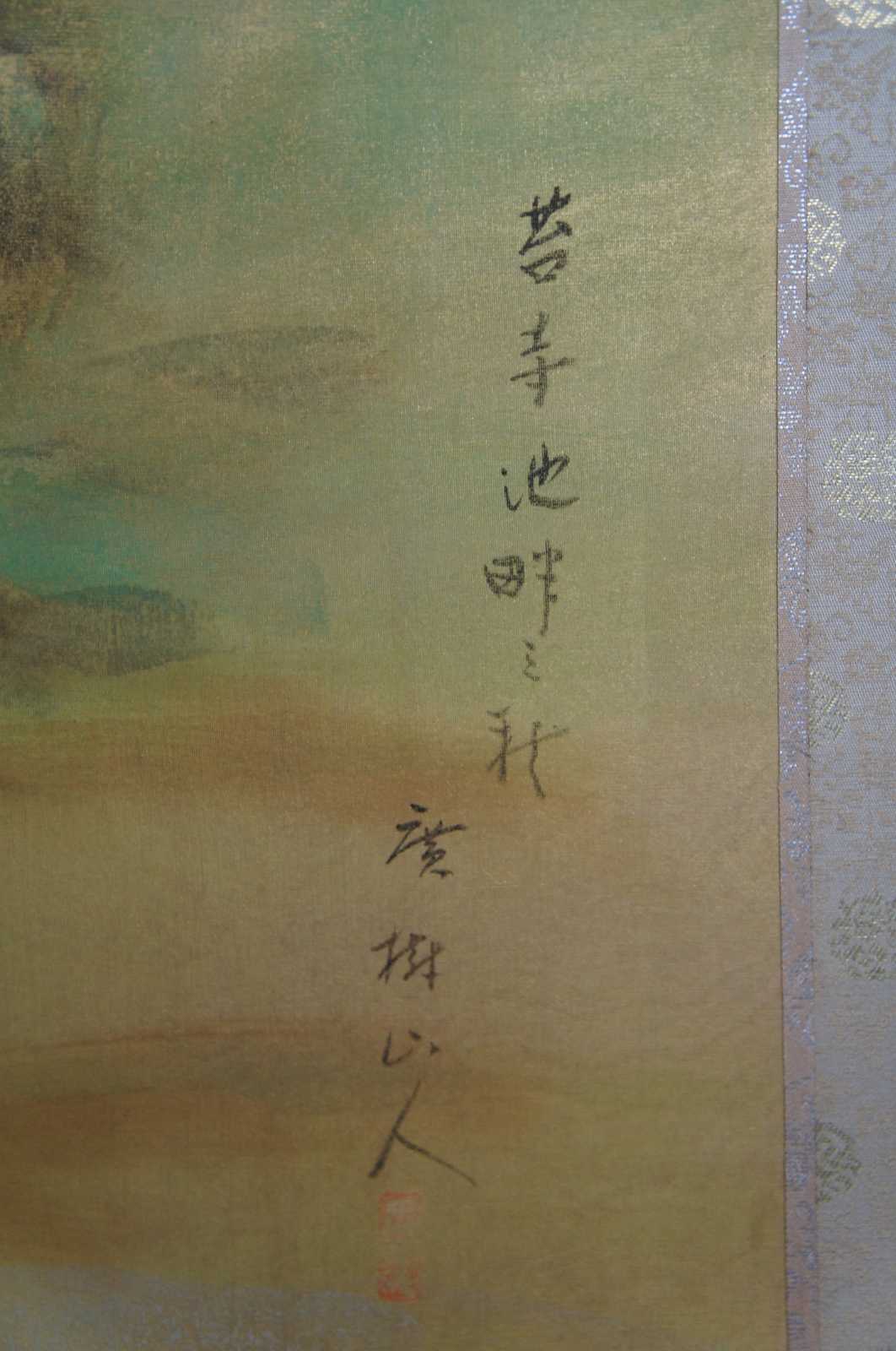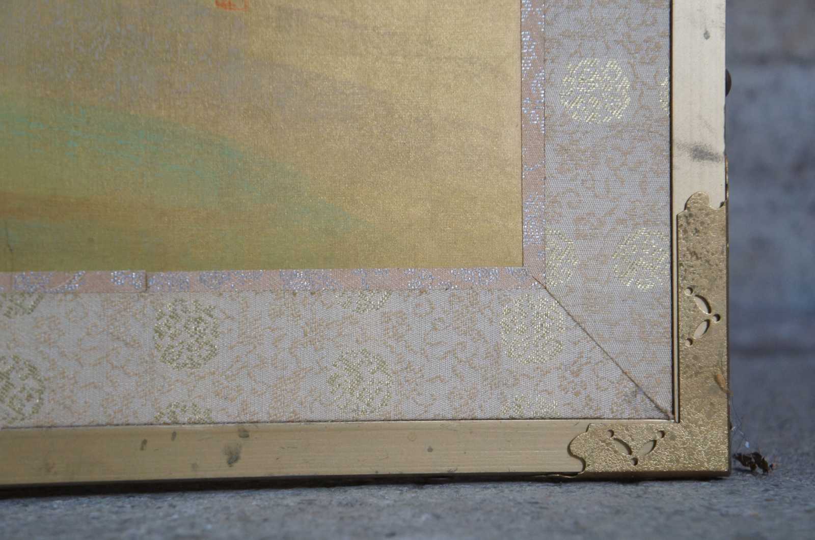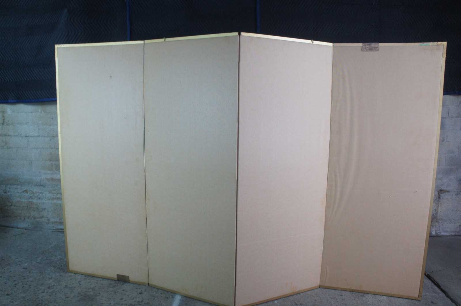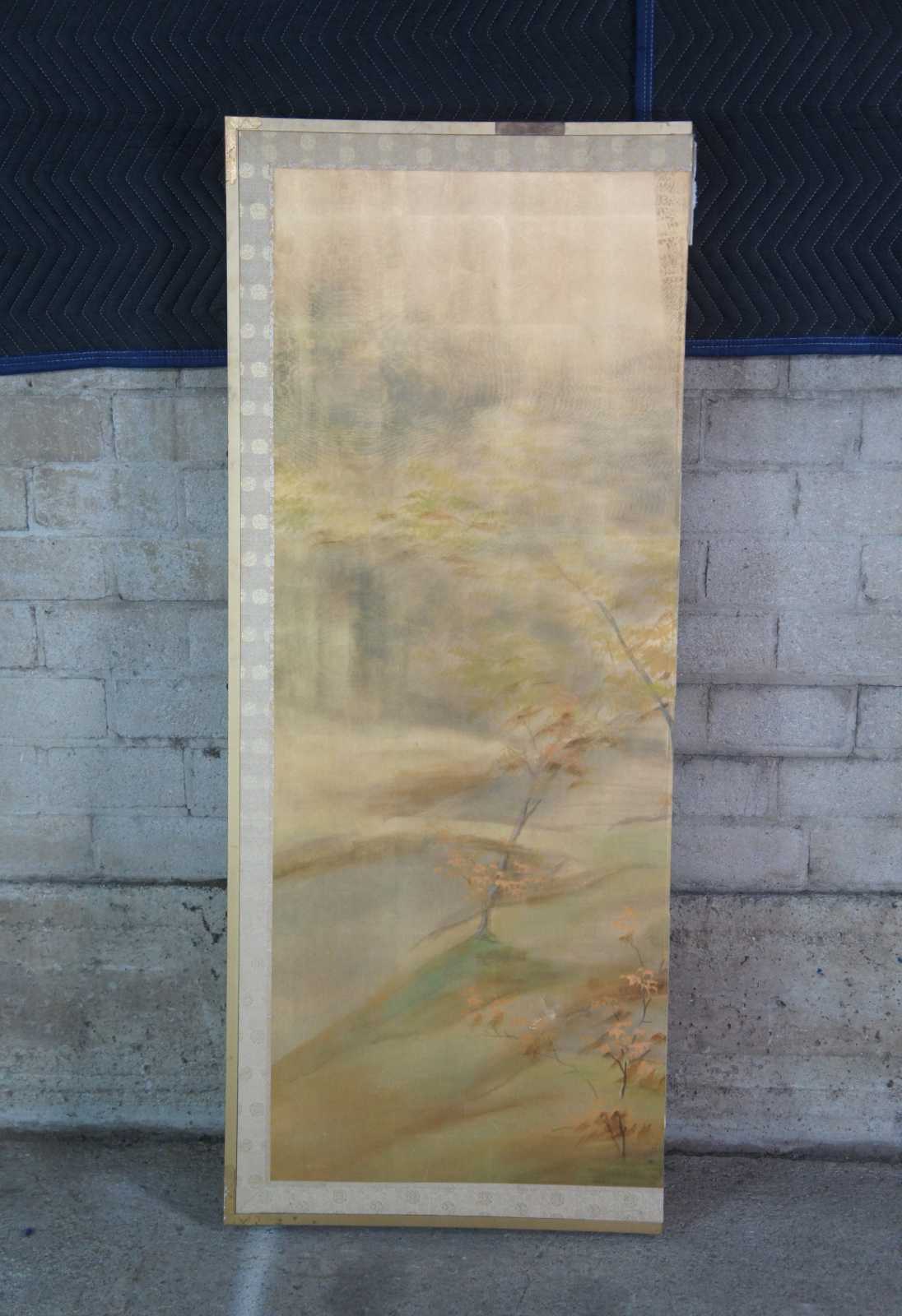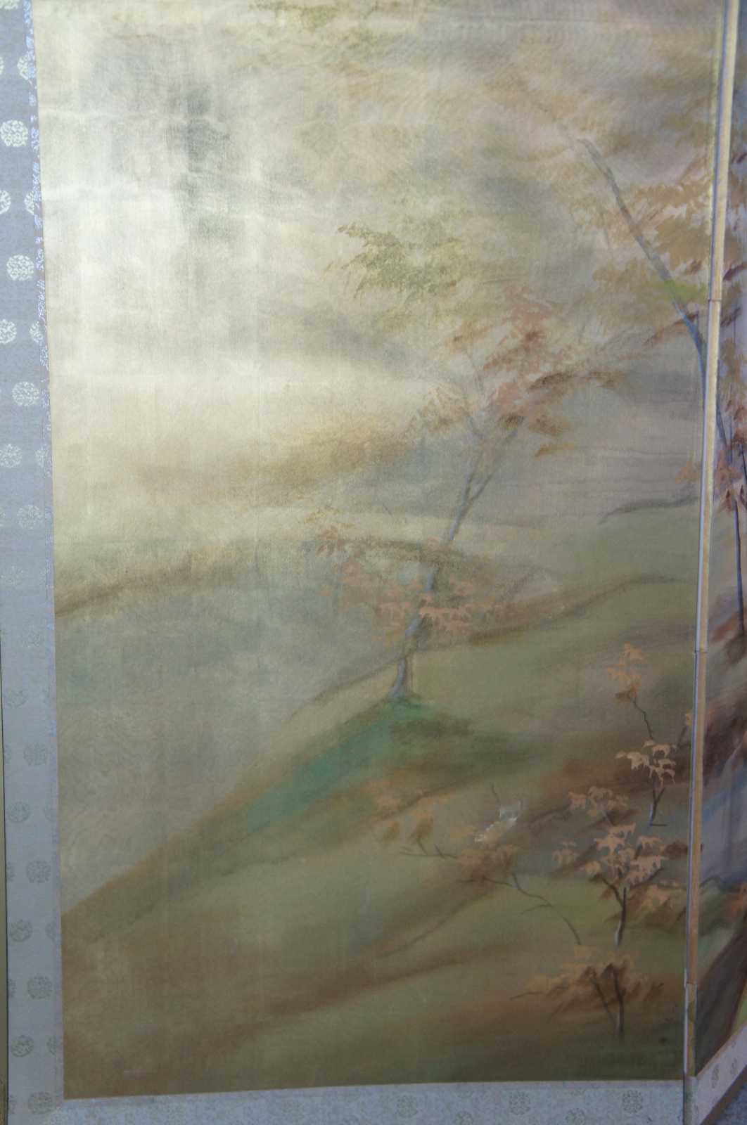 Mid 20th century Chinese four panel wall divider or screen. Painted on silk featuring a murky foiled forest landscape scene with a stilted cabin along a river. Signed lower right.