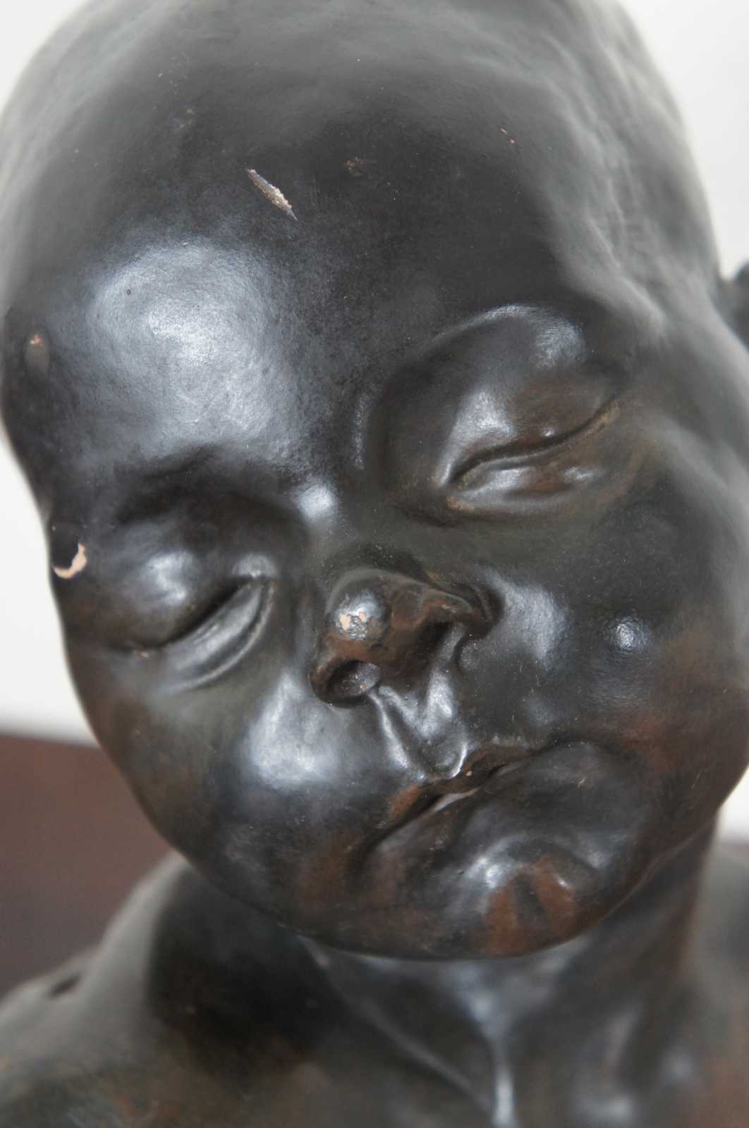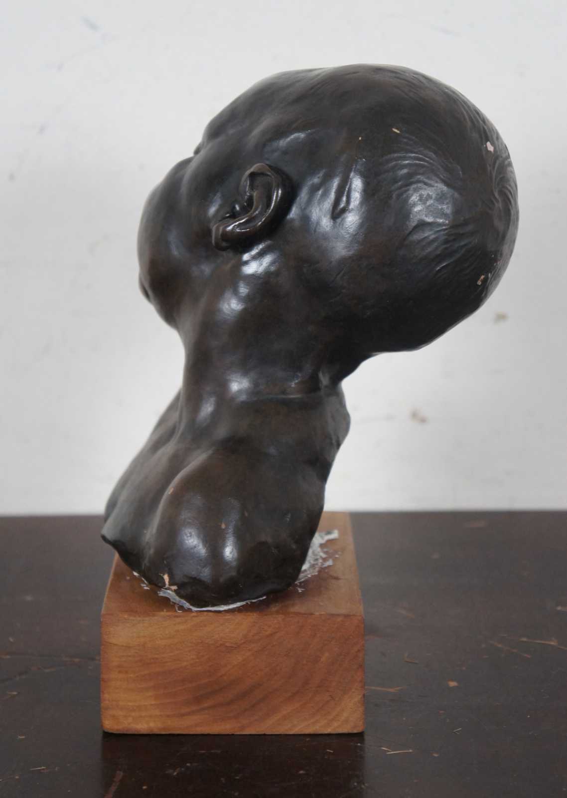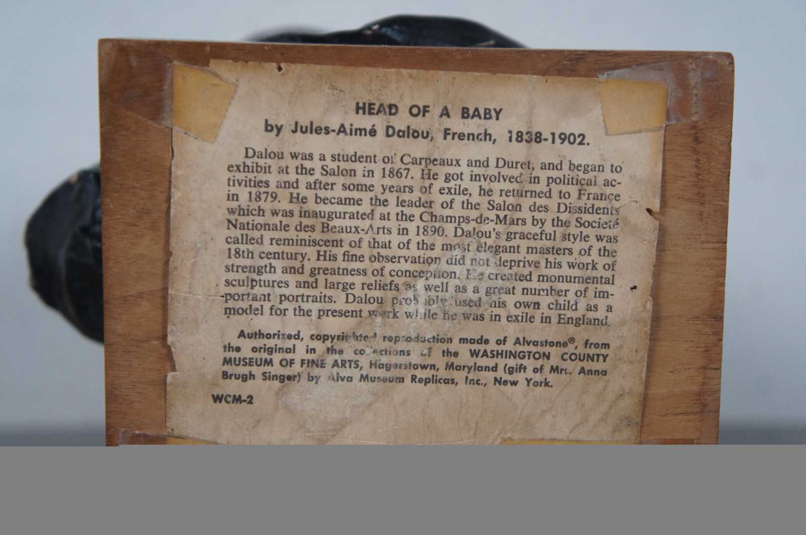 Vintage Alvastone reproduction desktop or bookshelf sculpture by Alva Museum Replicas of the Head of a Sleeping Baby sculpture by Jules Dalou. “Aime-Jules Dalou (1838-1902) was a French sculptor, recognized as one of the most brilliant virtuosos of nineteenth-century France, admired for his perceptiveness, execution, and unpretentious realism.