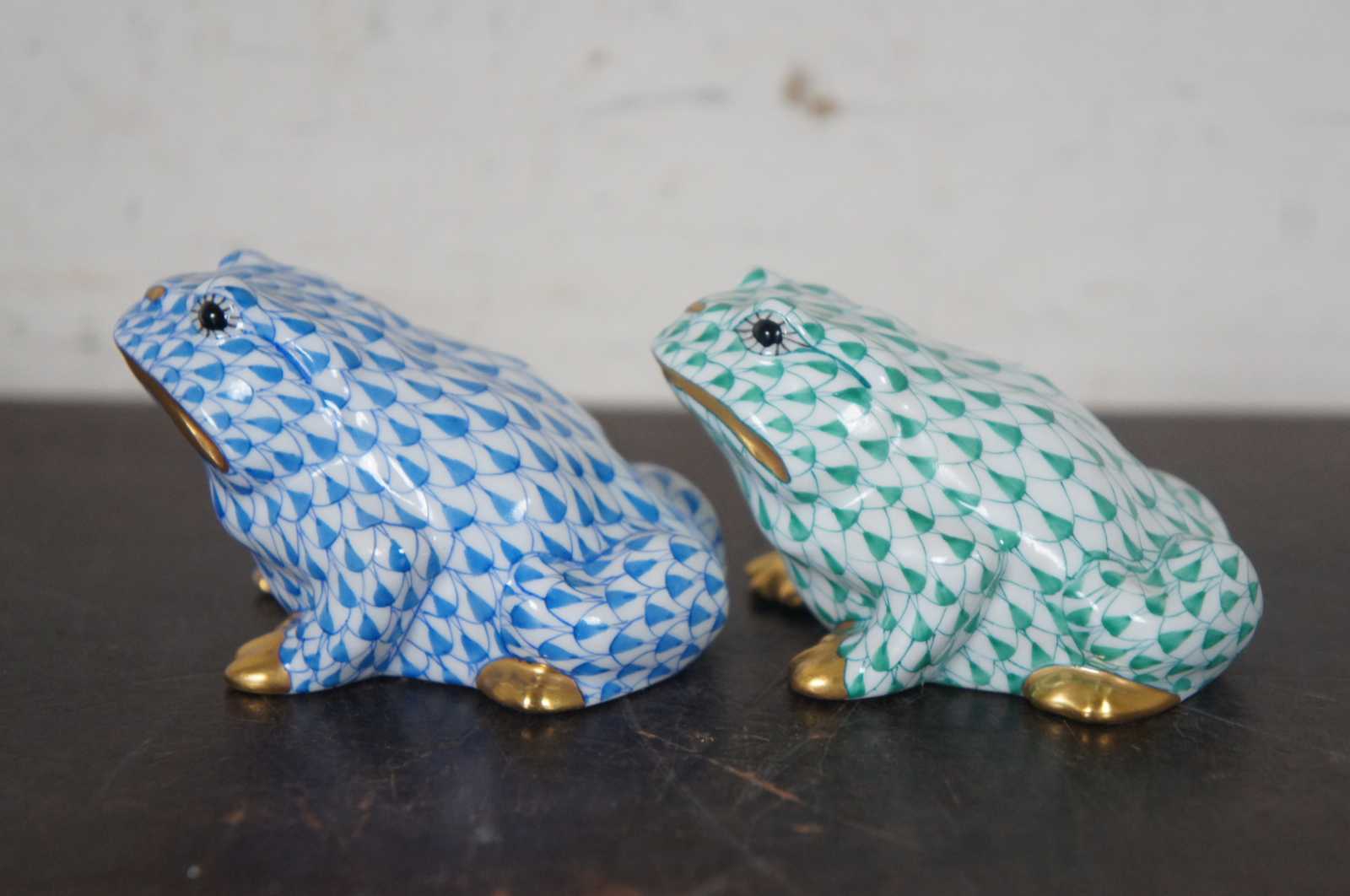 Pair of Herend Hungary fishnet hand painted patterned porcelain frogs or toads in blue and green with gold accents.