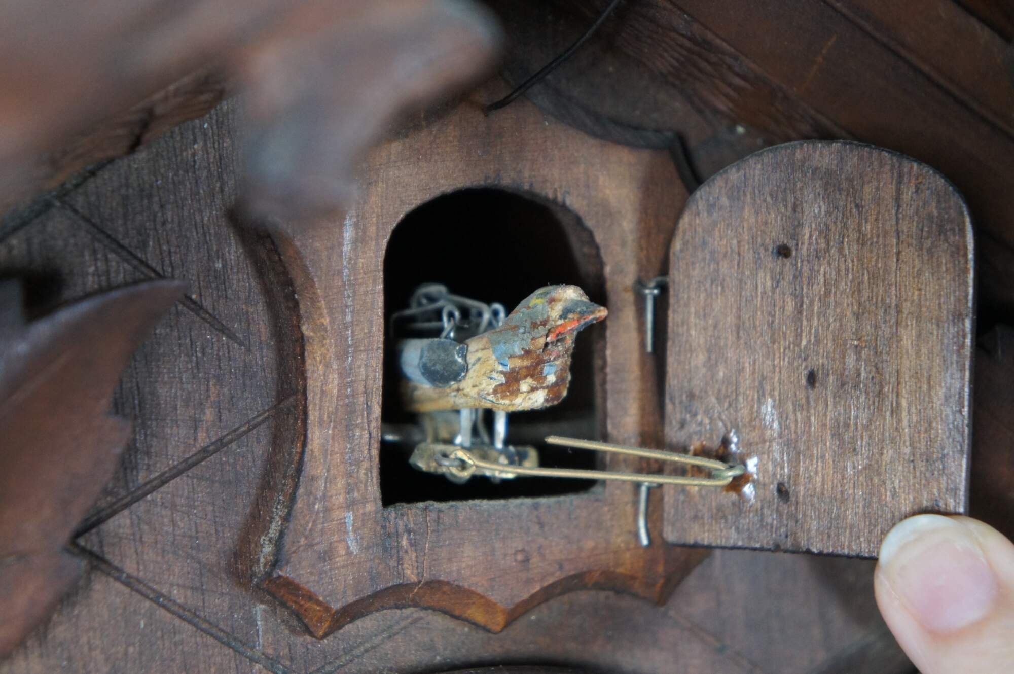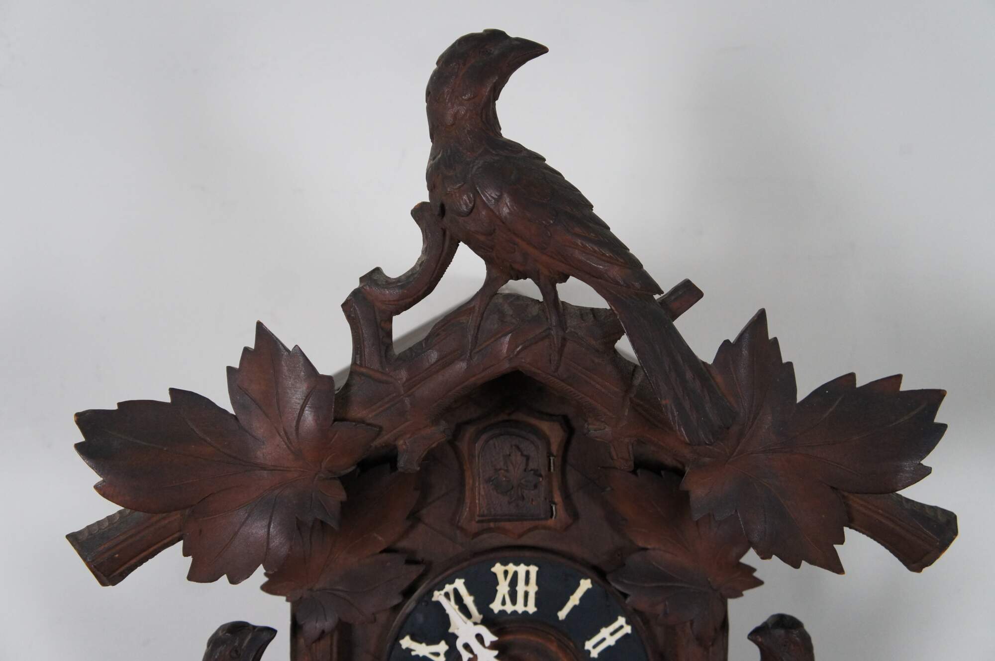 George Kuehl & Co. antique Black Forest carved wood cuckoo clock in the traditional house form, decorated with leaves and birds. Includes pine cone shaped weights and additional pendulum. works marked G.K. George Kuehl & Co., operated out of Chicago, Illinois. Circa 1910s.