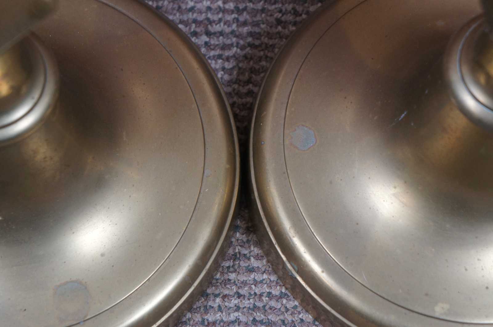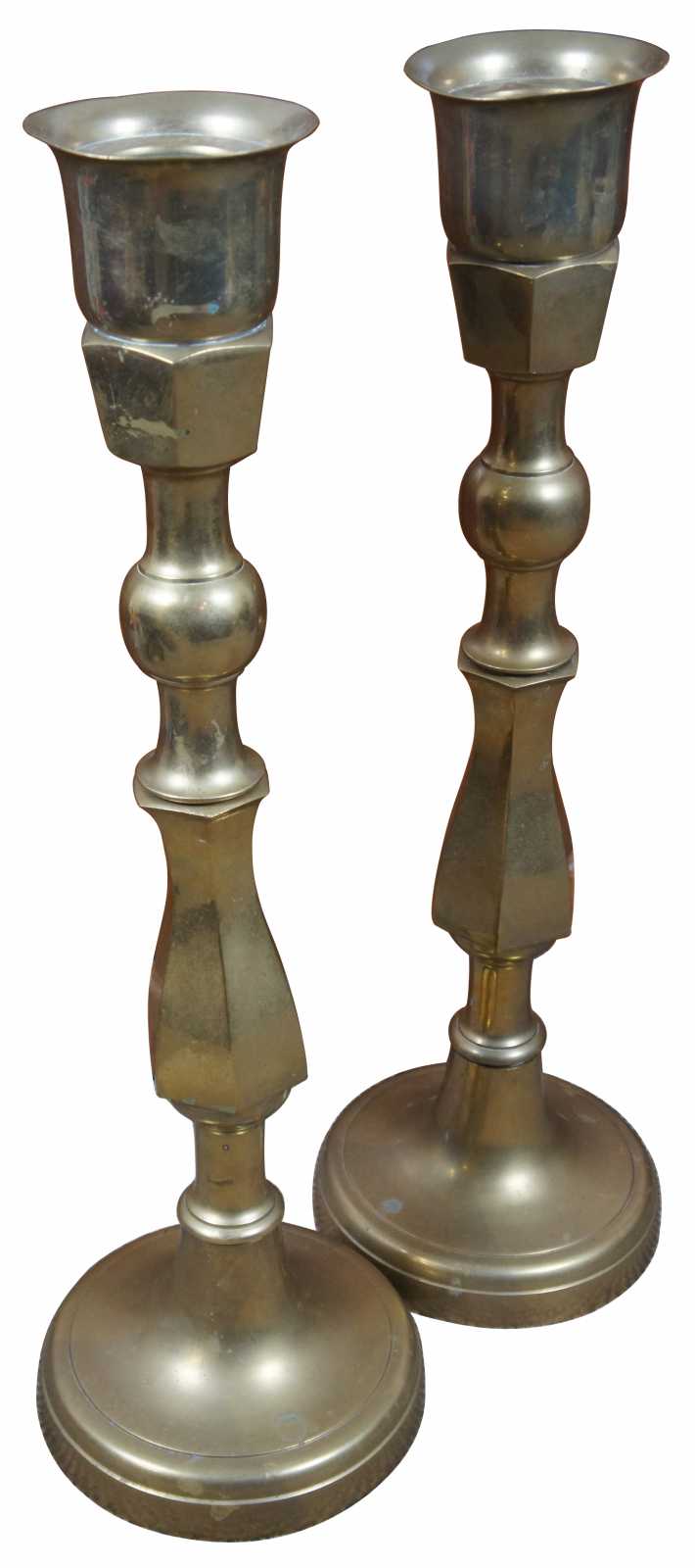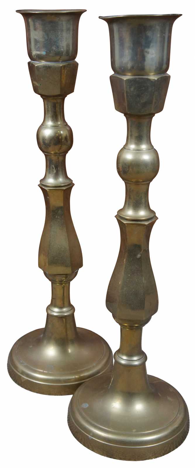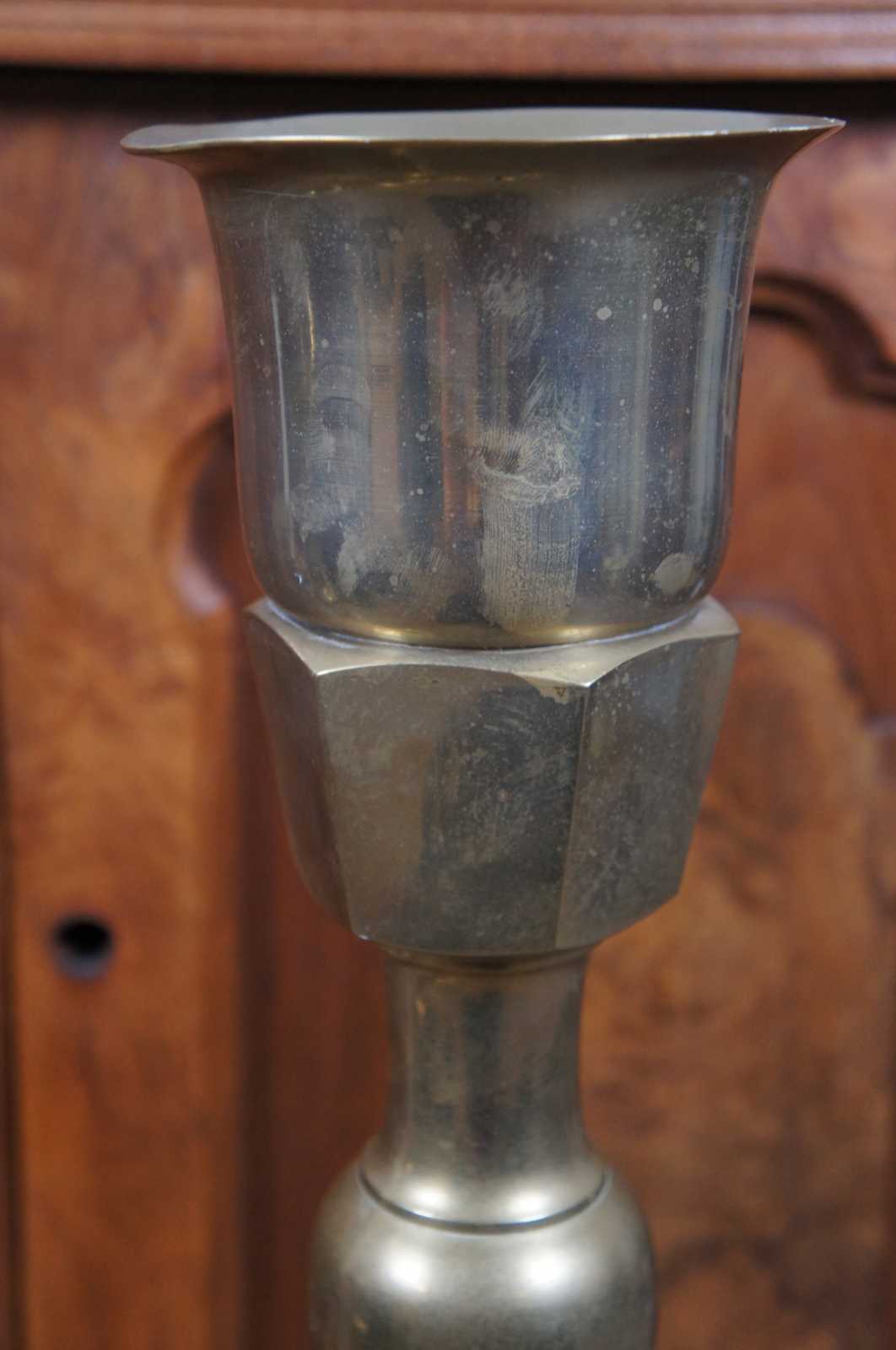 Pair of vintage made in India heavy brass altar candlesticks. Tops accommodate taper, votive or large pillar candlesticks.