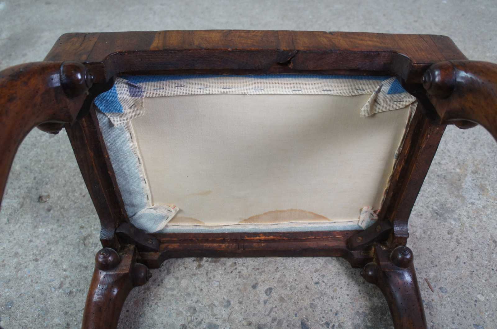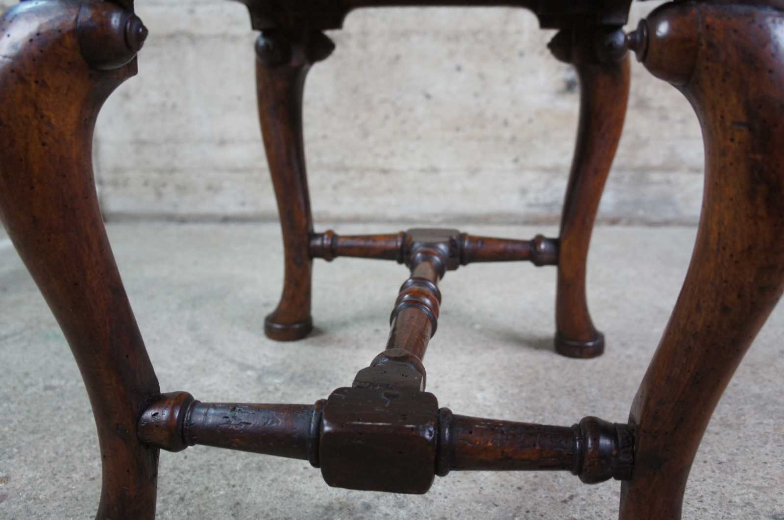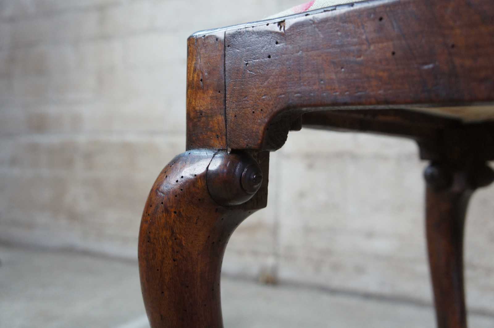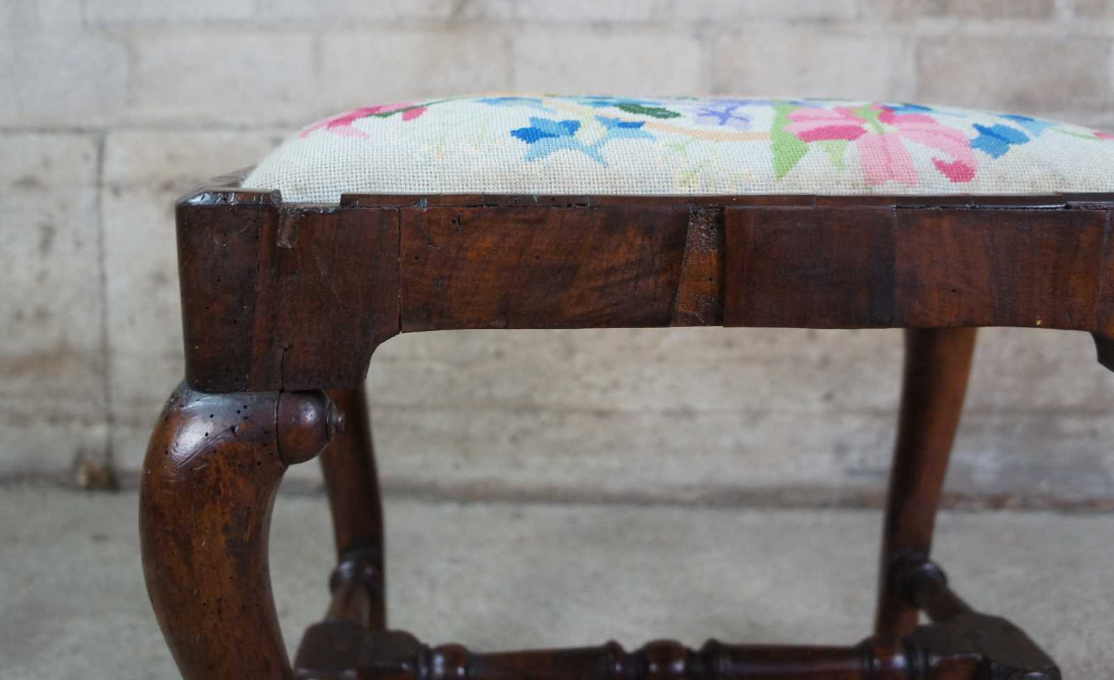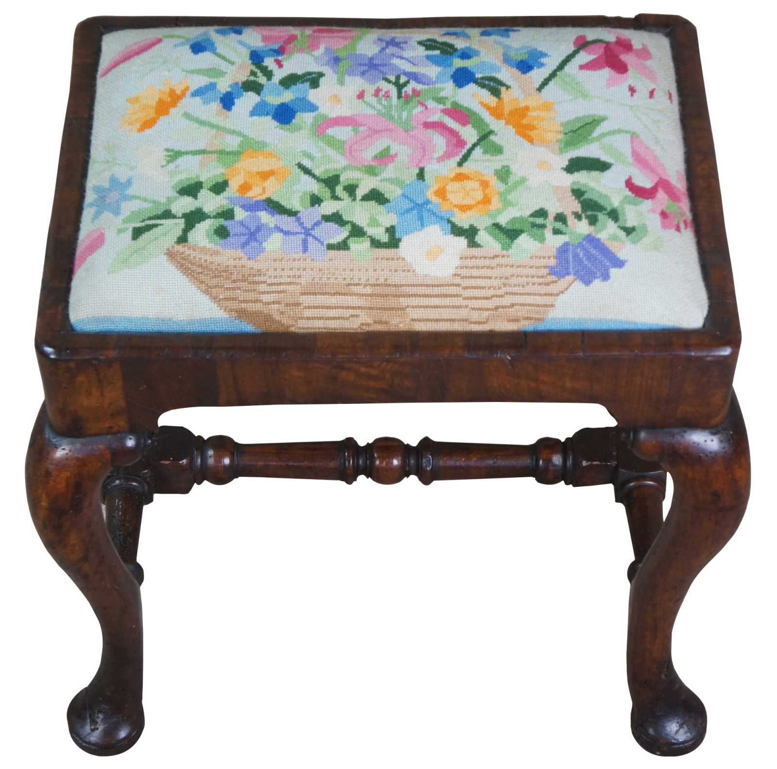 An exceptional 18th century Georgian Stool. A rectangular form made from Mahogany with floral needlepoint seat and cabriole legs with pad feet. Legs are connected by a turned H stretcher.