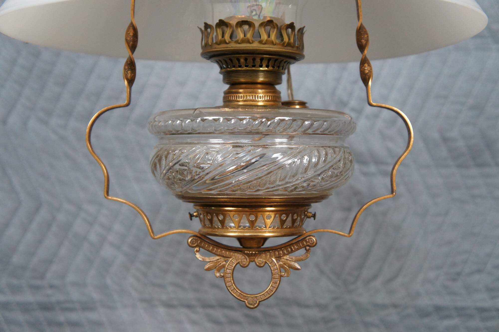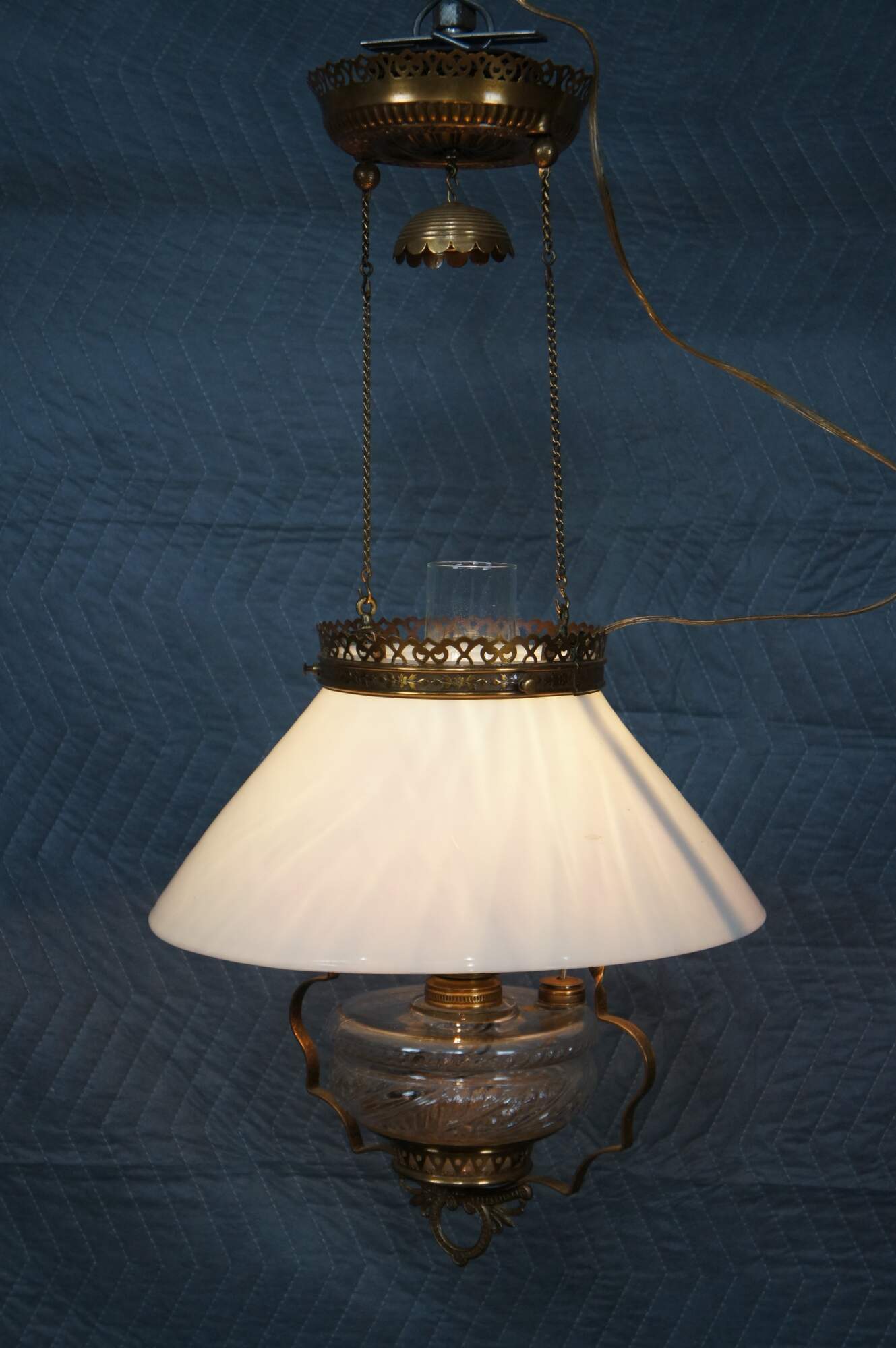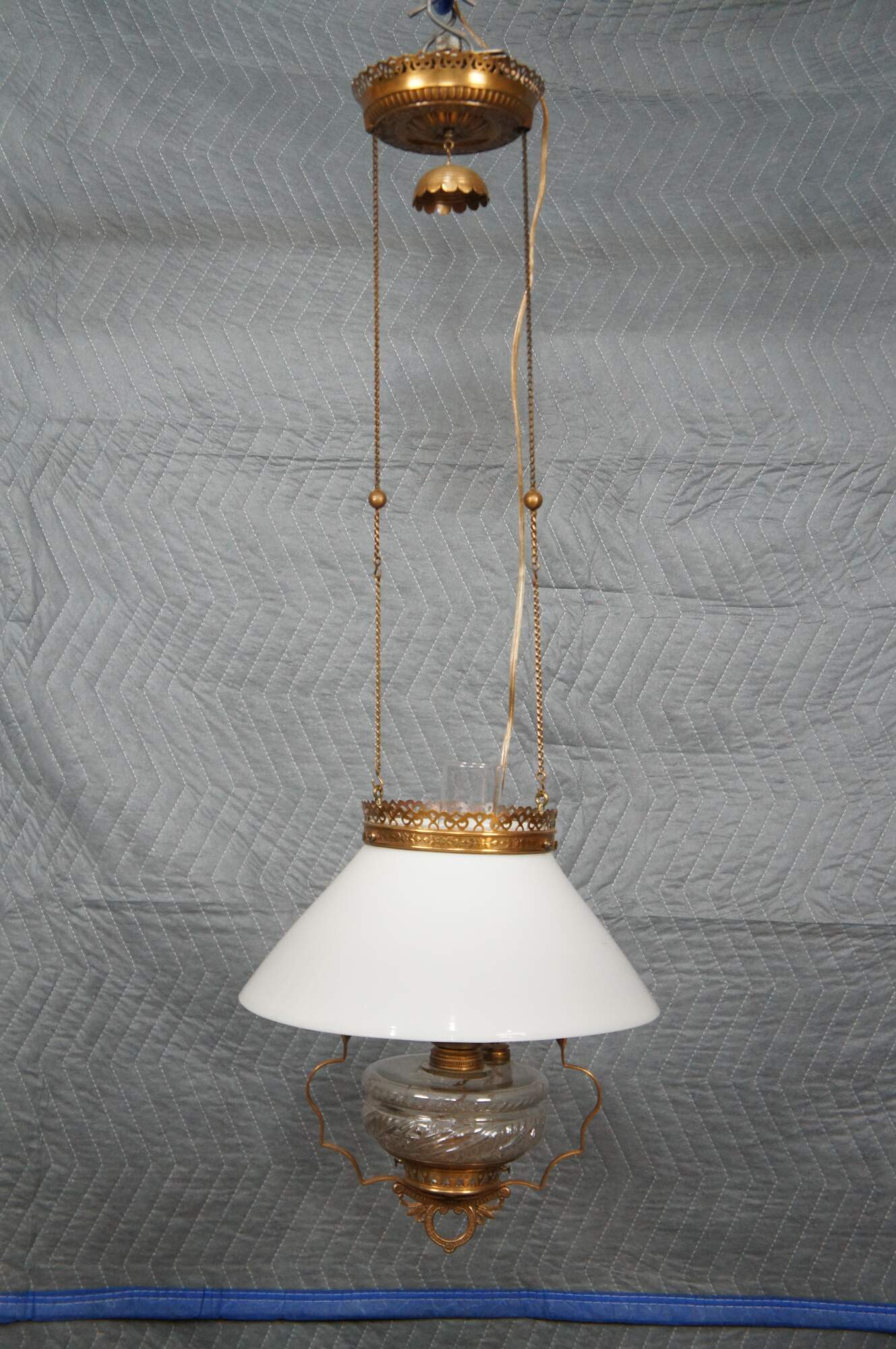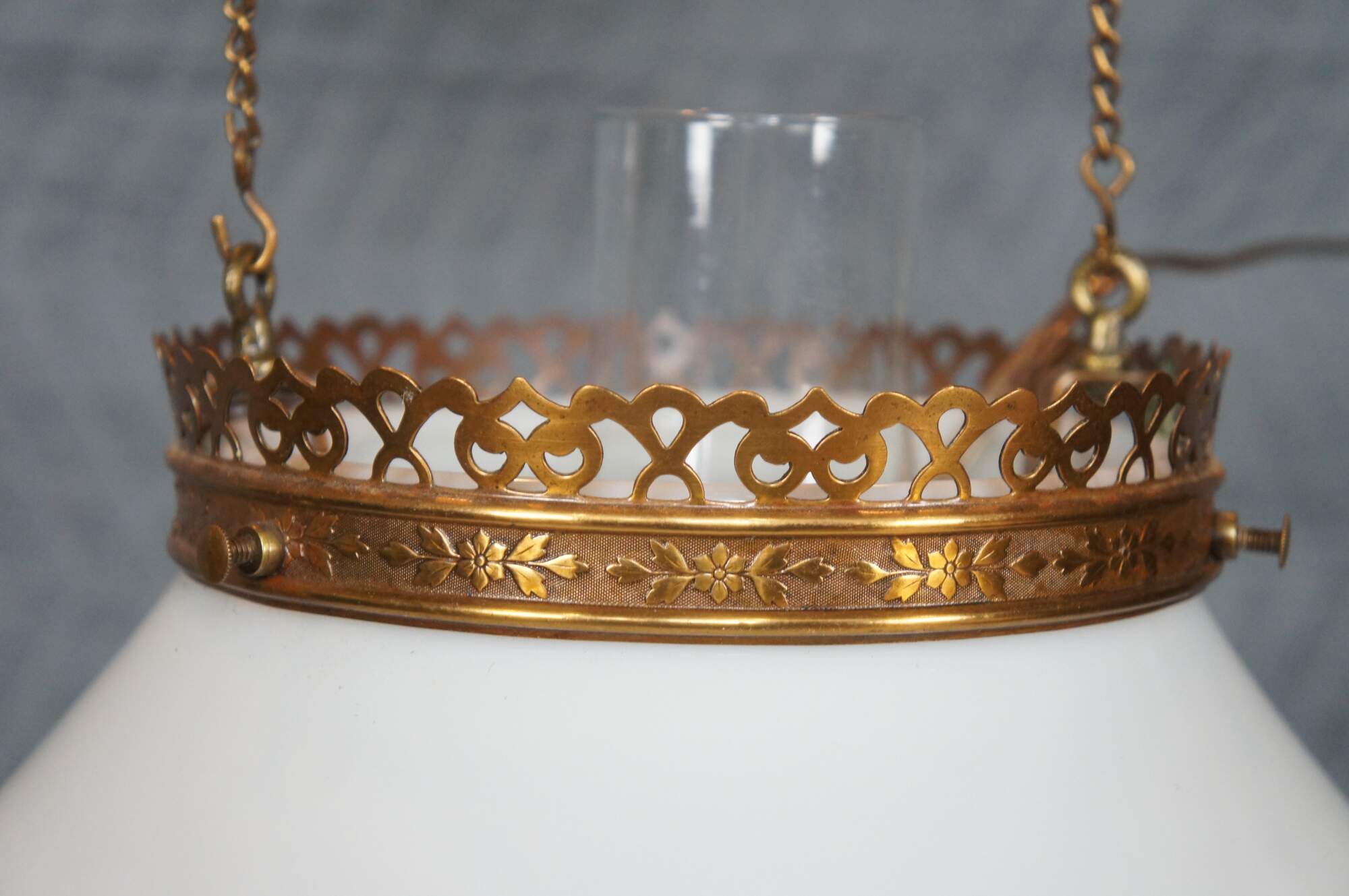 Antique late 19th century Aesthetic Movement cieling mounted parlor light / chandelier featuring pierced brass design with pressed glass oil reservoir, milk glass shade, clear hurricane and brass smoke bell. Suspends from cieling mount with two chains that can be pulled down or retracted up into the hidden spool / pulley to adjust the height - mechanism is fully functional. Originally oil but now converted to electric.