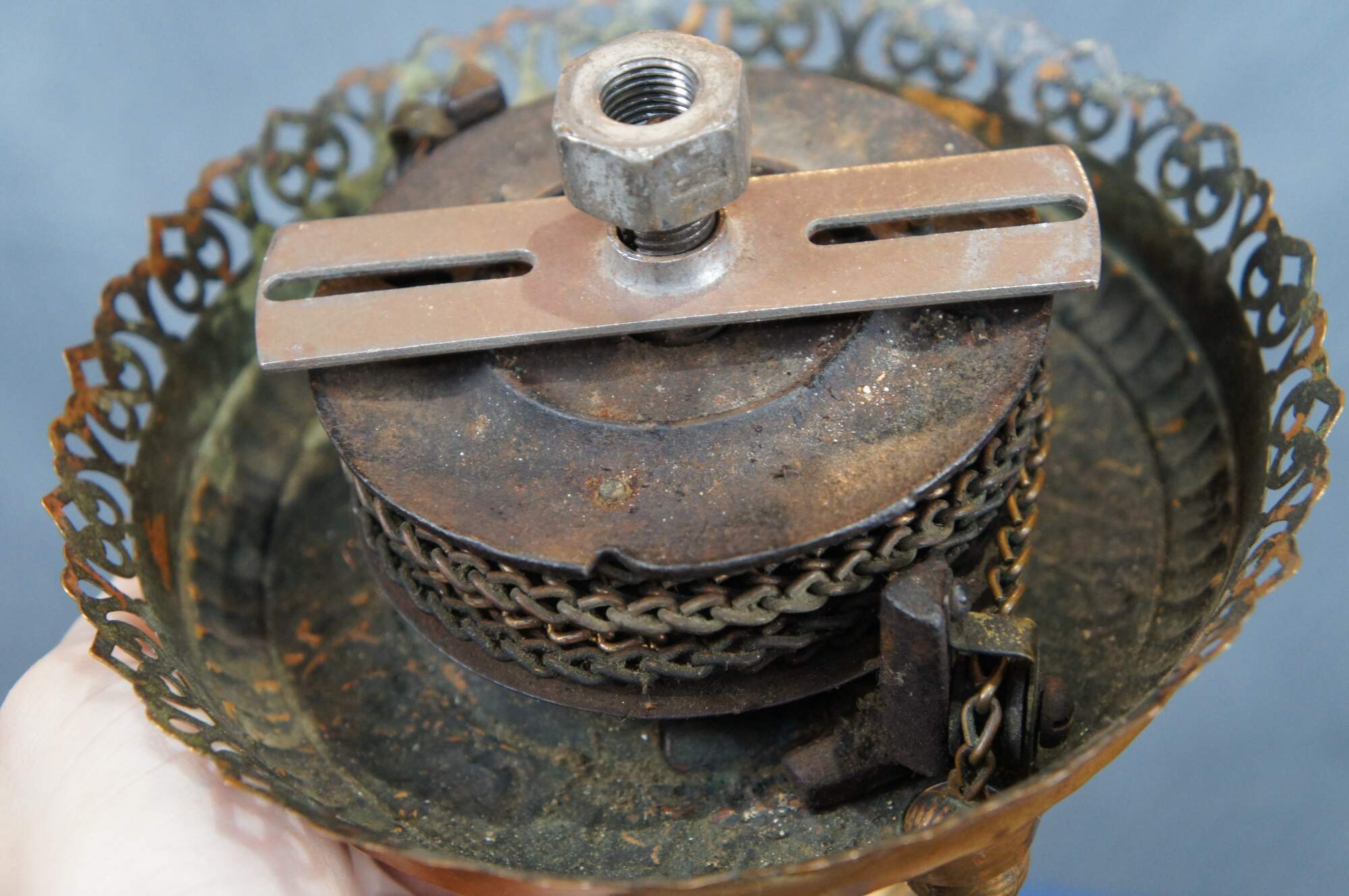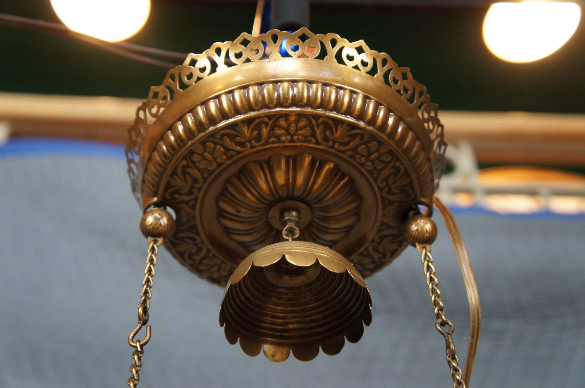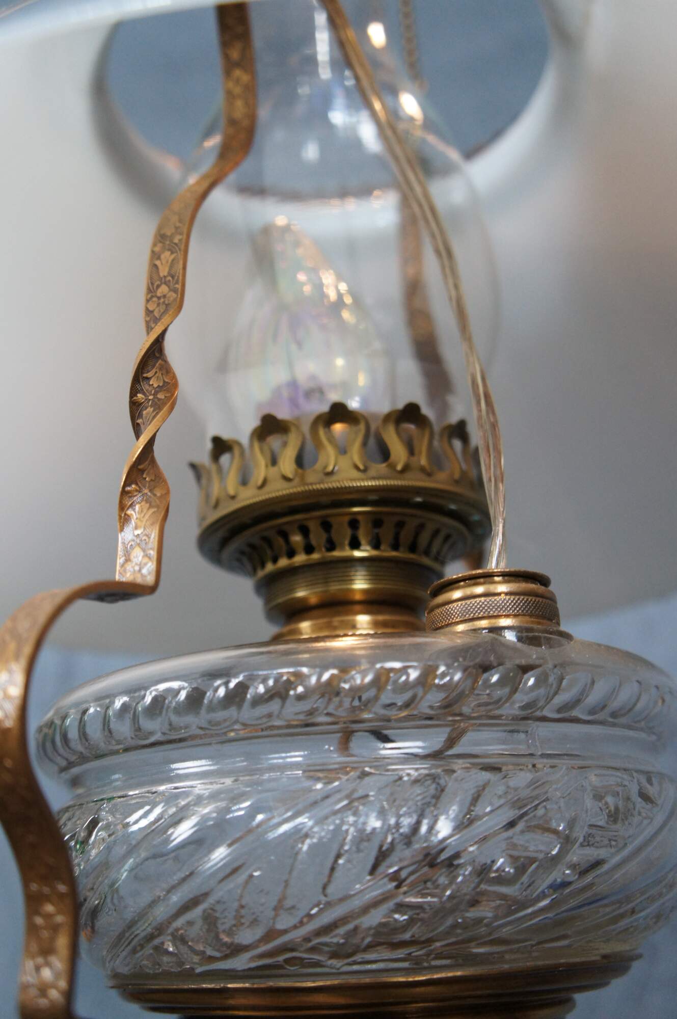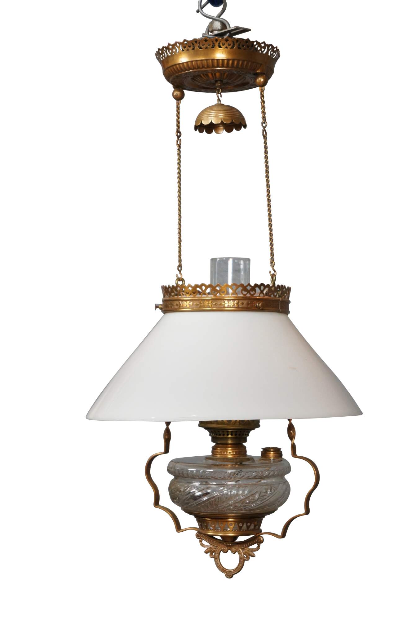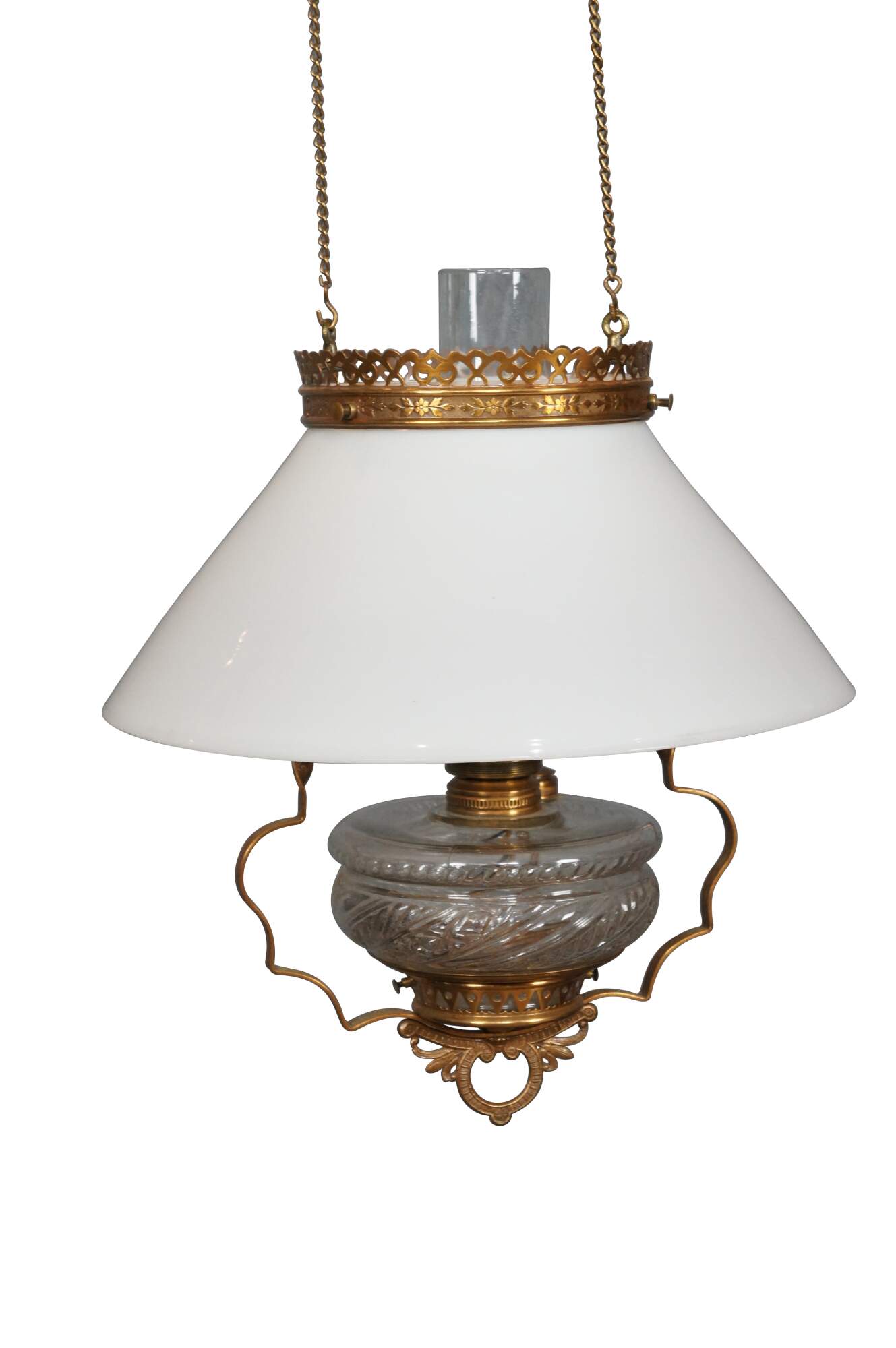 Antique late 19th century Aesthetic Movement cieling mounted parlor light / chandelier featuring pierced brass design with pressed glass oil reservoir, milk glass shade, clear hurricane and brass smoke bell. Suspends from cieling mount with two chains that can be pulled down or retracted up into the hidden spool / pulley to adjust the height - mechanism is fully functional. Originally oil but now converted to electric.