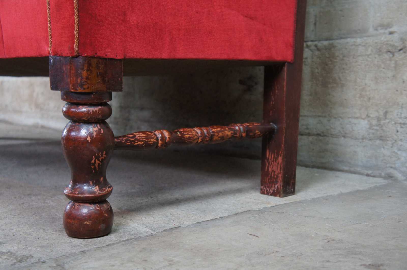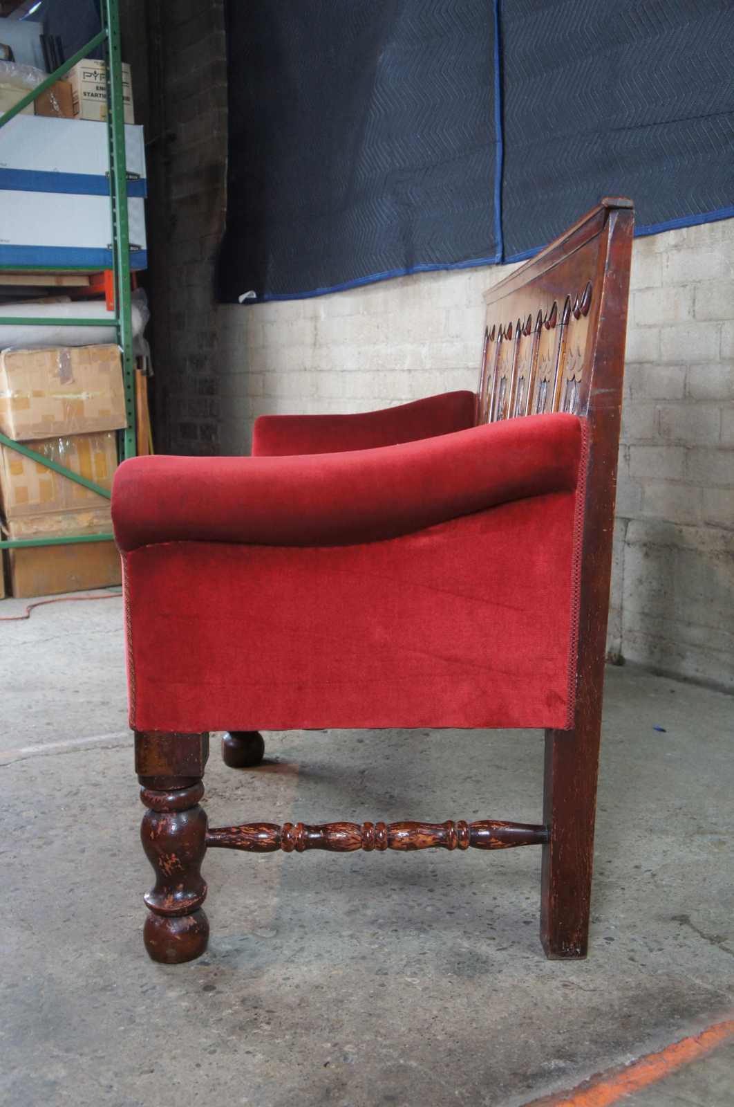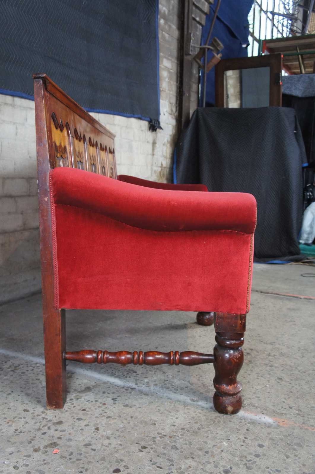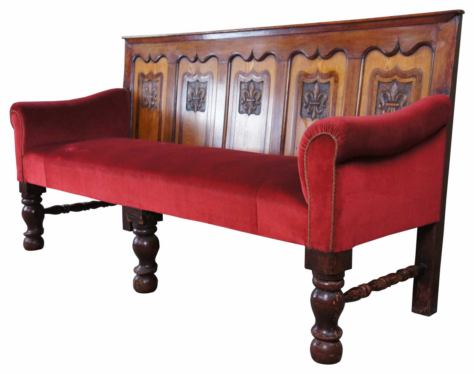 Extraordinary 18th century English oak pub bench or sofa. A rectangular form with high back and red velvet upholstery. Features Gothic revival panels and Fleur De Lis carvings. The bench is supported by robust turned bun feet. Origin London, England.